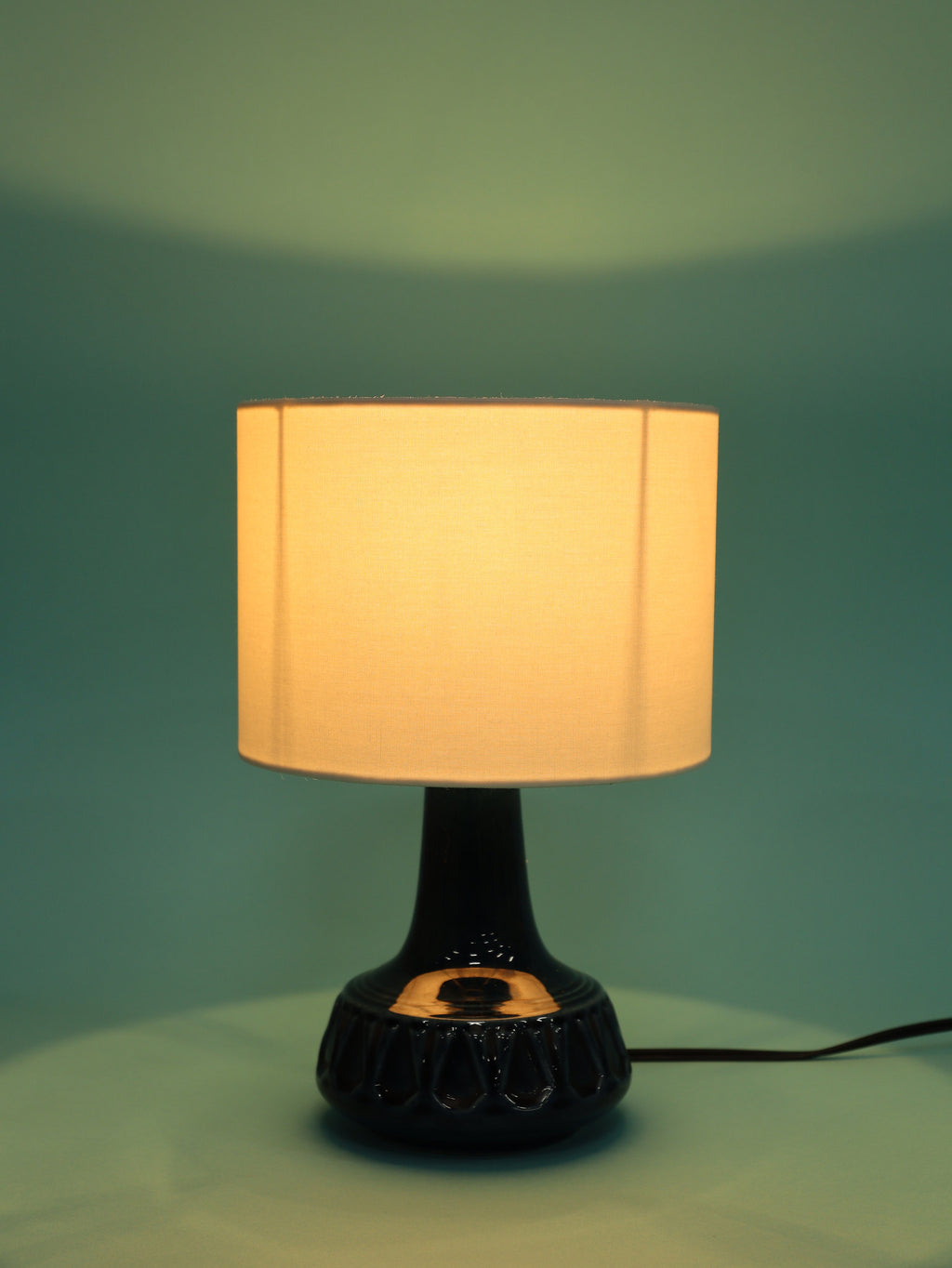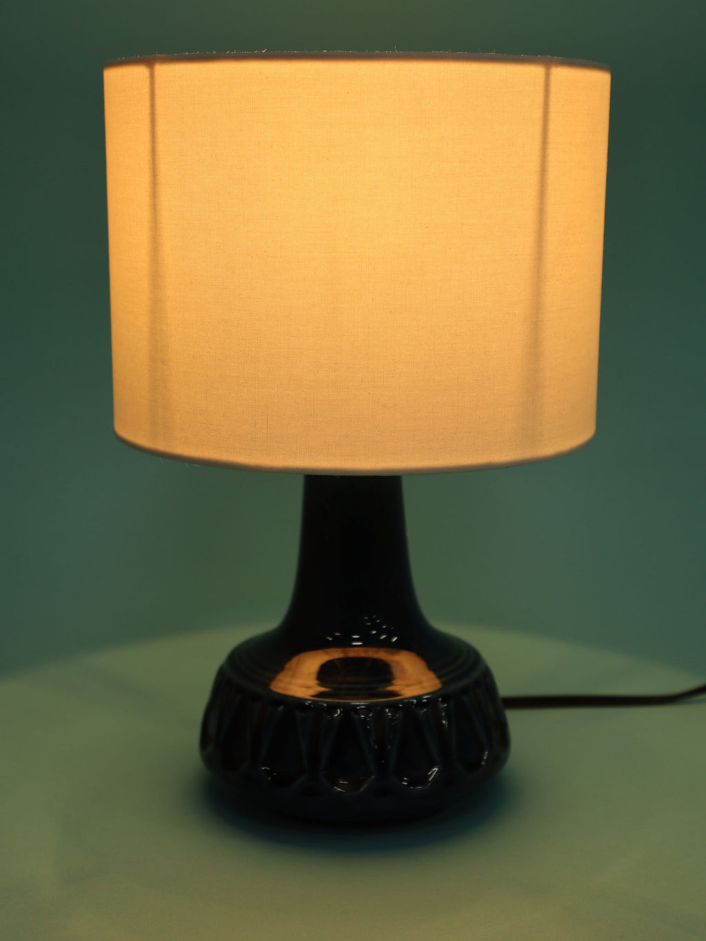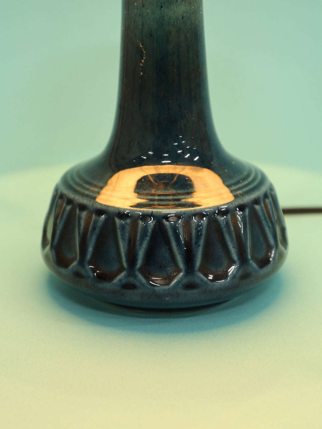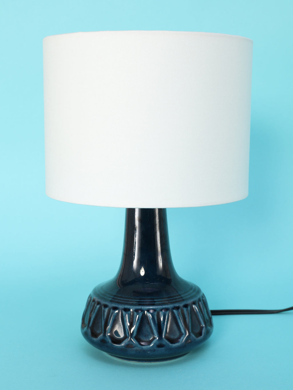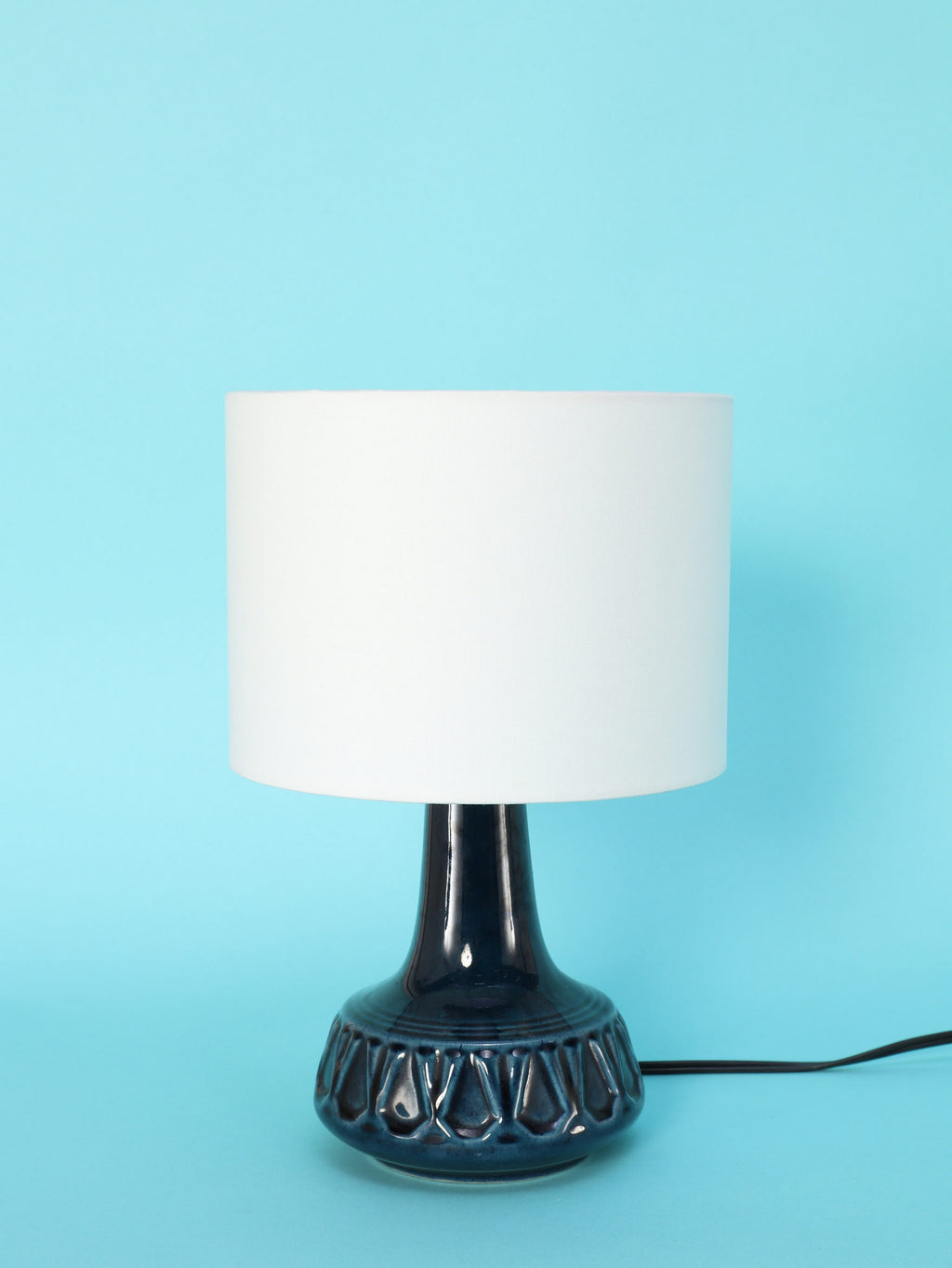 1960年代(推定)ミッドセンチュリー期にデンマークにて製作されたテーブルランプです。この時期、デンマークでは多くの窯元や陶芸家が独創的な陶器製のランプを制作しておりました。特に素朴で温かみのある陶器の素材感が特徴で、年月を経た現代でも多くの人の目を惹くモダンヴィンテージのひとつとなります。深く光沢のあるブルーの鮮やかな発色が唯一無二な存在感を放ち、非常に魅力的なデザインです。