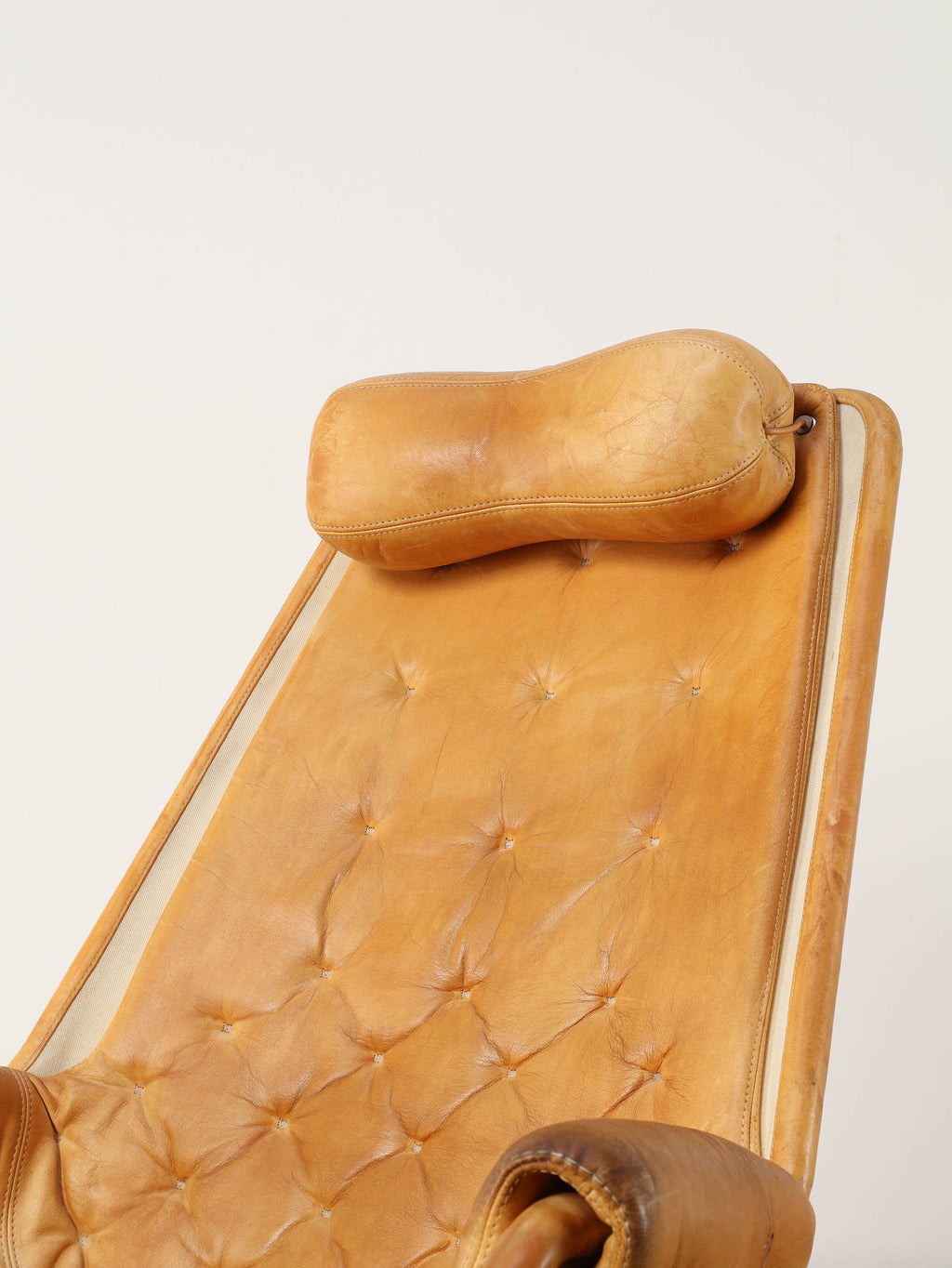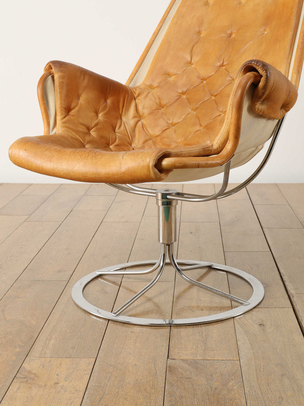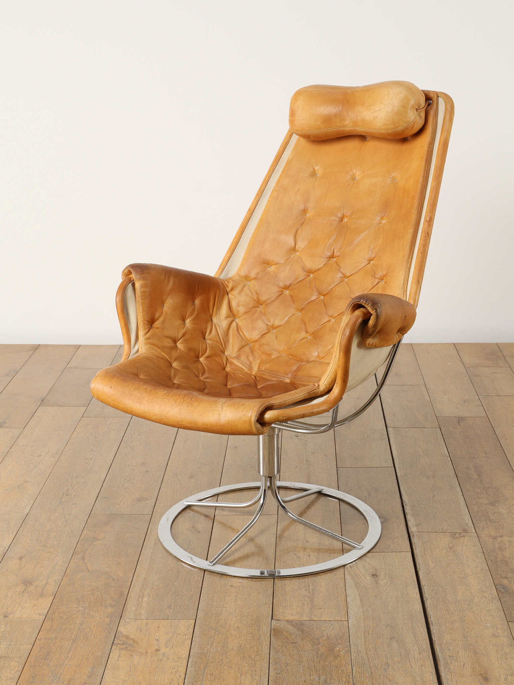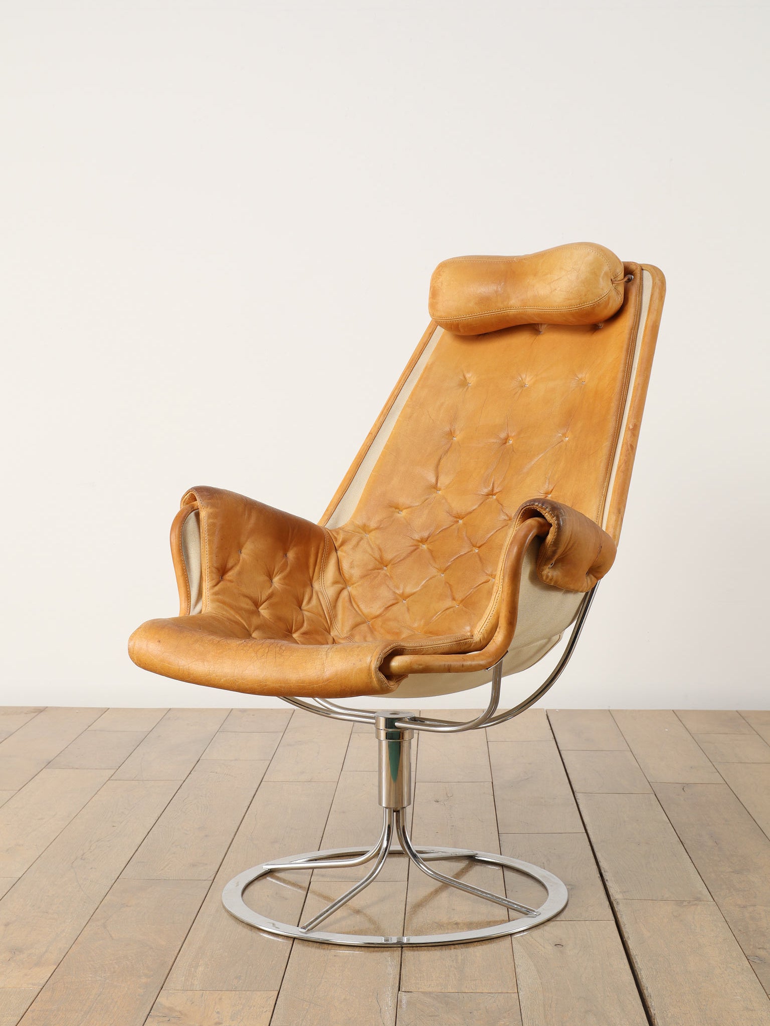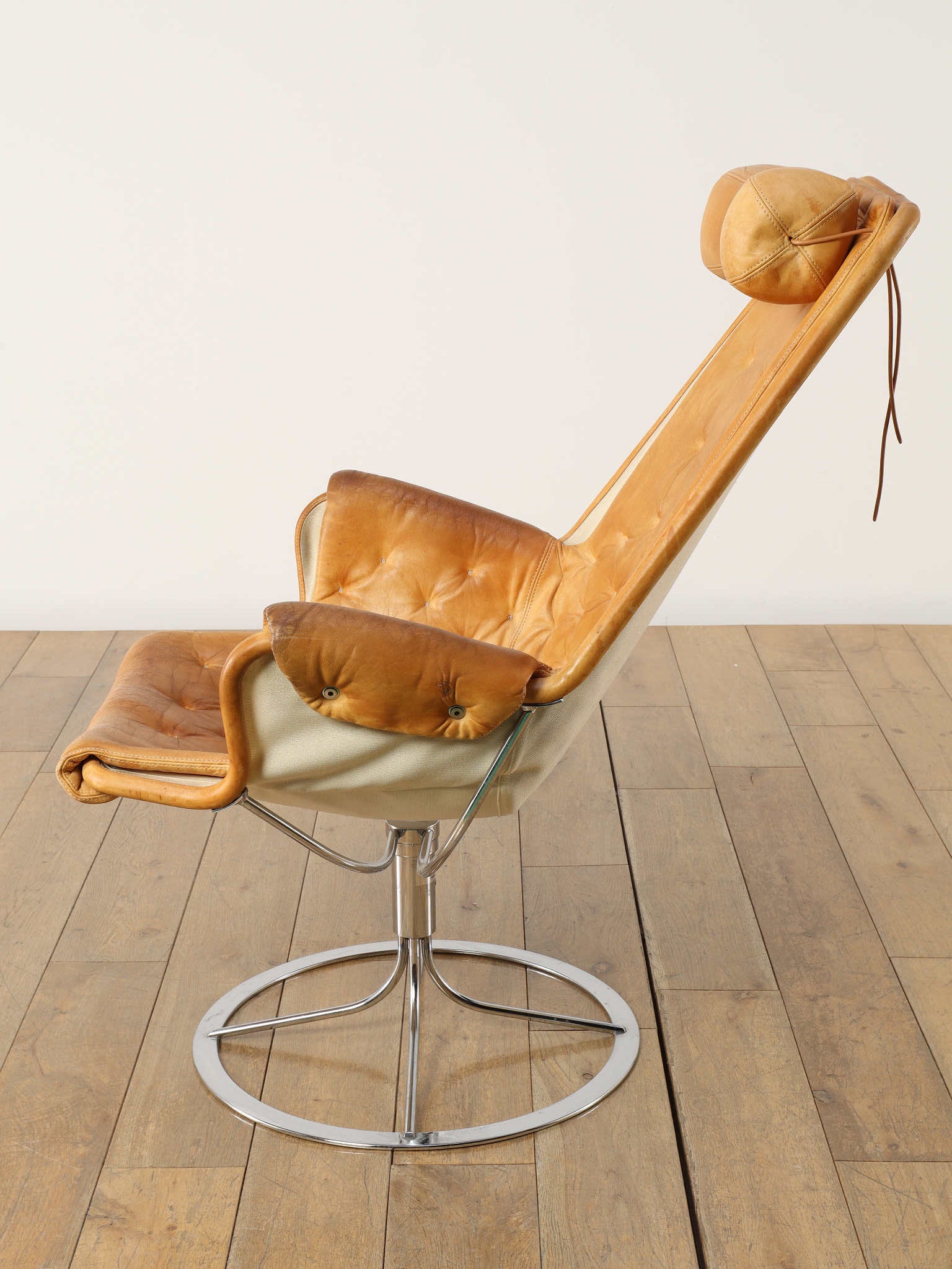 1980年代(推定)に製造されたアームチェアです。スウェーデンを代表するデザイナー、Bruno Mathssonによる、ミッドセンチュリーデザインを受け継いだ通称「JESTON」イージーチェアです。クロムメッキのアルミベースと、人間工学に基づいたハイバックの造形が、モダンで洗練された雰囲気を醸し出しています。座面と背もたれには、味わい深いコニャックレザーの経年変化におけるキャメル色の雰囲気が抜群であり、贅沢なボタン留めのキルティングが施されています。このレザーは、ヴィンテージらしい経年による風合いをそのままに、その歴史を感じさせる現在の姿でお届けします。ヘッドレスト付きのハイバックは、長時間座っても快適な優れた座り心地を約束します。