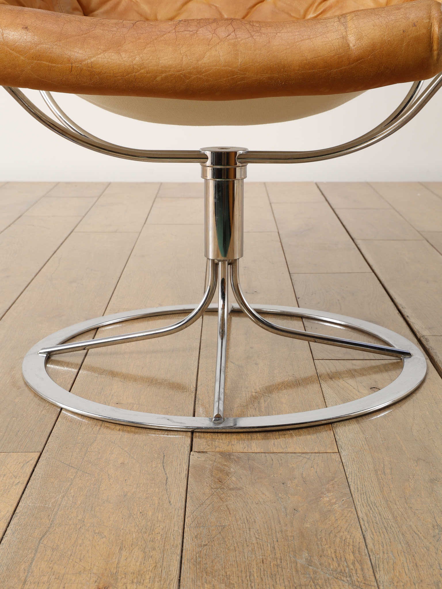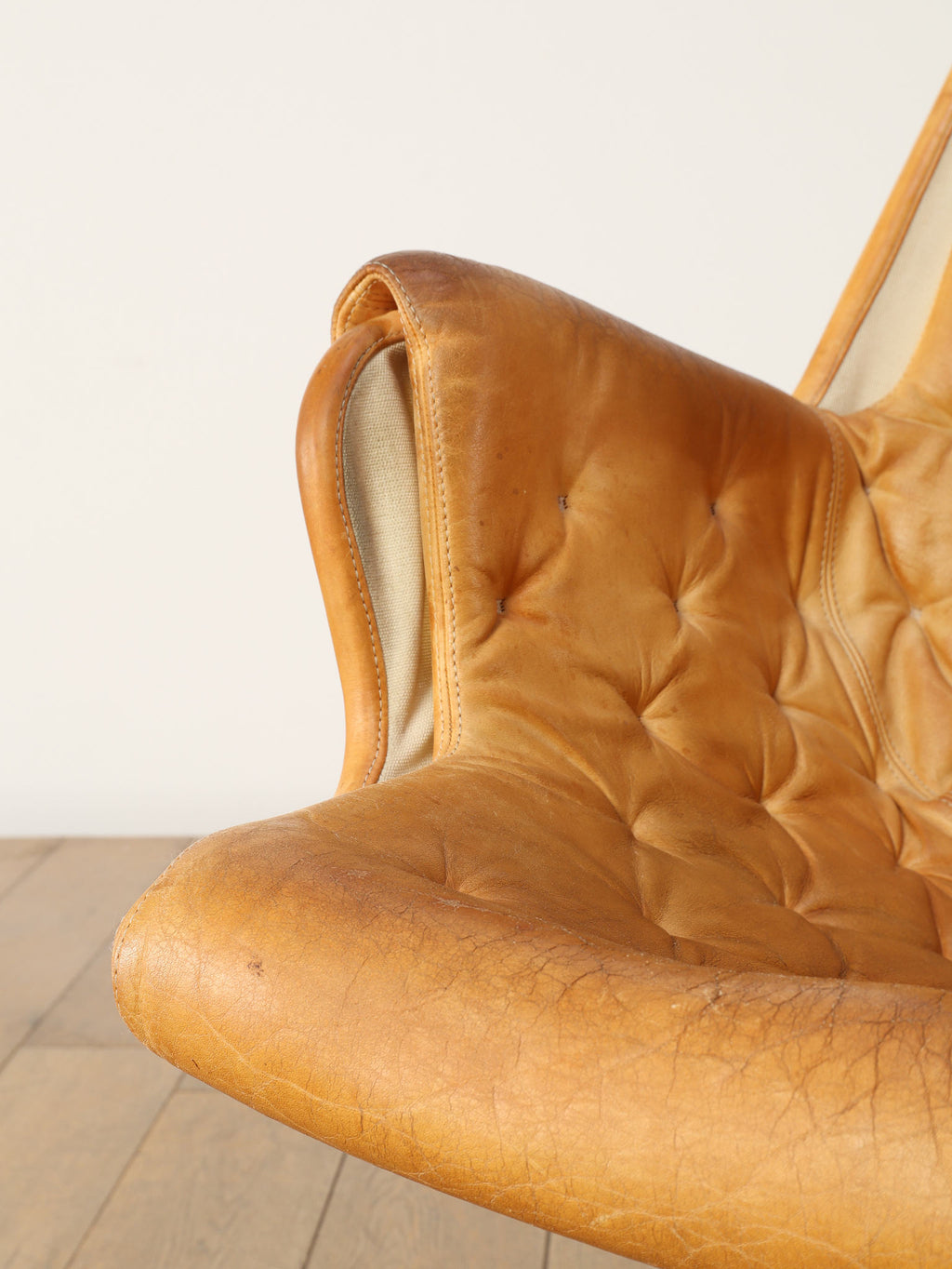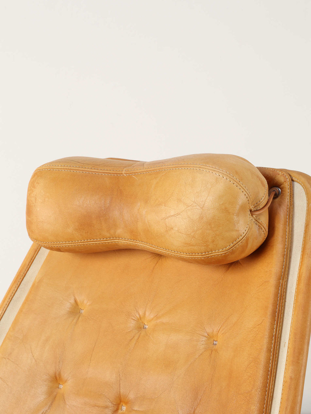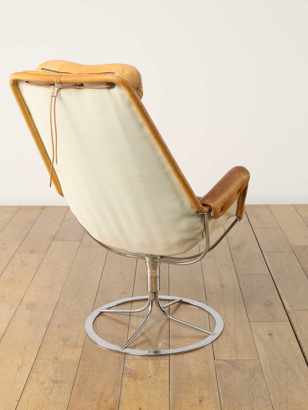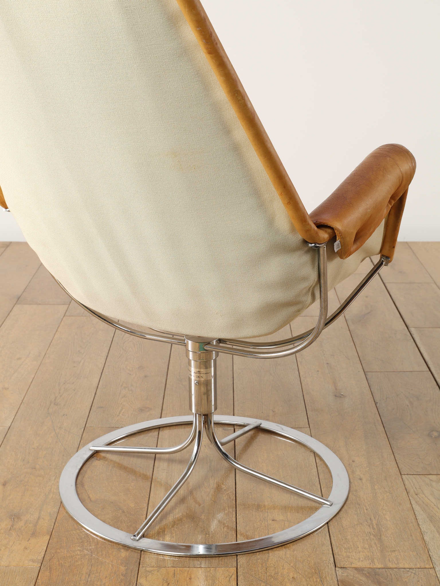 1980年代(推定)に製造されたアームチェアです。スウェーデンを代表するデザイナー、Bruno Mathssonによる、ミッドセンチュリーデザインを受け継いだ通称「JESTON」イージーチェアです。クロムメッキのアルミベースと、人間工学に基づいたハイバックの造形が、モダンで洗練された雰囲気を醸し出しています。座面と背もたれには、味わい深いコニャックレザーの経年変化におけるキャメル色の雰囲気が抜群であり、贅沢なボタン留めのキルティングが施されています。このレザーは、ヴィンテージらしい経年による風合いをそのままに、その歴史を感じさせる現在の姿でお届けします。ヘッドレスト付きのハイバックは、長時間座っても快適な優れた座り心地を約束します。