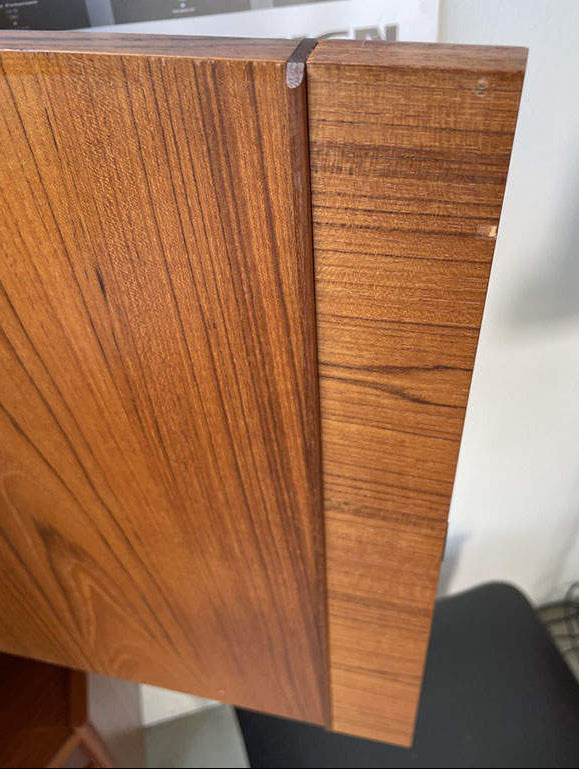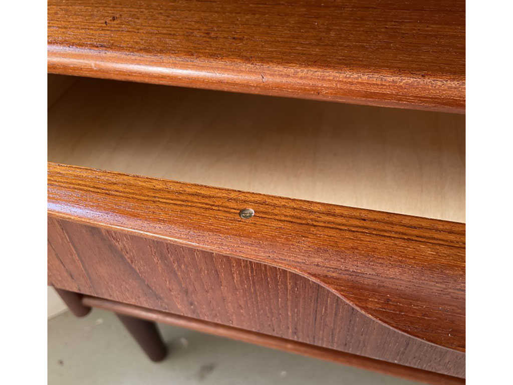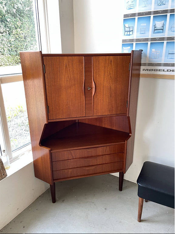 1960年代(推定)にデンマークで製造された、希少なチーク材のコーナーキャビネットです。このキャビネットの最大の魅力は、お部屋のデッドスペースとなりがちなコーナーに美しく収まる機能性とデザイン性の両立です。北欧家具らしいミニマルで洗練されたフォルムは、現代のモダンなインテリアにも違和感なく調和し、空間に温かいアクセントを加えます。素材には上質なチーク材が使用されており、年月を経て磨かれた温かい質感と美しい光沢が、格調高い雰囲気を醸し出しています。上段の扉収納と、使い勝手の良い3段の引き出しを備え、リビングやダイニングの収納力を高めながら、お気に入りの雑貨を飾るディスプレイ空間も提供します。
