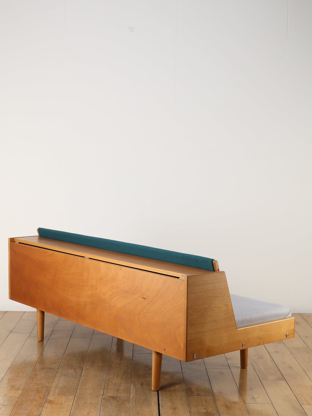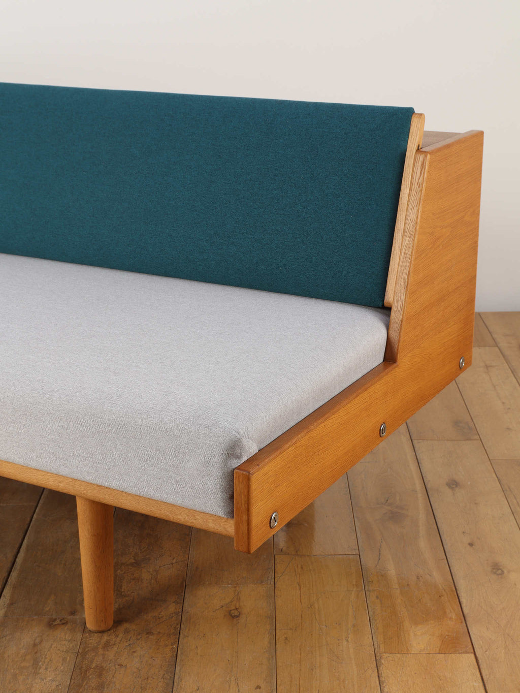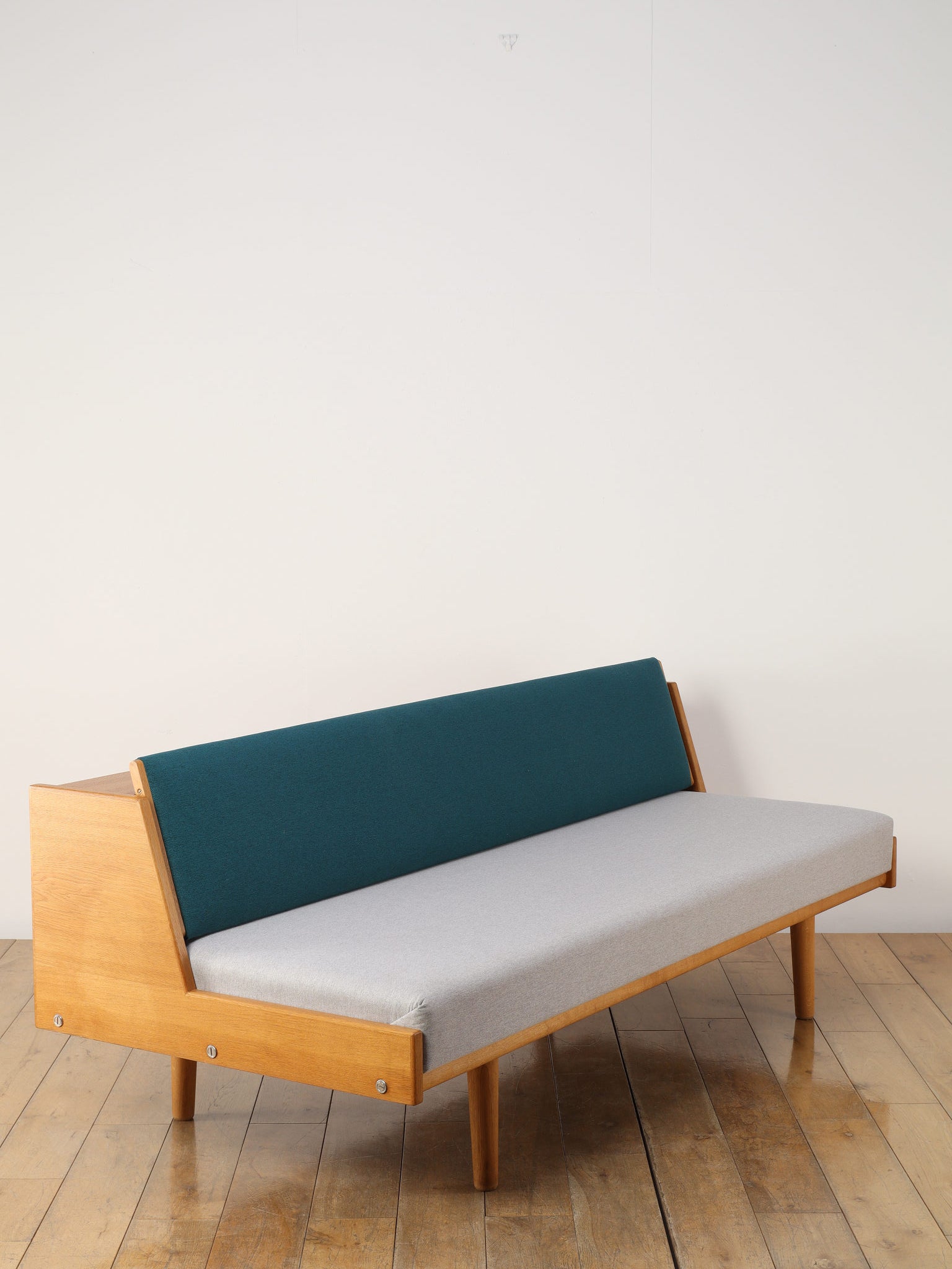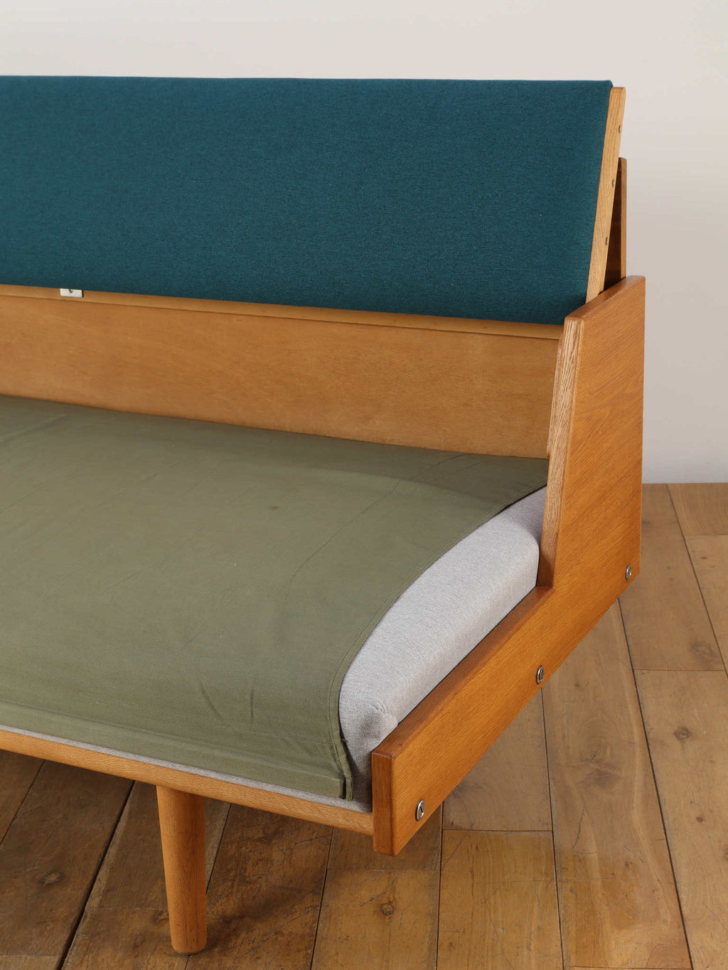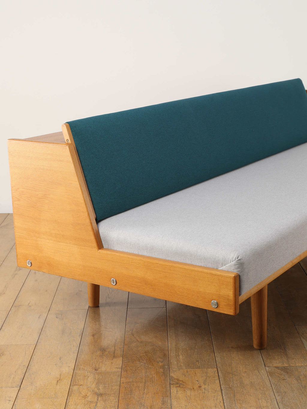 生涯で500種類以上の椅子をデザインし、20世紀の北欧デザイン界に多大な影響を与えたHANS.J.WEGNER(ハンス・J・ウェグナー)。代表作であるGETAMA社から発表されたデイベッドは年代問わず、幅広い世代に絶大な人気があります。学生寮向けにデザインされたと言われており、限られたスペースを有効活用できる多機能な家具として知られています。背もたれ部分が可動式になっており、オープンにすることでベッドとして使用が可能になります。また、この背もたれ裏には、一定の空洞スペースがあり、来客時に対応できる様ブランケットやクッションなどを収納可能です。こちらはオーク材の個体であり、人気の高さ故、近年では良いコンディションのものに出会うのも難しくなりつつある一台。名作と共に、日々の生活をお愉しみください。