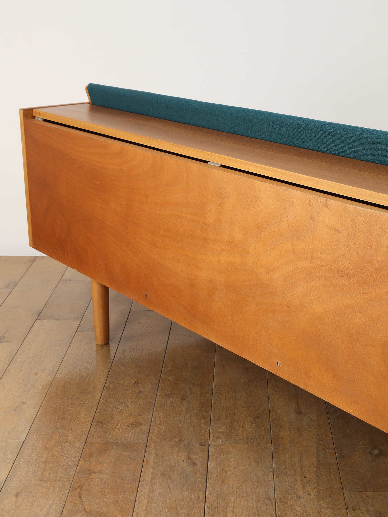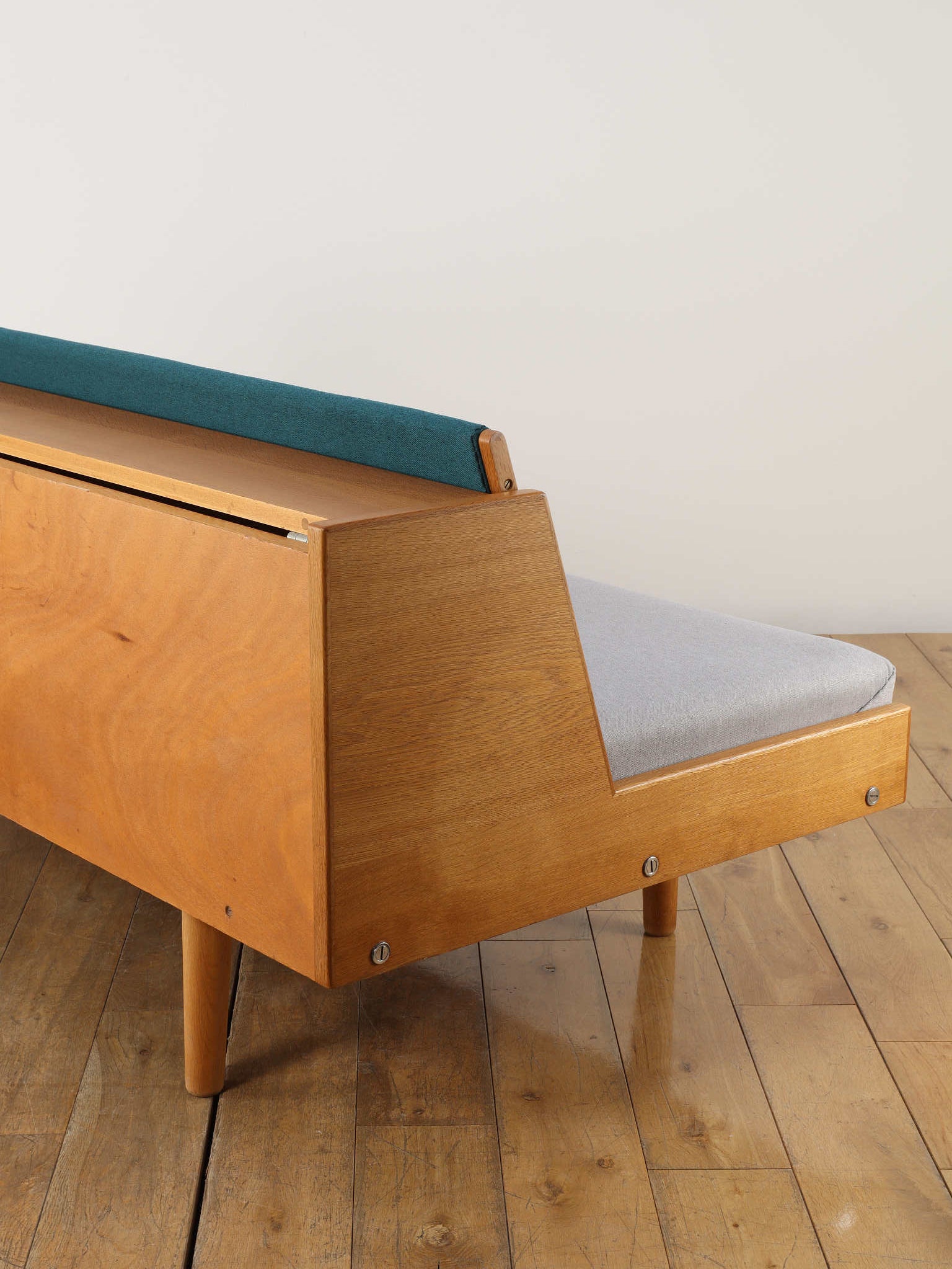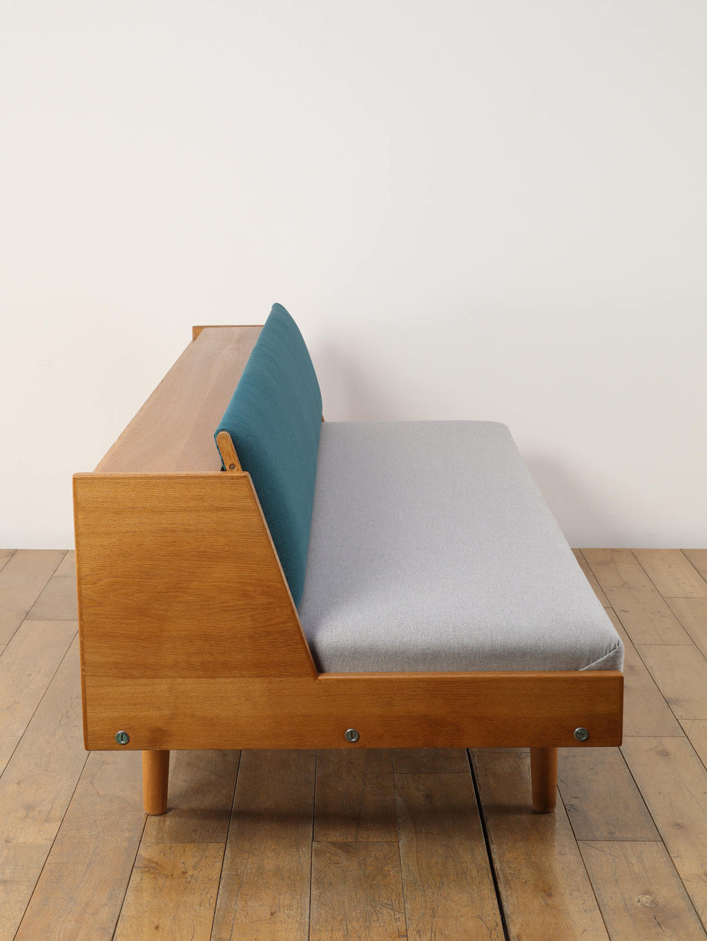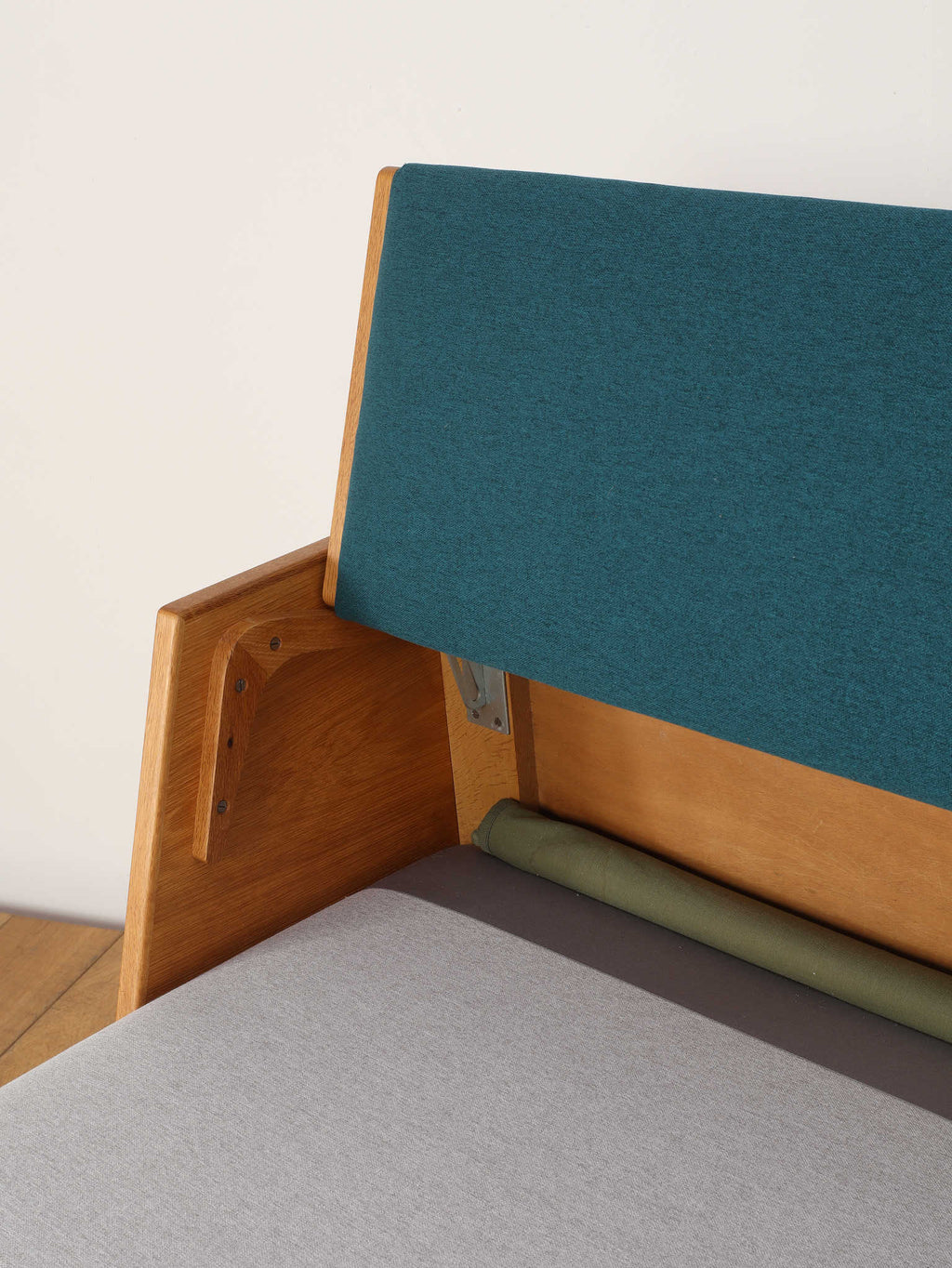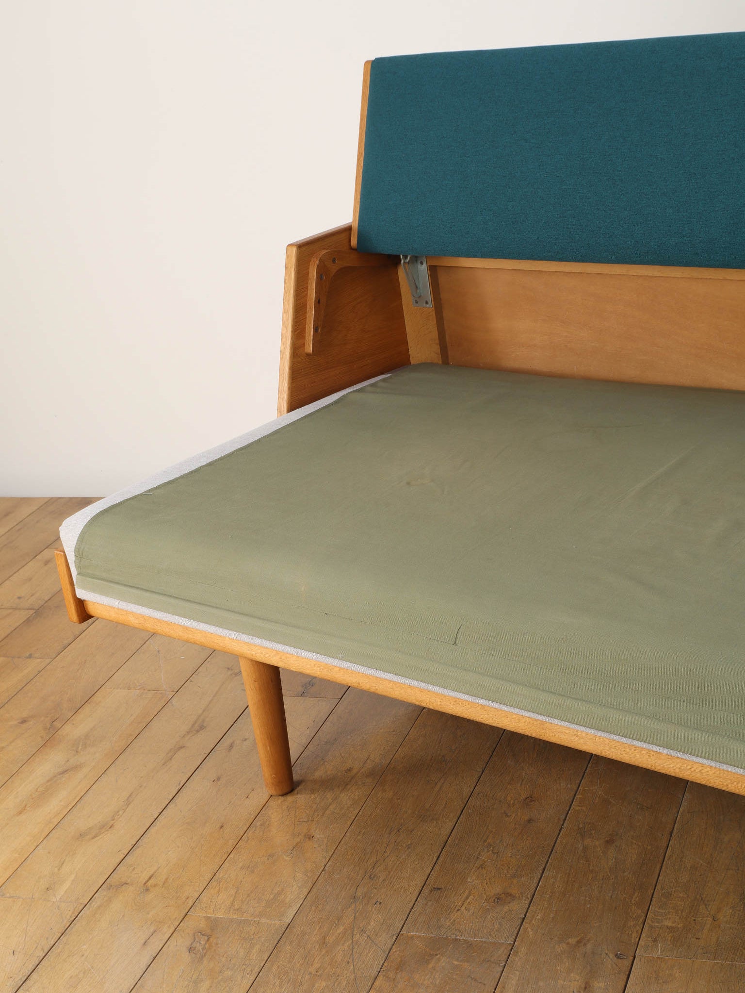 生涯で500種類以上の椅子をデザインし、20世紀の北欧デザイン界に多大な影響を与えたHANS.J.WEGNER(ハンス・J・ウェグナー)。代表作であるGETAMA社から発表されたデイベッドは年代問わず、幅広い世代に絶大な人気があります。学生寮向けにデザインされたと言われており、限られたスペースを有効活用できる多機能な家具として知られています。背もたれ部分が可動式になっており、オープンにすることでベッドとして使用が可能になります。また、この背もたれ裏には、一定の空洞スペースがあり、来客時に対応できる様ブランケットやクッションなどを収納可能です。こちらはオーク材の個体であり、人気の高さ故、近年では良いコンディションのものに出会うのも難しくなりつつある一台。名作と共に、日々の生活をお愉しみください。