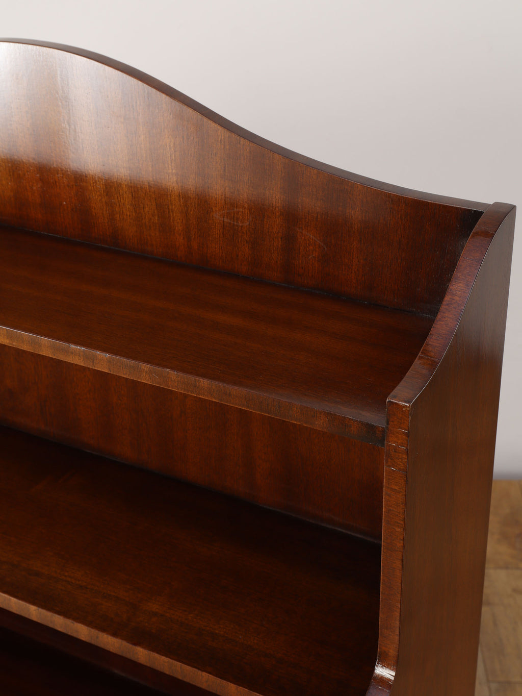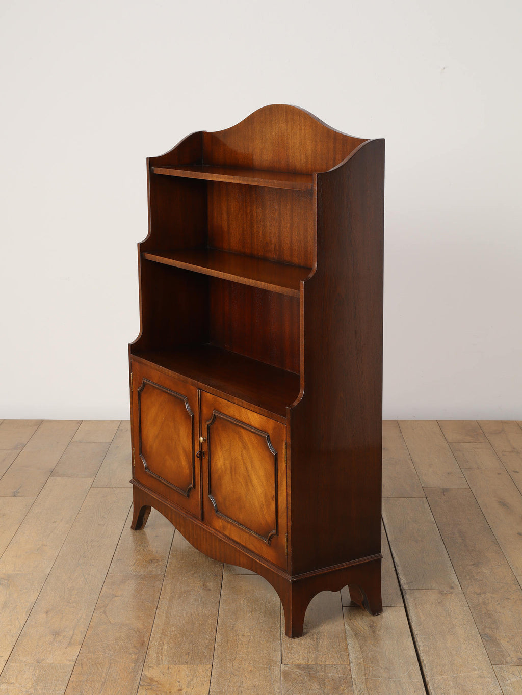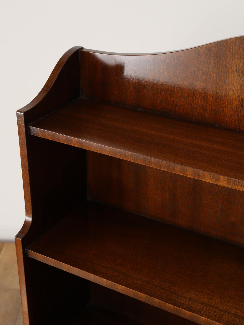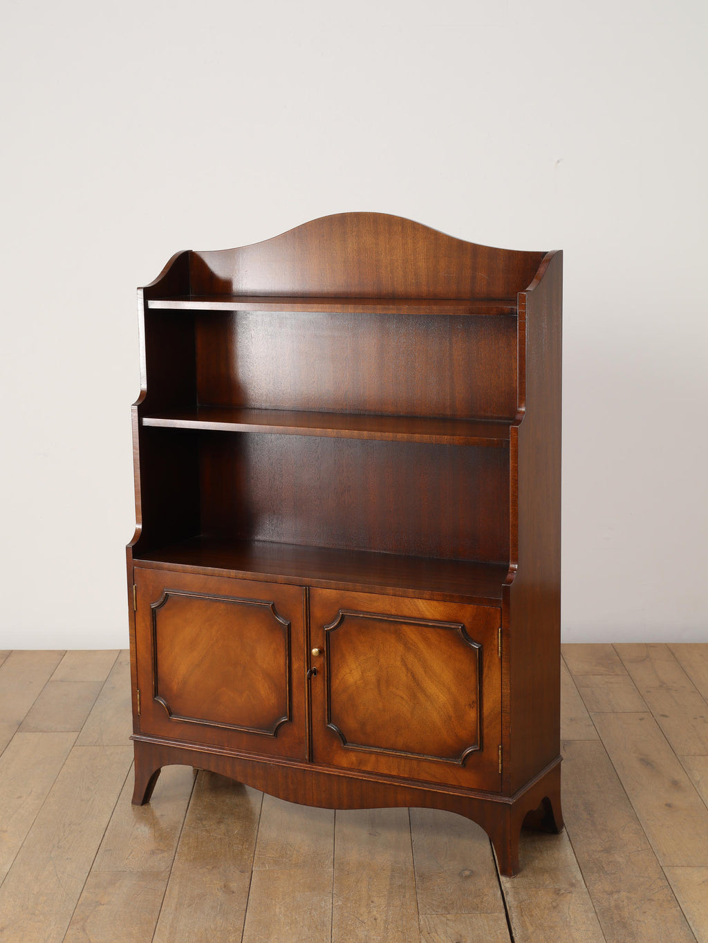 1930年代(推定)、英国アンティークの洗練を体現するアール・デコ様式のブックシェルフ。約100年の時を経たマホガニー材が醸し出す深い色艶は、単なる収納家具を超えた、歴史の重みを感じさせます。優美なカーブを描く天板や、装飾的な下部の扉など、過度な装飾を排しつつも品格を保つ普遍的なデザインは、現代のモダンなリビング空間にも違和感なく調和します。本棚としてだけでなく、飾り棚としても十分な存在感があり、お部屋の主役となる逸品です。