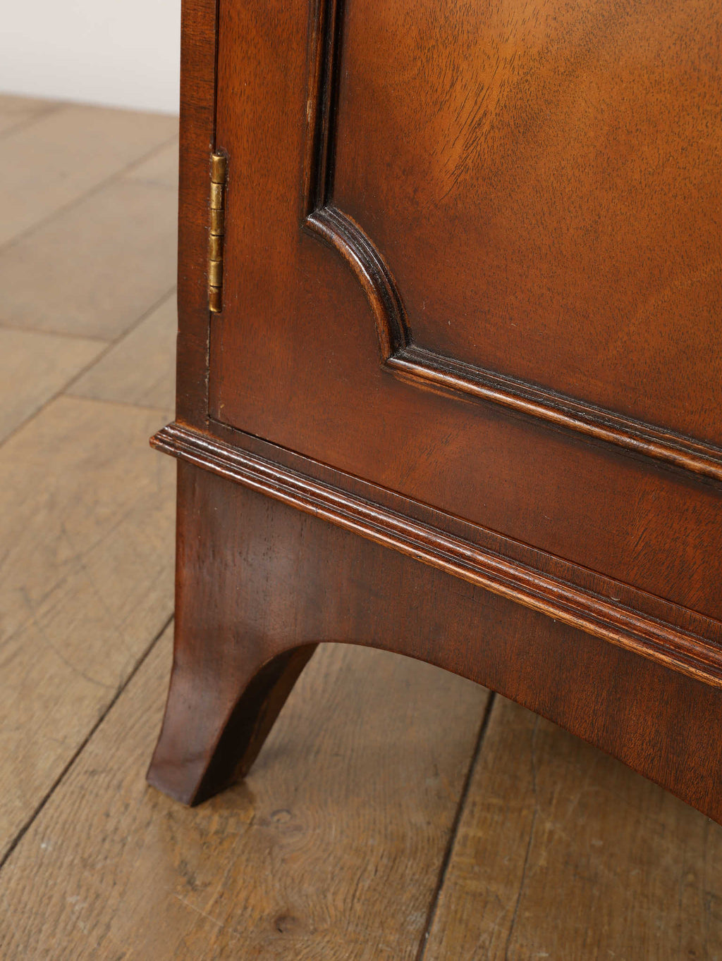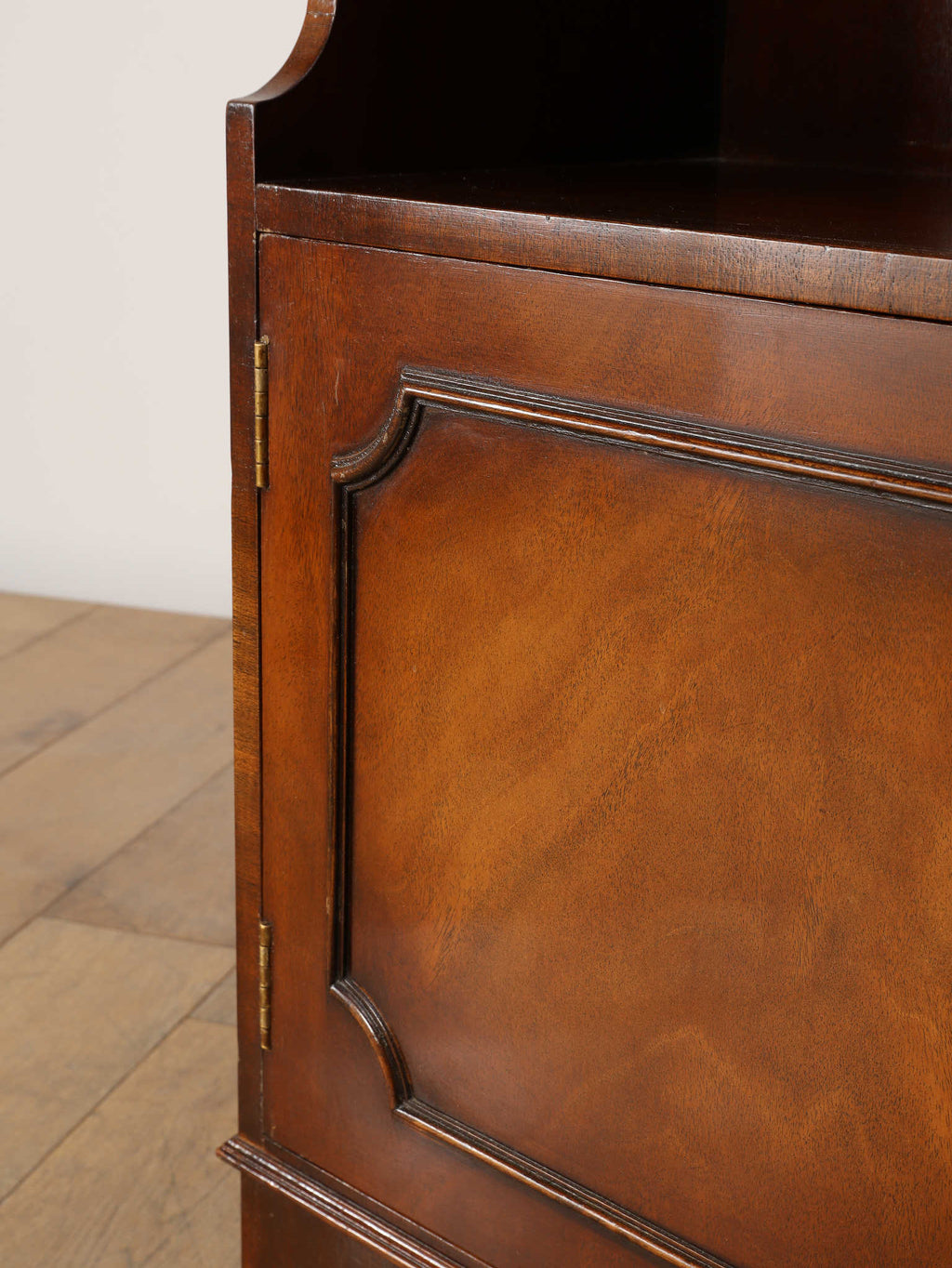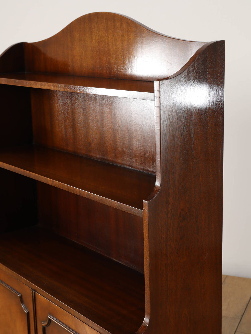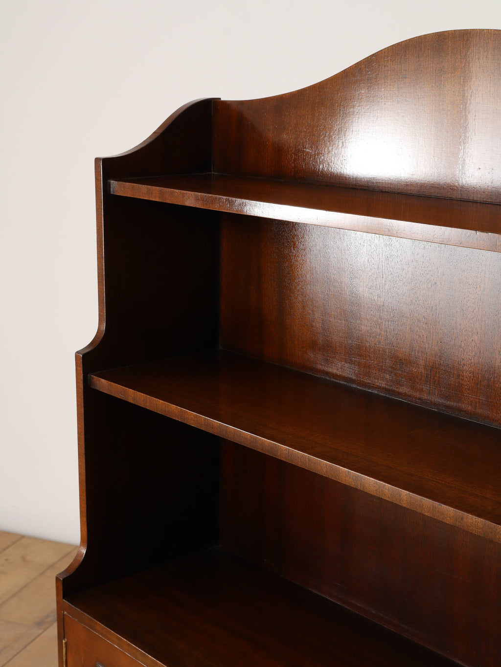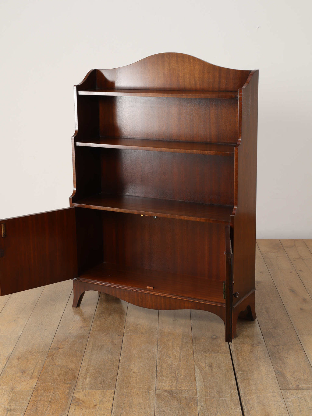 1930年代(推定)、英国アンティークの洗練を体現するアール・デコ様式のブックシェルフ。約100年の時を経たマホガニー材が醸し出す深い色艶は、単なる収納家具を超えた、歴史の重みを感じさせます。優美なカーブを描く天板や、装飾的な下部の扉など、過度な装飾を排しつつも品格を保つ普遍的なデザインは、現代のモダンなリビング空間にも違和感なく調和します。本棚としてだけでなく、飾り棚としても十分な存在感があり、お部屋の主役となる逸品です。