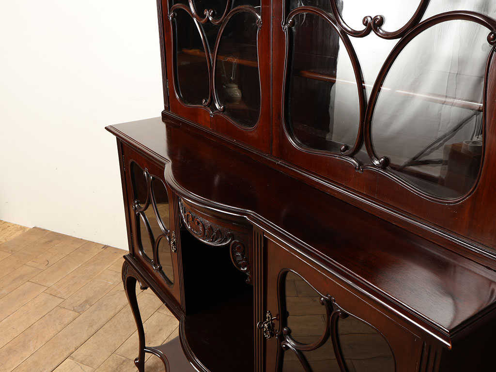 1900年代(推定)英国製のディスプレイキャビネットです。 素材にはマホガニー材が贅沢に使用され、その深く艶やかな赤褐色が、空間に静謐な格調高さをもたらします。この家具の最大の魅力は、ガラス扉に施された芸術的な装飾です。植物の蔓のように有機的で流れるような曲線美は、中のディスプレイを絵画のように縁取り、見る人の視線を惹きつけます。足元は優雅な猫脚と、繊細な下棚で構成されており、背の高い家具でありながらも圧迫感を感じさせない、軽やかで洗練されたシルエットを実現しています。リビングやダイニングの主役として、大切なコレクションを美しく収納し、英国貴族の邸宅のような優雅な時間を演出してくれるアンティーク家具です。