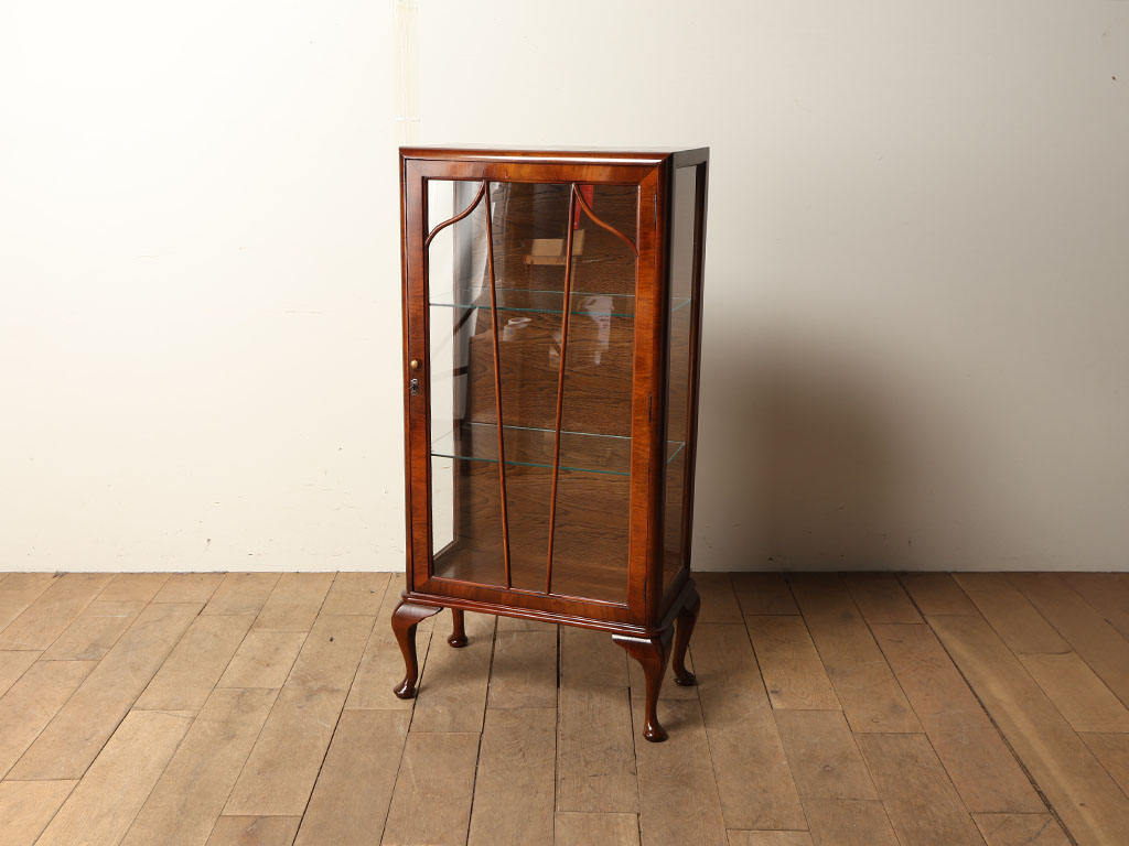 英国アンティークのチャイナキャビネット。かつてボーンチャイナ(白磁器)を収納していた事に由来し、英国のキャビネットはこのような名前で呼ばれる事が多くあります。左右の側板はガラスによって仕上げられ、中に収納したものがより美しく見える効果があります。様々なデザイン、サイズが存在し、ものを飾る文化が色濃い英国アンティークならではの家具と言えます。こちらはW620mmと、大変小振りなサイズ。キャビネットの中でも人気の高いサイズです。横幅が短くなると、扉も片扉になりよりすっきりと印象になる点もポイント。左右からの見え方も考えると、家具の両スペースにもゆとりを持たせたいところ。お気に入りのコレクションを美しく見せてくれます。軽やかで可愛らしい印象の脚部も素敵です。