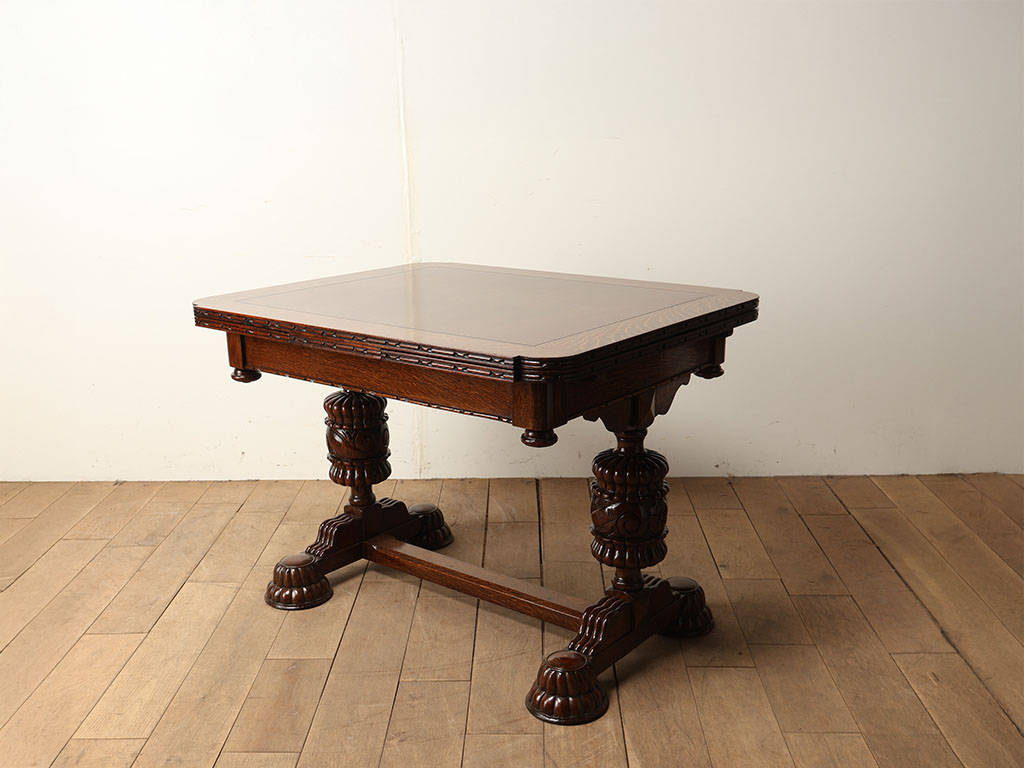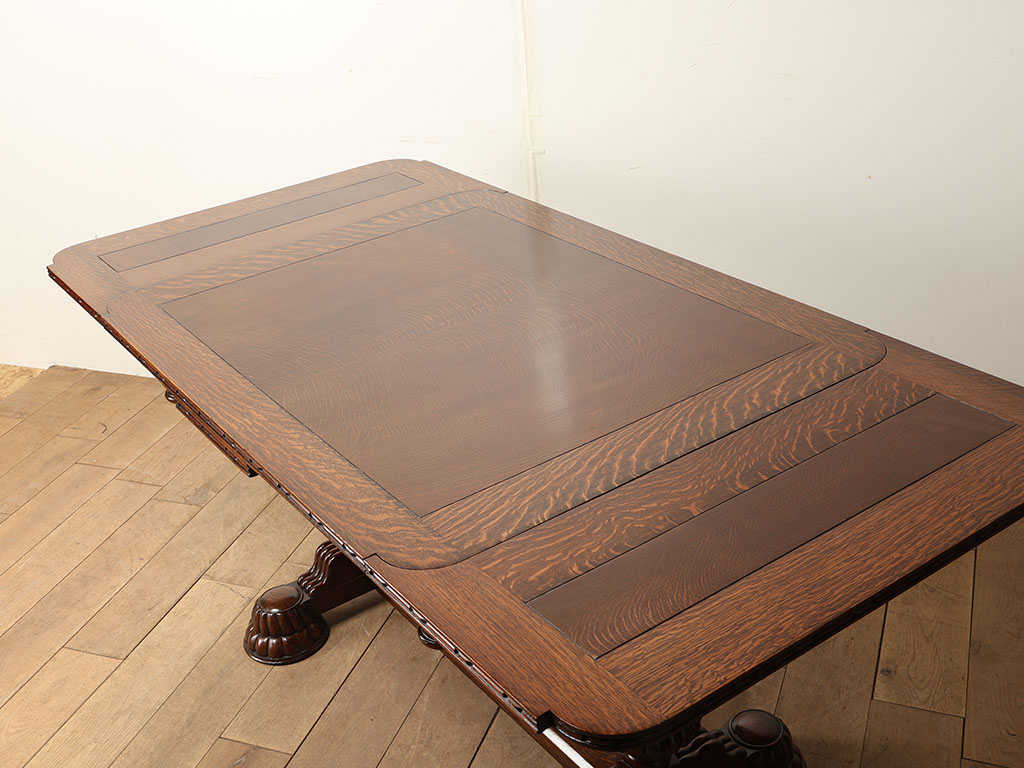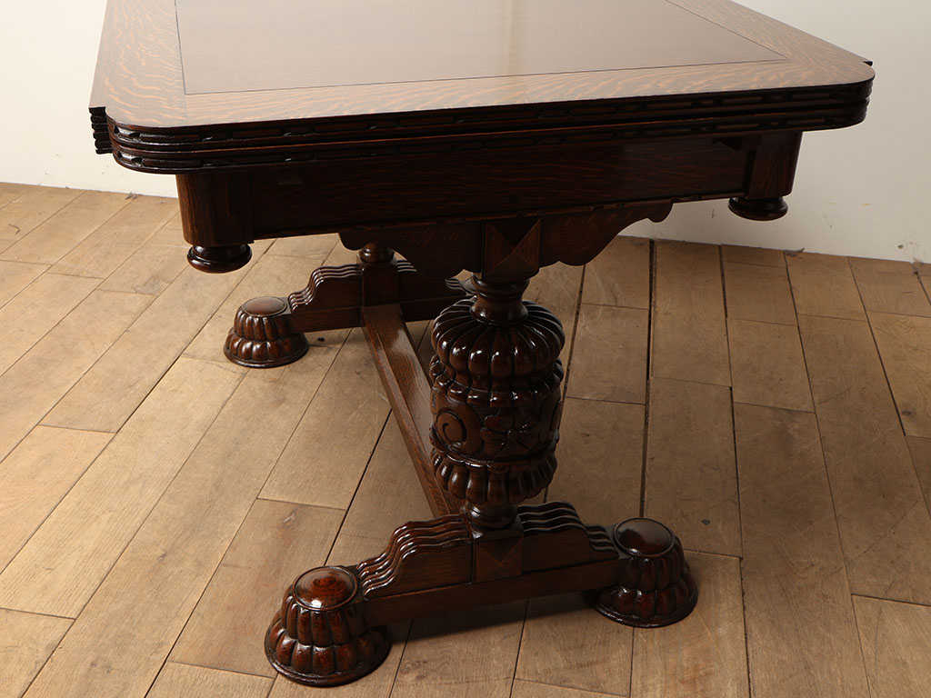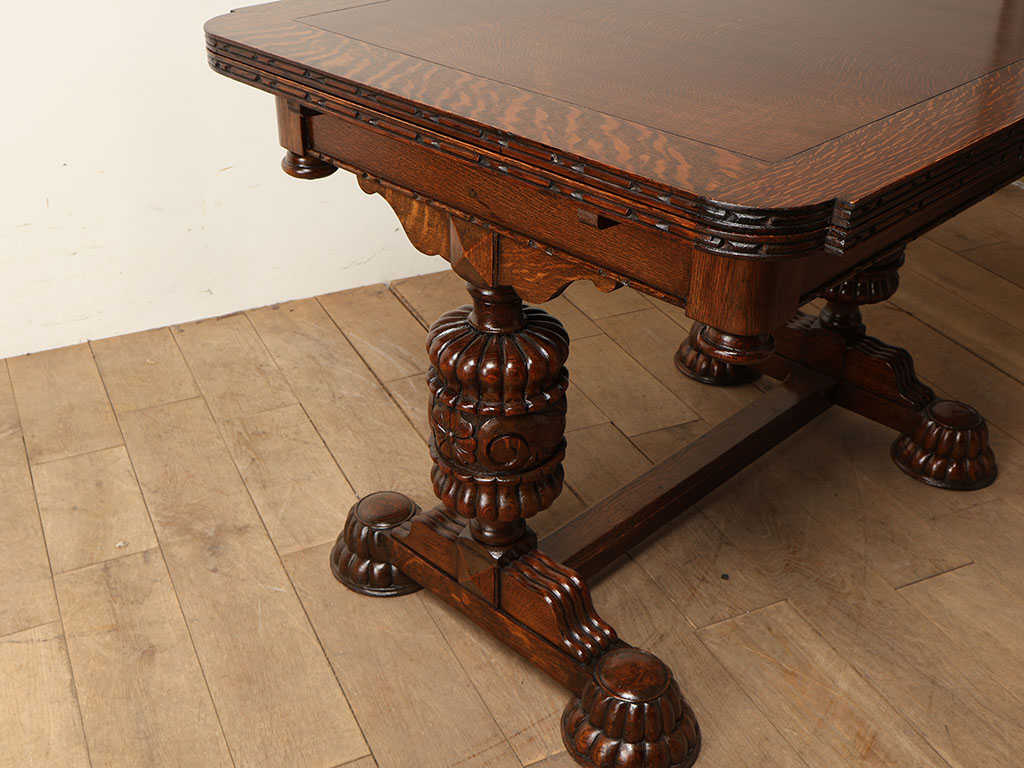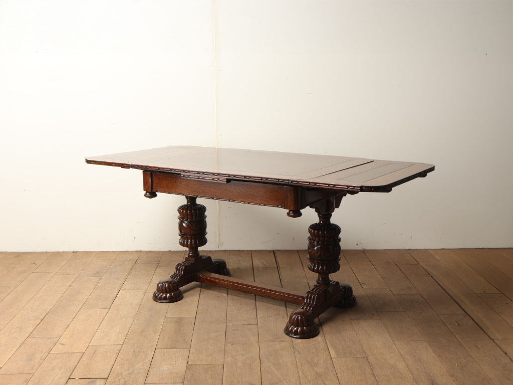 英国アンティークを代表する家具であるドローリーフテーブル。メインの天板の下に収納されたサブの天板を引き出すことで、サイズが変わる機能を備えた伸長式のテーブルです。左右それぞれに拡張する天板が備わっておりますが、片方だけ伸ばしても天板のレベルがフラットになり、3段階のサイズ調整が可能です。16世紀頃にこの構造を備えた大きなサイズのテーブルが流行しましたが、一度ダウントレンドを辿ります。その後、19世紀頃に都市部の人口増に伴い、生活空間が狭くなった環境の変化から再度この構造が見直されたことにより、小さいサイズのものがリバイバルされ、多くのテーブルが生産されました。900mmの正方形がスタンダードなサイズであり、その適度なサイズと取り回しのしやすさが現代の住環境にマッチし、アンティークの定番として現在に至ります。素材は堅牢なオーク材が用いられる事が一般的であり、デイリーでお使い頂くことでより味わいが増していく点においても、アンティークを使用する楽しみを感じて頂けることでしょう。脚部は大きく4本脚のタイプと「H型」の2本脚タイプに分類され、チェアの合わせ方や空間のレイアウトに合わせてそれぞれのメリットをセレクトする事が可能です。こちらの2本脚のタイプは4本脚タイプと異なり、チェアを2脚並べ向かい合わせに配置することが可能です。スペースを効率よく使用する事ができます。また伸長時にチェア間の間隔において自由なポジションにチェアを合わせる事が出来、快適にお使い頂けることでしょう。パイナップルレッグと呼ばれるコブのようなデザインは、英国アンティークの伝統的なデザインであり、全体の印象を大きく左右する要素の一つです。様々なデザインが存在するため、一点物との出会いの楽しみが詰まったテーブルと言えるでしょう。こちらは大変装飾性に富んでおり、英国アンティークの魅力を存分にお楽しみ頂けます。まるで映画のワンシーンに出てくるような逸品を、日々のダイニングに取り入れてみてはいかがでしょうか。