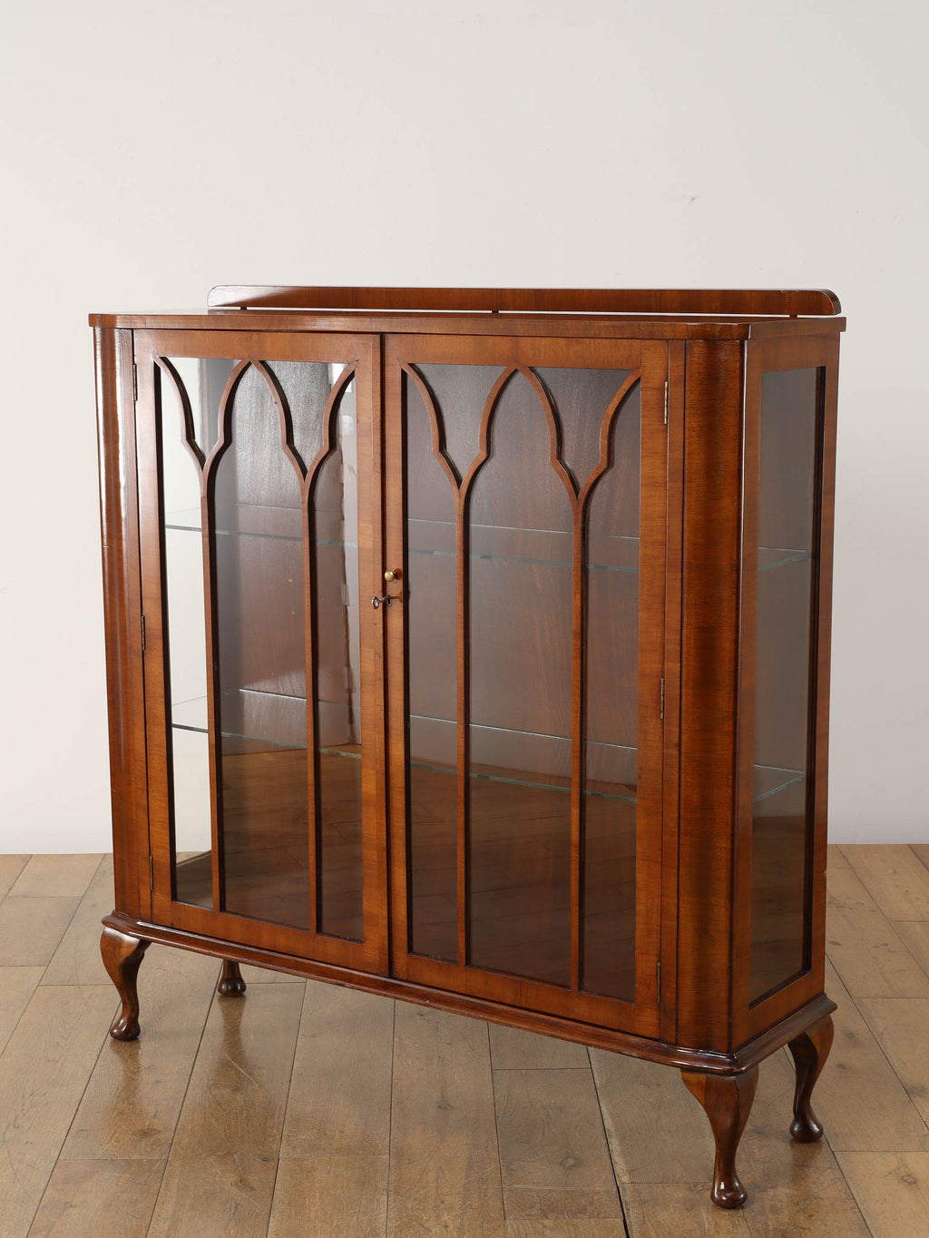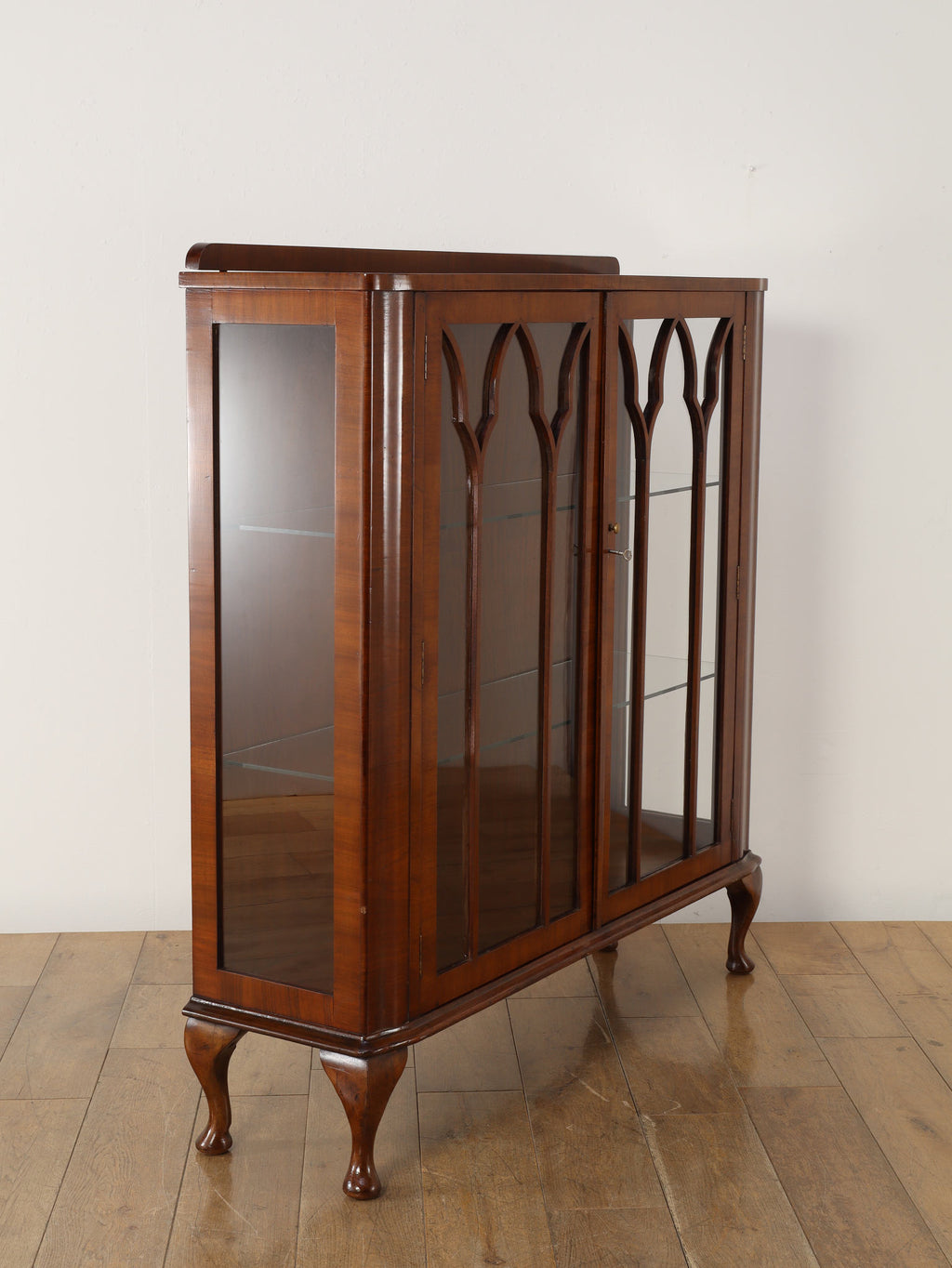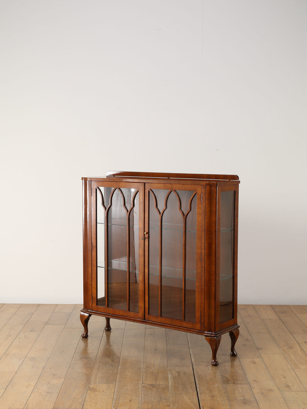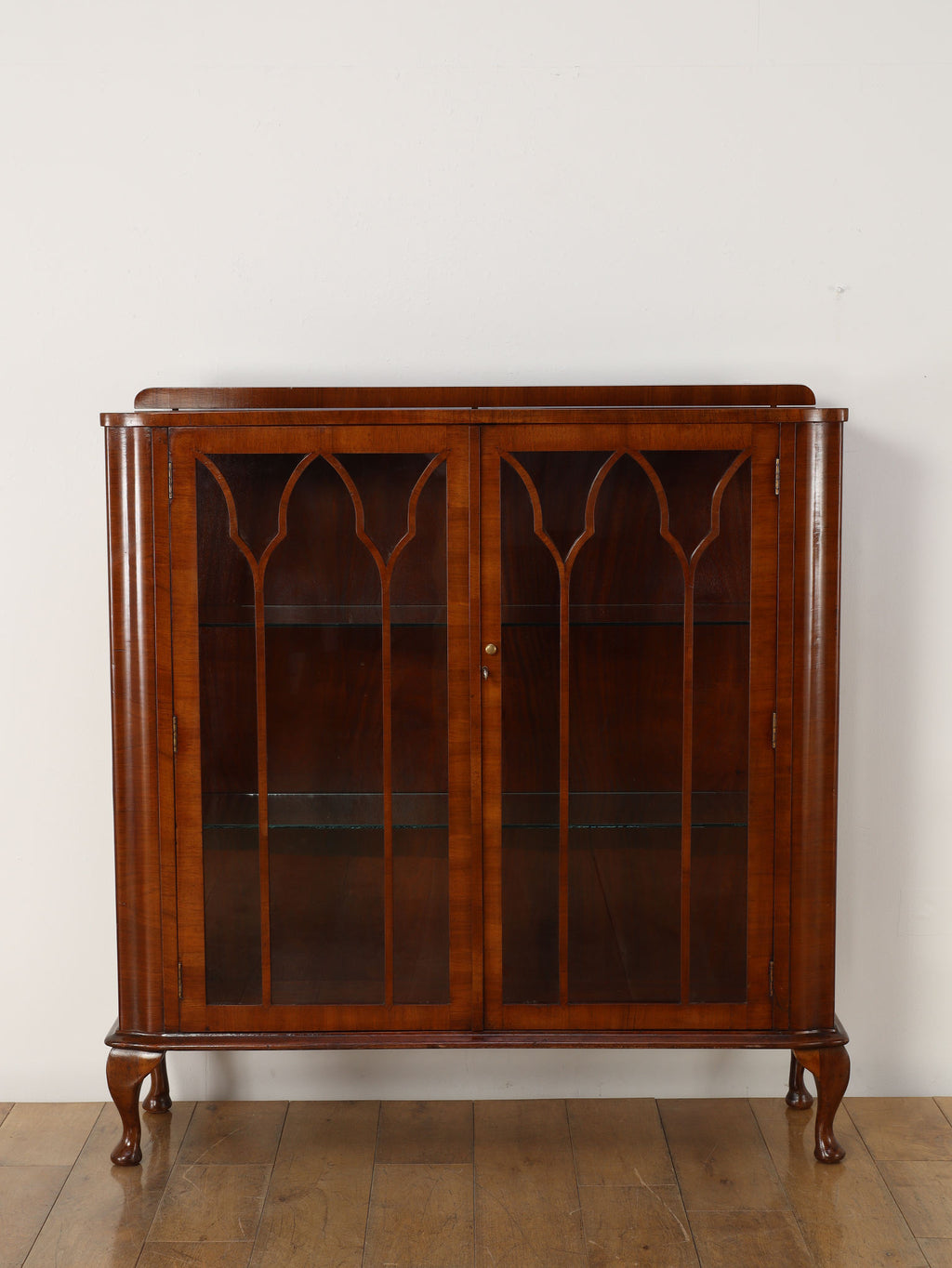 実用性と美学を両立させるために愛用された家具として親しまれてきたチャイナキャビネット。緻密で美しい縞模様が特徴的なウォルナット材が使用されており、光の加減によりその豊かな杢目が楽しめます。直線的なデザインに対し滑らかな猫脚が映え、アンティークならではの古き良き風合いが感じられます。また、扉のガラスに施された尖頭アーチのような意匠が美しく、空間を格調高く見せてくれるでしょう。