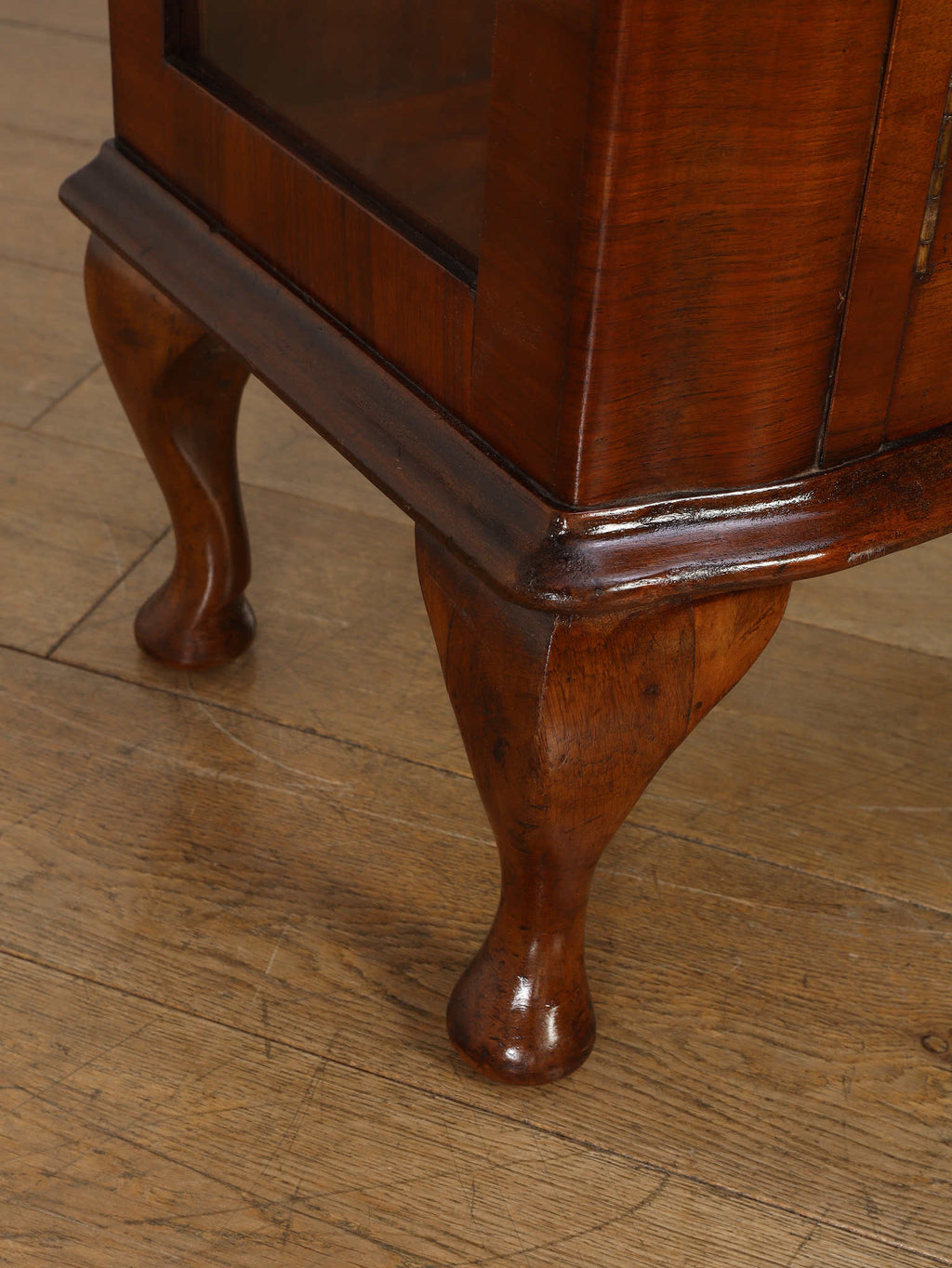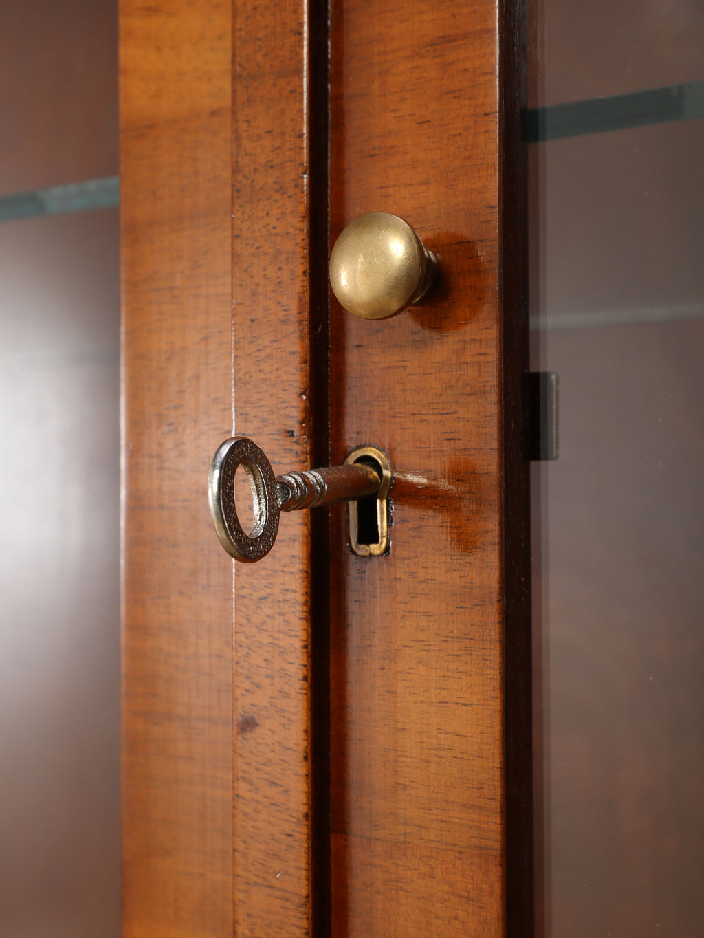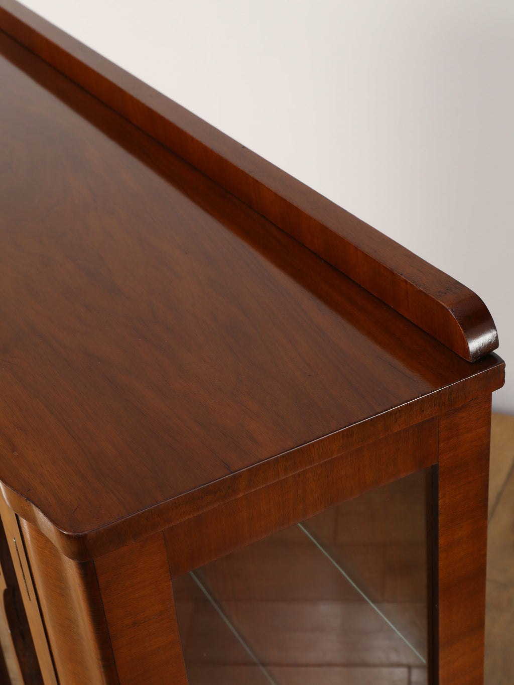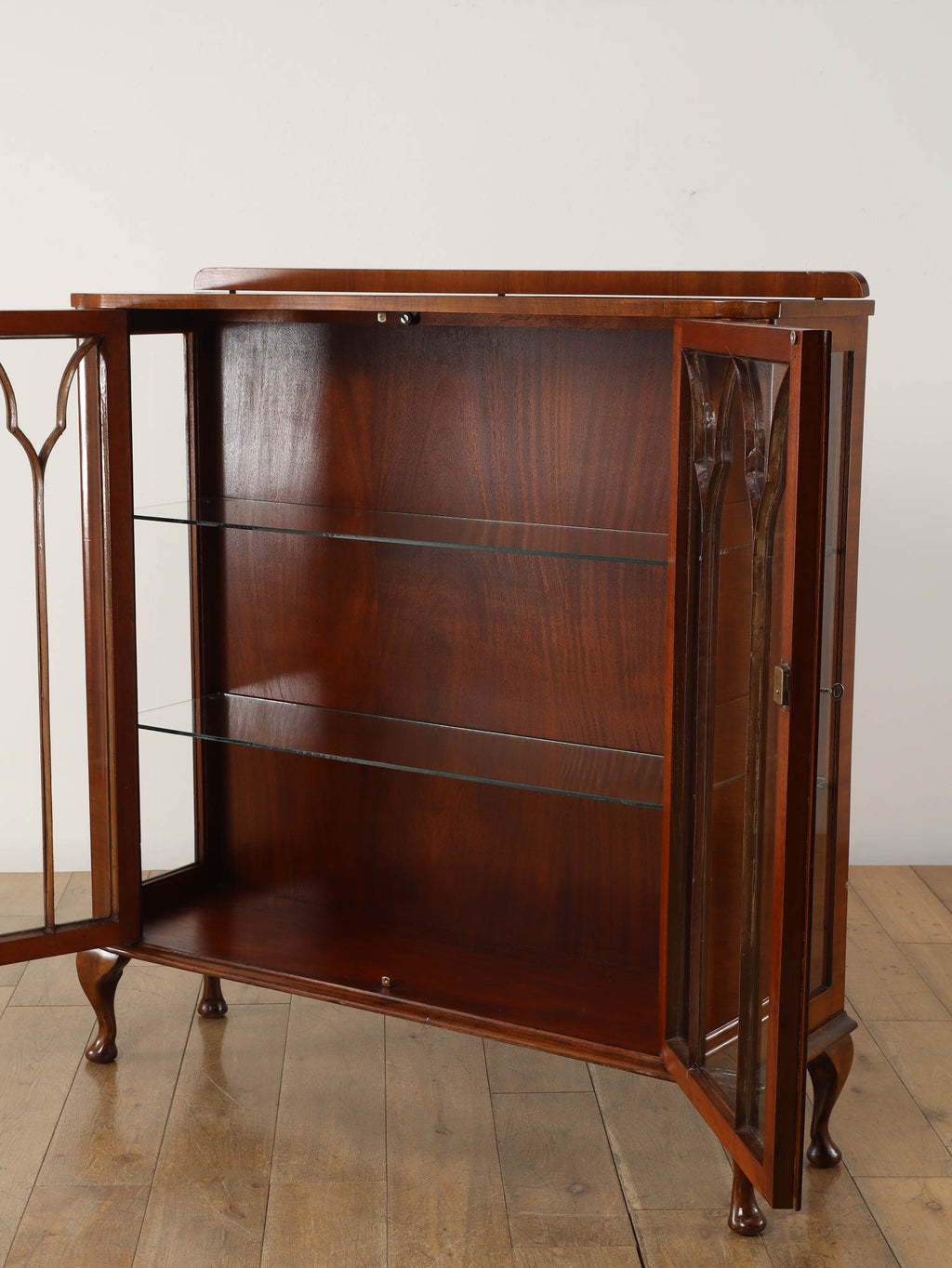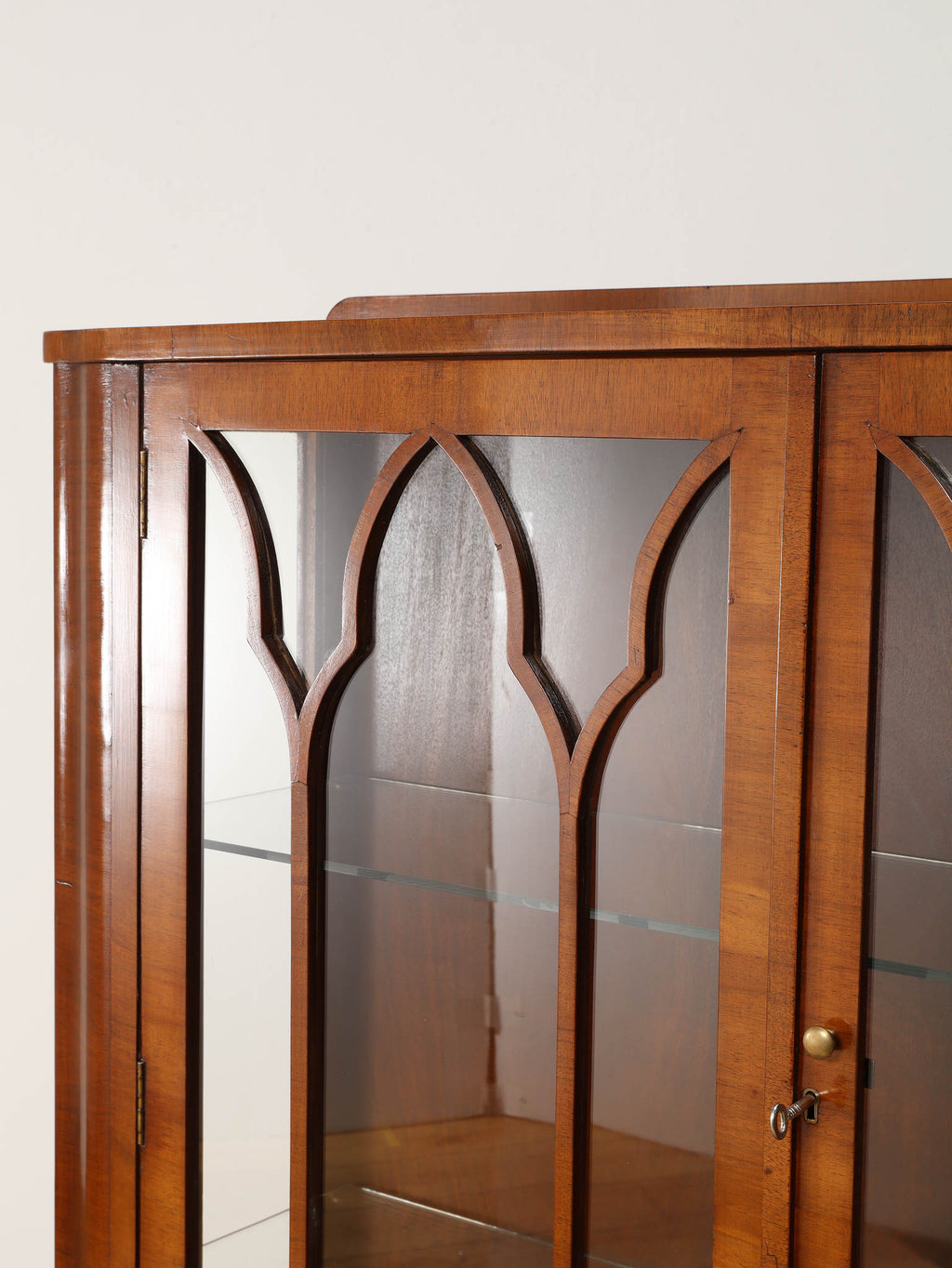 実用性と美学を両立させるために愛用された家具として親しまれてきたチャイナキャビネット。緻密で美しい縞模様が特徴的なウォルナット材が使用されており、光の加減によりその豊かな杢目が楽しめます。直線的なデザインに対し滑らかな猫脚が映え、アンティークならではの古き良き風合いが感じられます。また、扉のガラスに施された尖頭アーチのような意匠が美しく、空間を格調高く見せてくれるでしょう。