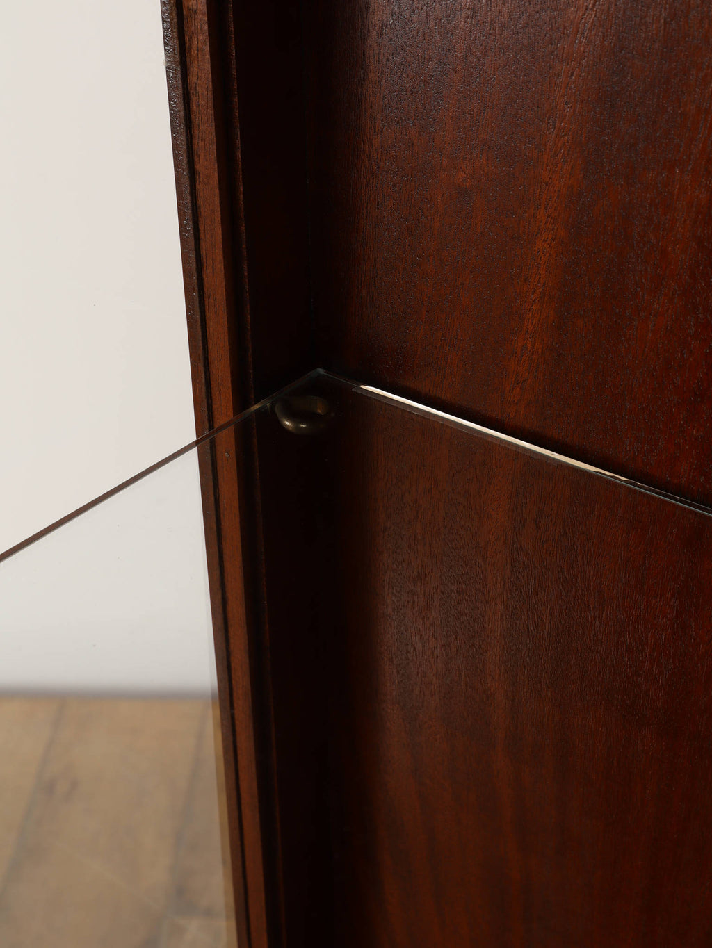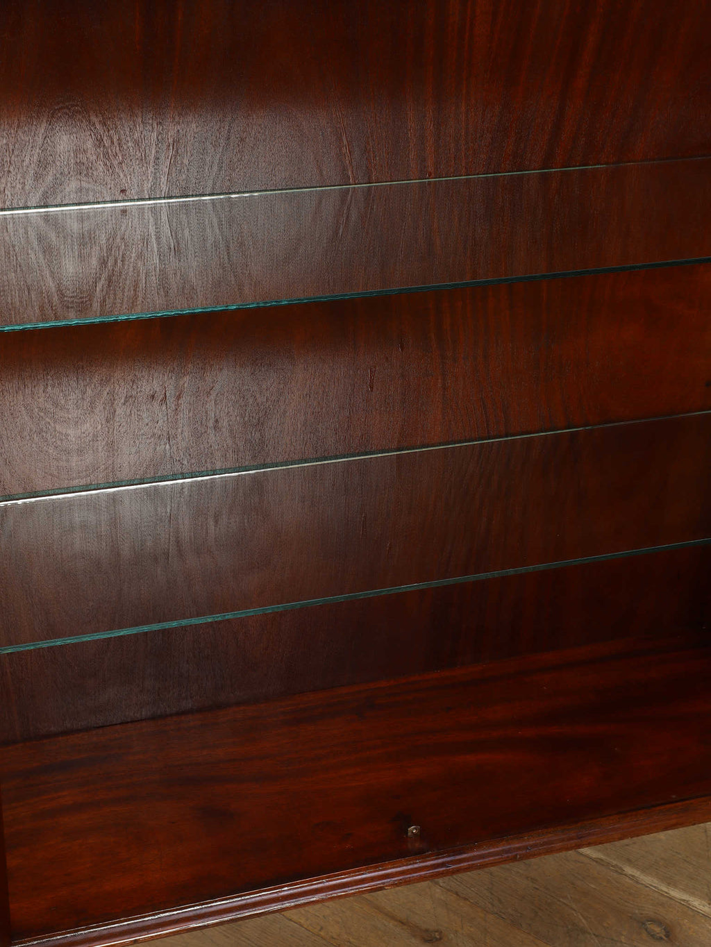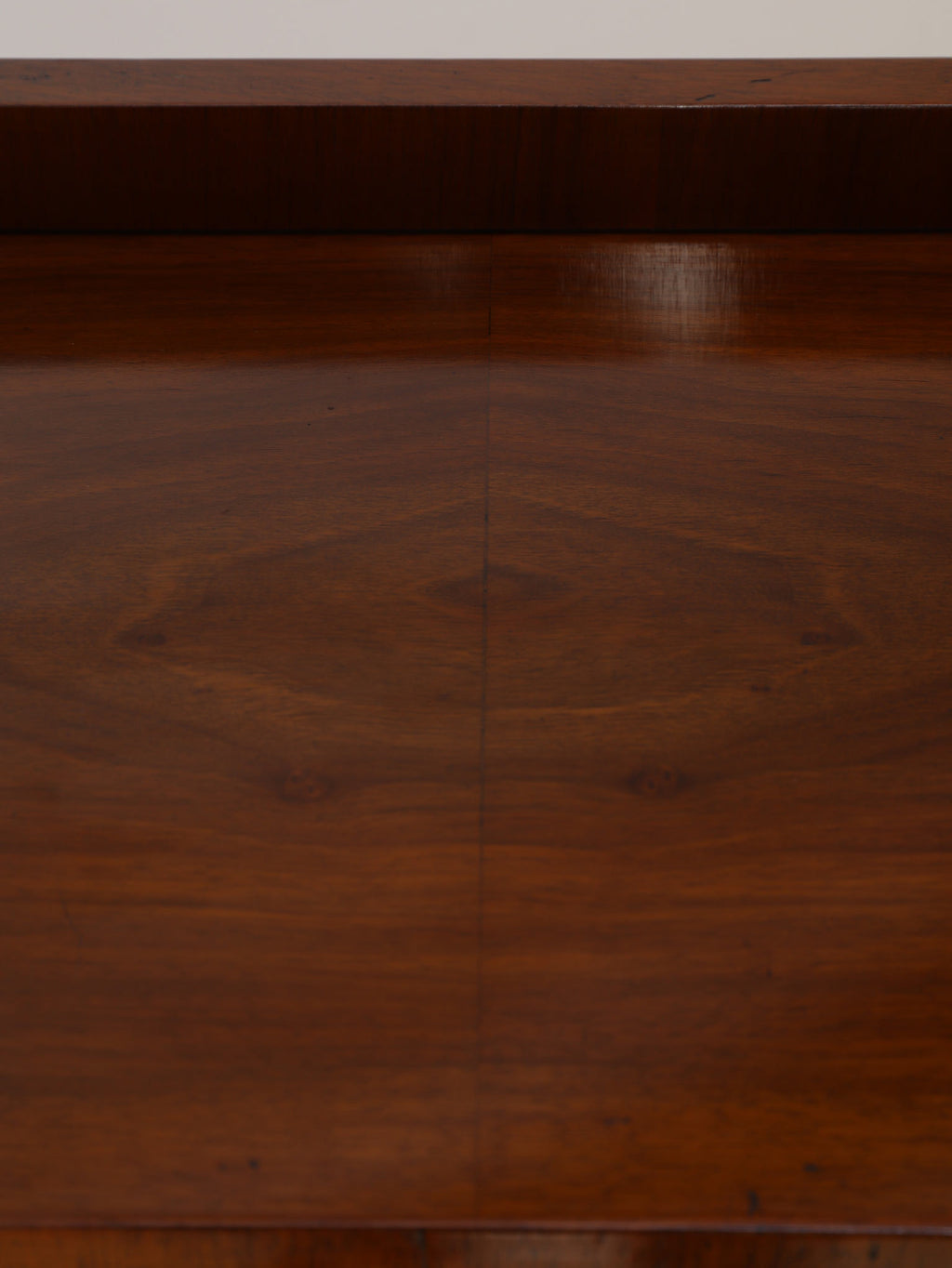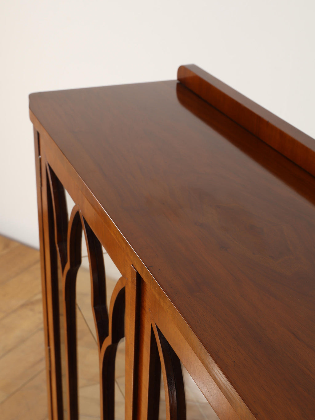 実用性と美学を両立させるために愛用された家具として親しまれてきたチャイナキャビネット。緻密で美しい縞模様が特徴的なウォルナット材が使用されており、光の加減によりその豊かな杢目が楽しめます。直線的なデザインに対し滑らかな猫脚が映え、アンティークならではの古き良き風合いが感じられます。また、扉のガラスに施された尖頭アーチのような意匠が美しく、空間を格調高く見せてくれるでしょう。
