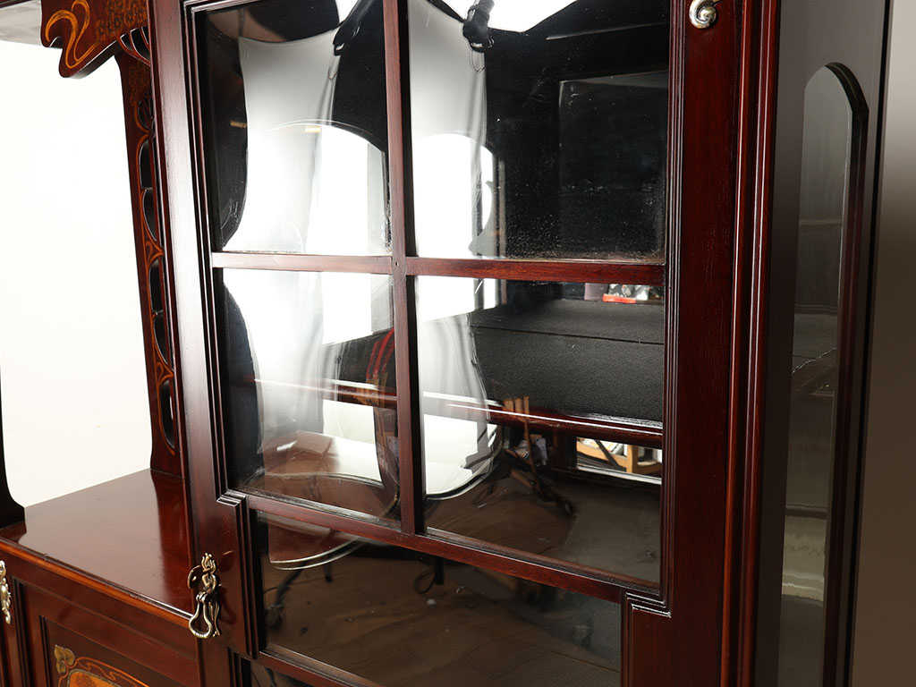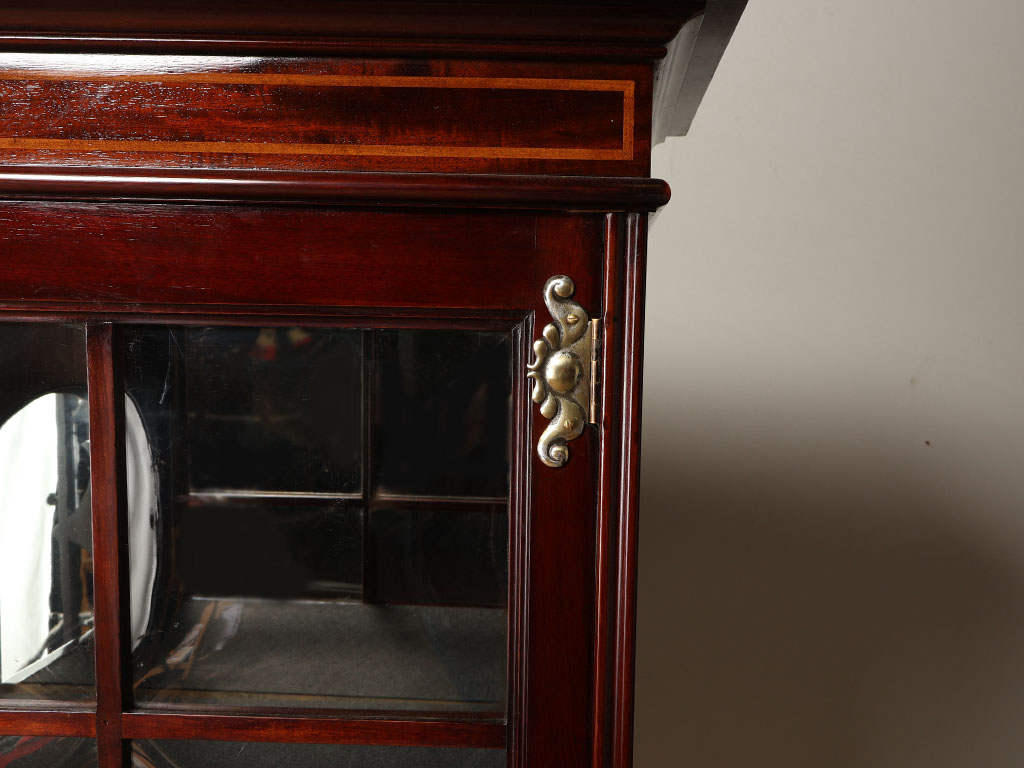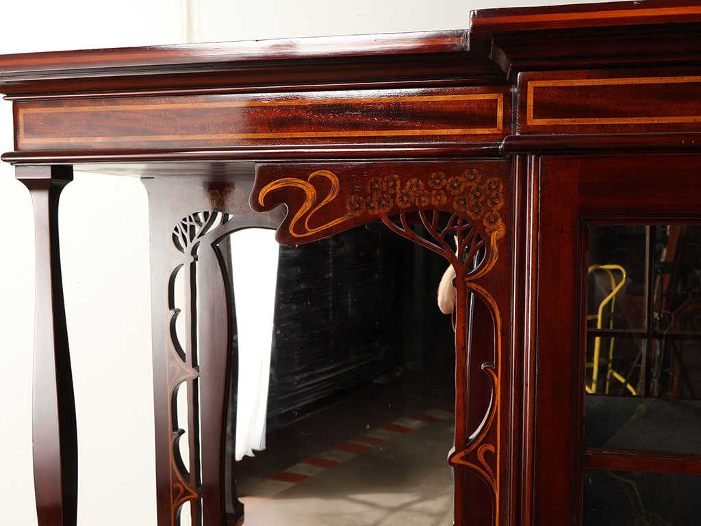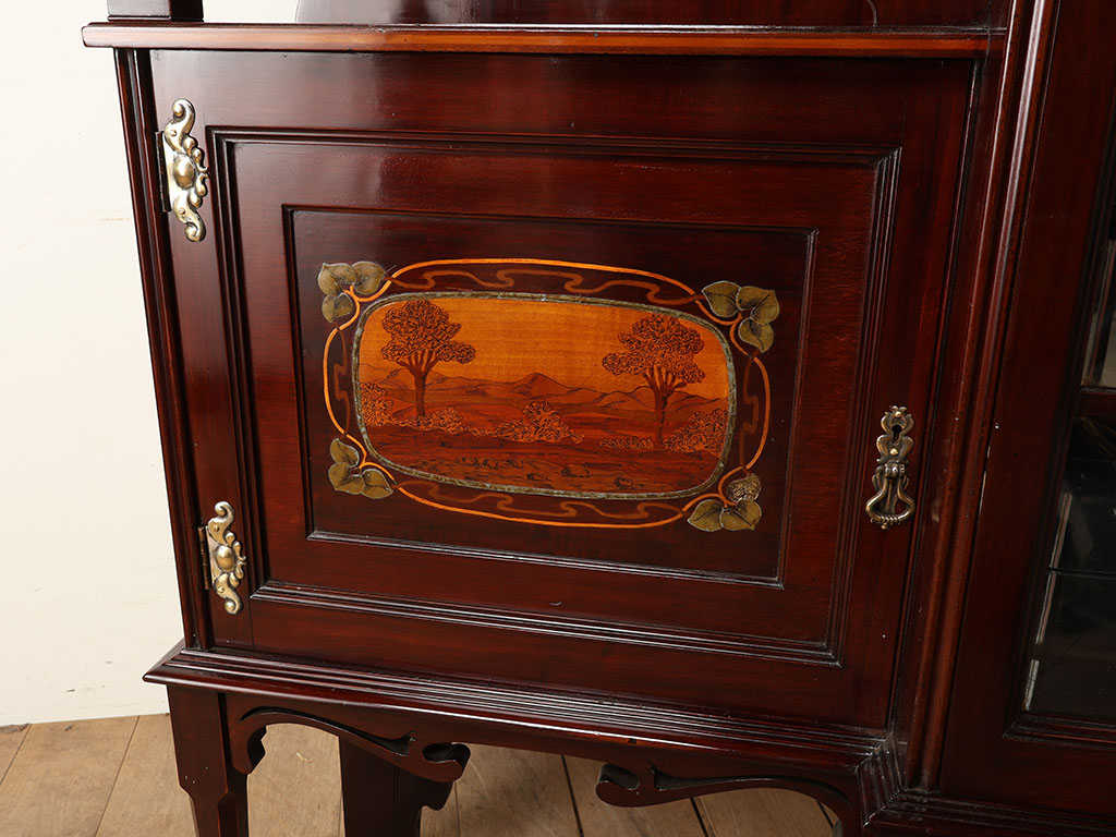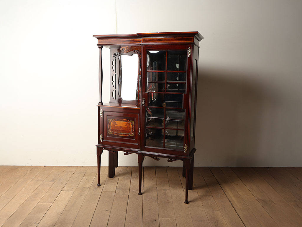 1900 年代(推定)イギリスで製作されたディスプレイキャビネットです。当時のイギリス家具の装飾技術が凝縮された非常に珍しい逸品となります。左側にオープンスペースとミラー、右側にガラス扉を配した構成となっており、当時のアーツ・アンド・クラフツ運動が目指した「個性的で自由な造形」を象徴していると感じ取れます。マホガニー材の重厚ながらも軽やかな印象がある風合いも魅力。なかなか出会うことのない、大変希少なアンティークです。