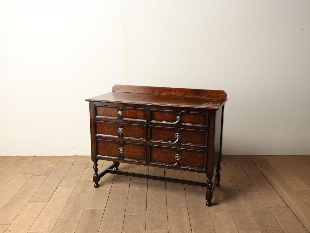 1920年(推定)にイギリスにて製作されたチェストです。6杯の抽斗に分かれており、非常に実用性の高い造りが魅力的なデザインです。収納家具としてはもちろんですが、ゆとりのある天板には、ランプや花器などを置いていただくことも可能となるため、ディスプレイスペースとして最適です。耐久性にも優れたオーク材が使用されており、デザイン性だけではない信頼も感じられる逸品となります。