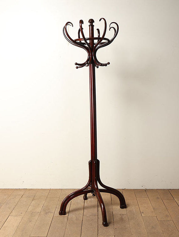 アンティーク家具の製作において、代表的な工法の一つである、ベントウッド。その名の通り、しなりと粘りに強いビーチ材を蒸気で熱し、それらを曲げて作られます。木を削り出す手法では表現できない美しい曲線を描き、軽やかな印象はいつの時代も好まれる事でしょう。同様の構造はベントウッドチェアが定番ですが、コートスタンドやベンチ、稀にテーブルなども制作されました。高さが出る分、存在感が際立つコートスタンドですが、ベントウッドの利点が活かれされ、すっきりと空間に配置して頂けます。また、使用していない際も独特なディテールは一つのインテリアとして佇み、コーディネートの幅を広げてくれるアイテムです。