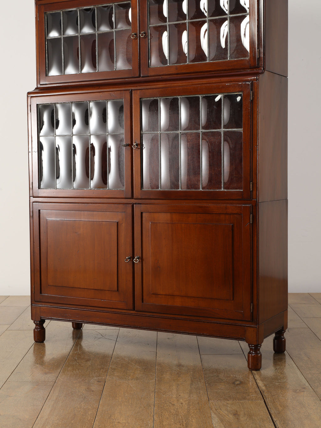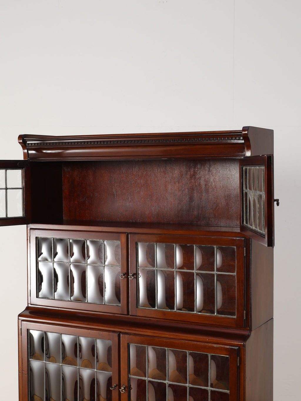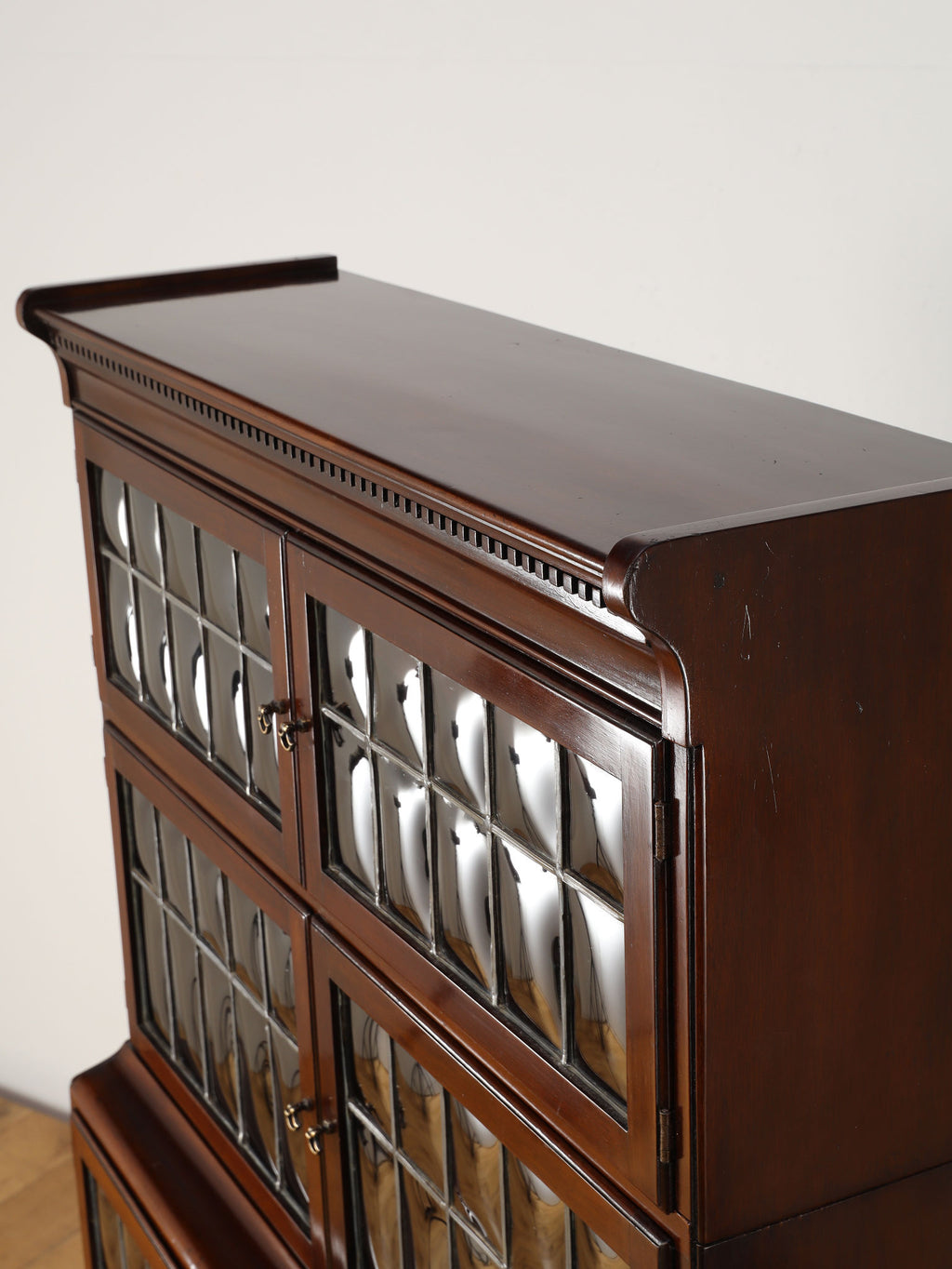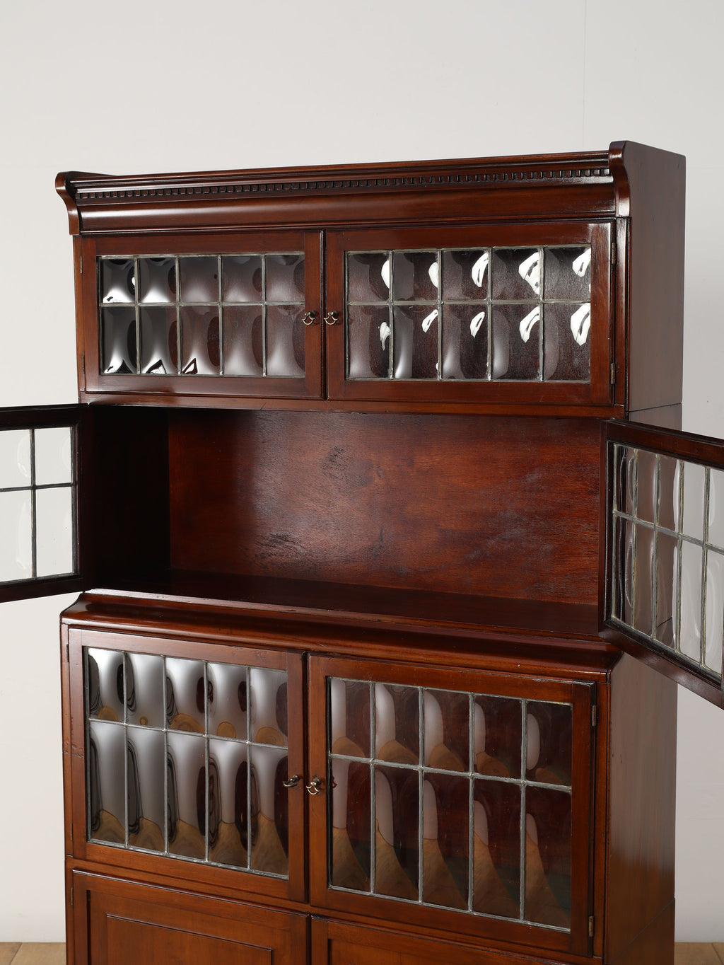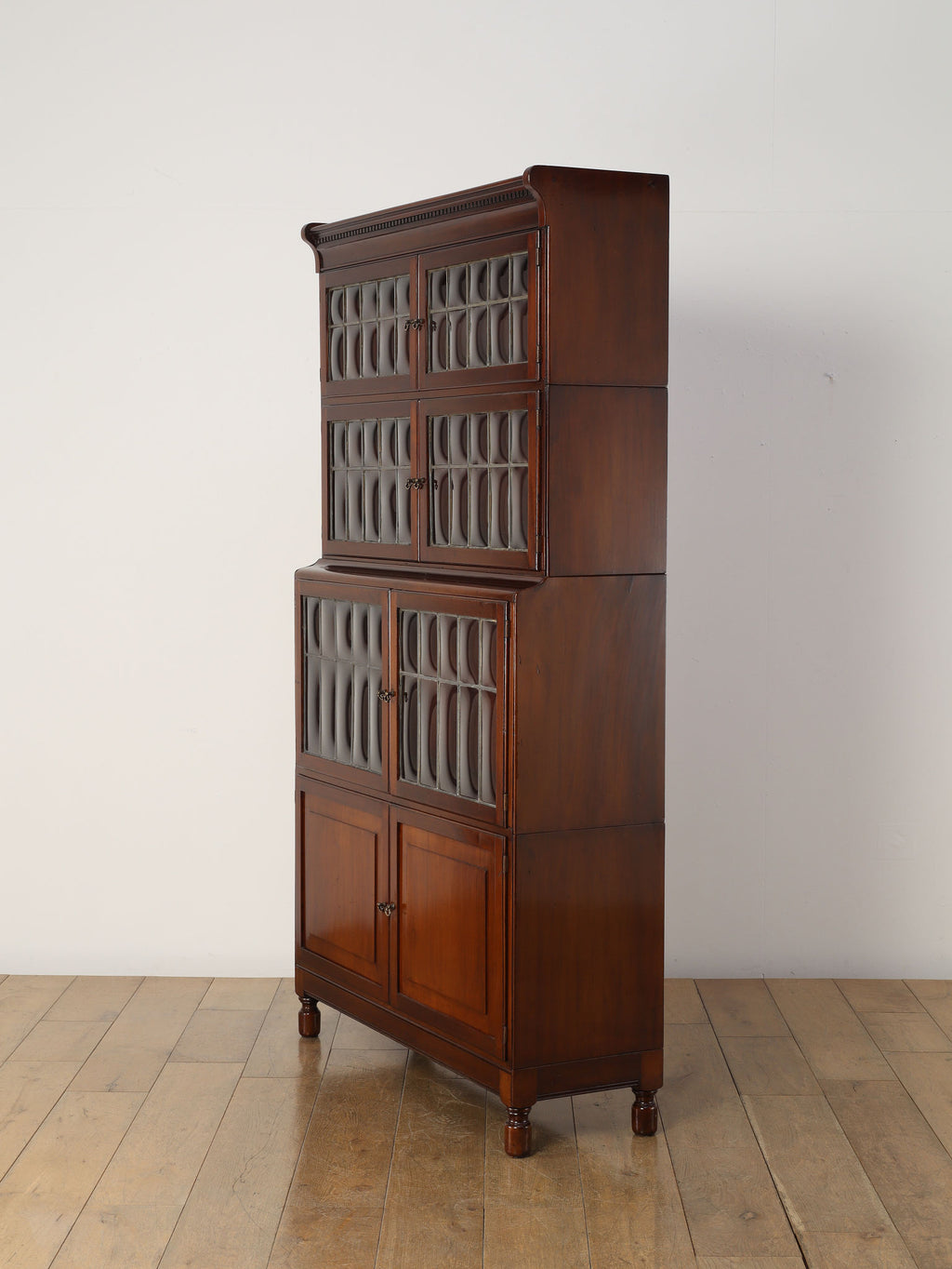 1920年代(推定)にイギリスで作られた、気品あふれる英国アンティークの本棚です。深みのあるマホガニー材は、100年の歳月を経て、現代の家具には出せない独特の温かみと上品な質感を醸し出しています。装飾を抑えた直線的なシルエットと、美しい意匠のバブルグラスの戸が織りなすデザインは、格式高い書斎にはもちろん、モダンなリビングにも自然に調和します。幅900mmという程よいサイズ感ながら収納スペースも多く、抜群の機能性を誇るのも魅力です。
