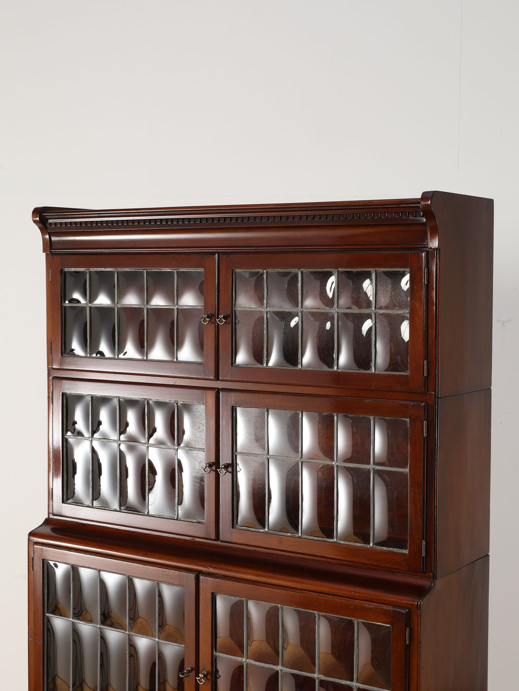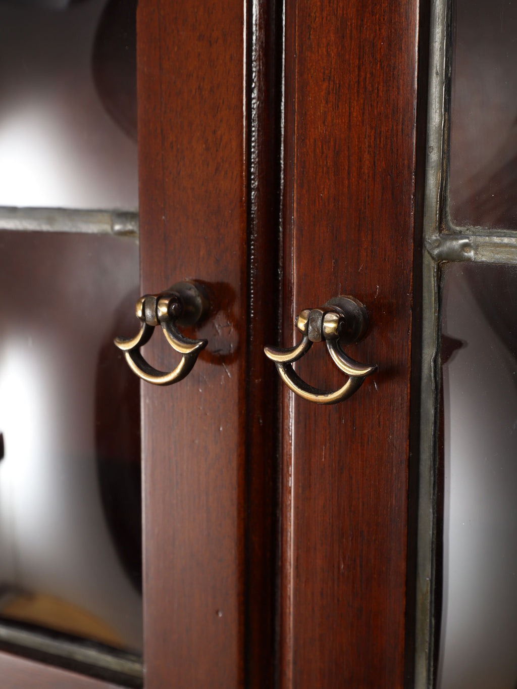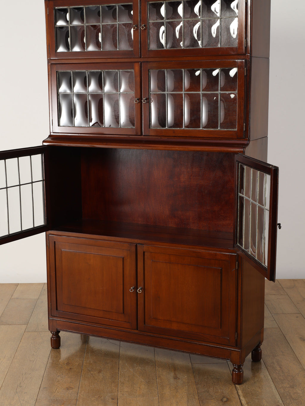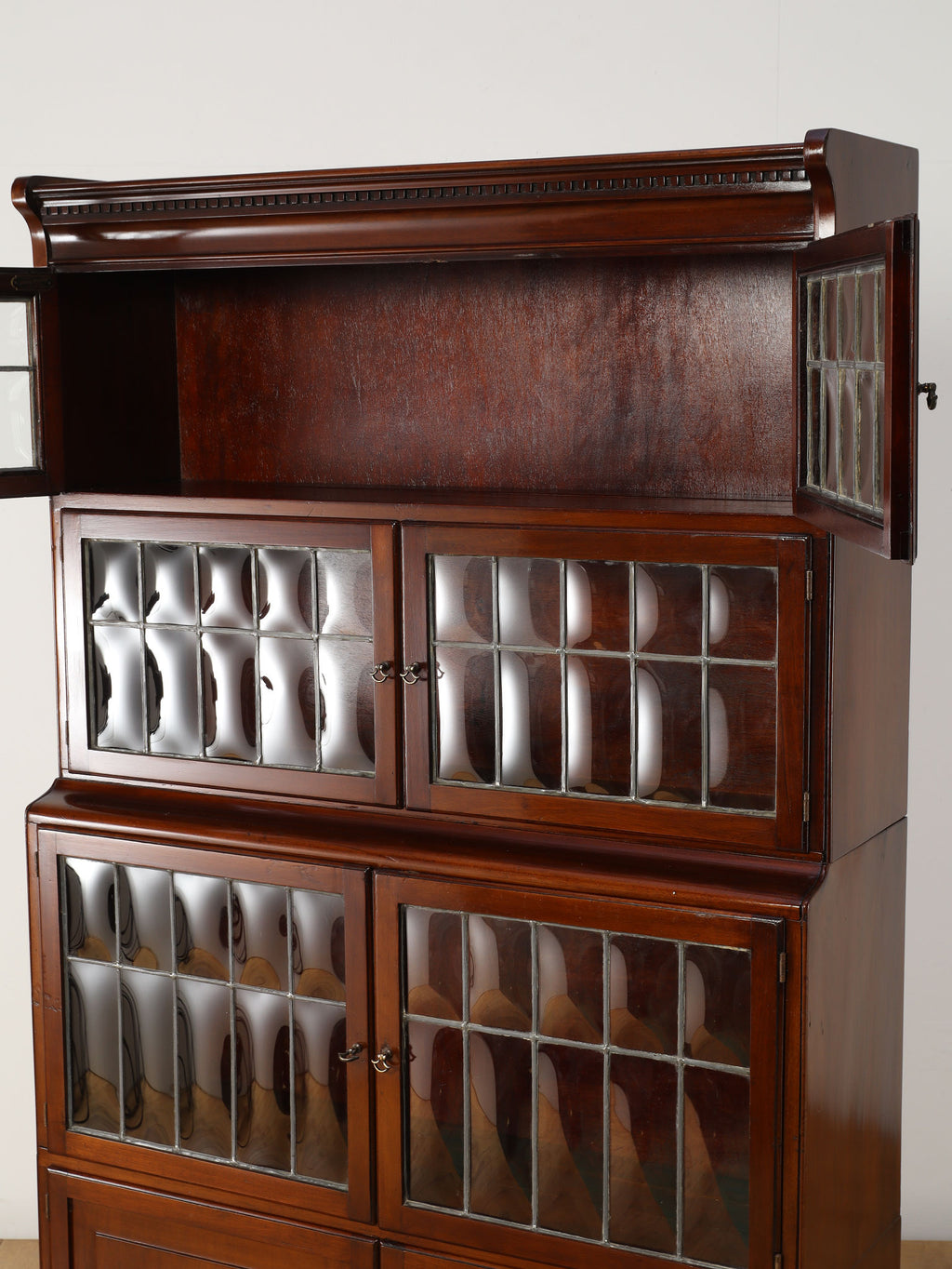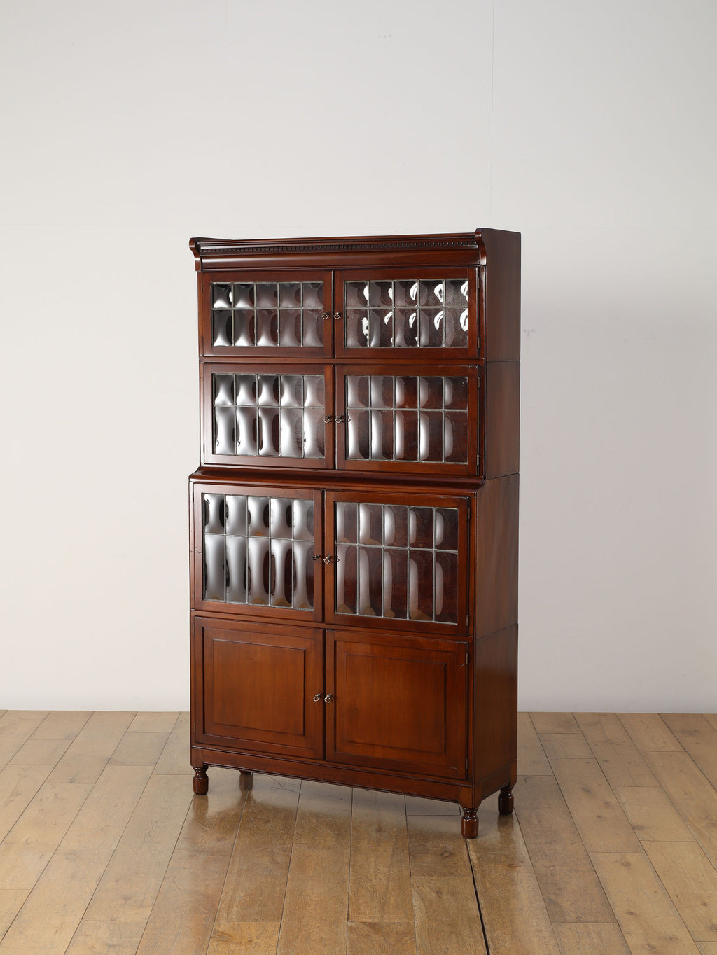 1920年代(推定)にイギリスで作られた、気品あふれる英国アンティークの本棚です。深みのあるマホガニー材は、100年の歳月を経て、現代の家具には出せない独特の温かみと上品な質感を醸し出しています。装飾を抑えた直線的なシルエットと、美しい意匠のバブルグラスの戸が織りなすデザインは、格式高い書斎にはもちろん、モダンなリビングにも自然に調和します。幅900mmという程よいサイズ感ながら収納スペースも多く、抜群の機能性を誇るのも魅力です。