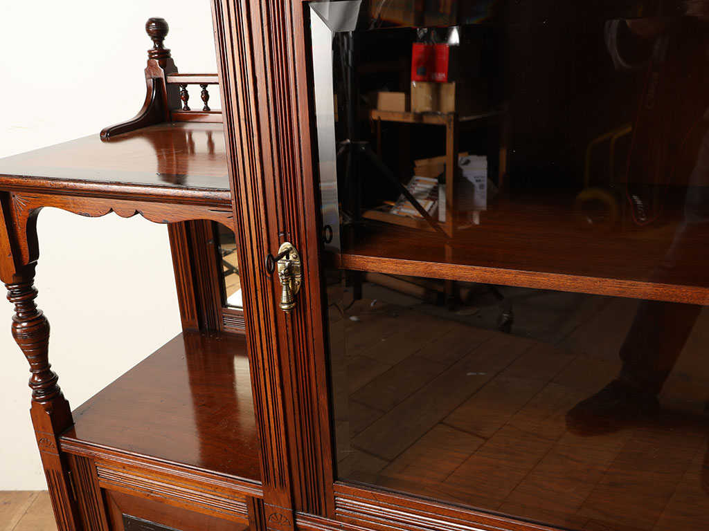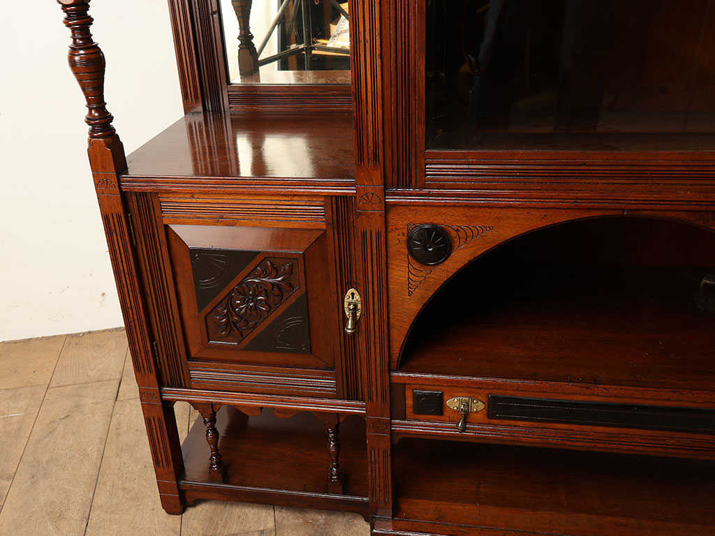 1890年代(推定)に製造されたイギリスのマホガニー材ヴィクトリアンキャビネットです。古き良き英国の美意識が凝縮された、圧倒的な存在感を放つ飾り棚です。希少なマホガニー材を贅沢に使用し、繊細な透かし彫りや美しい挽き物細工が随所に施されています。中央のガラス扉やオープン棚、左右の収納部など、変化に富んだ構成がコレクションをより魅力的に引き立てます。棚の一部にはバックミラーが配されており、飾った小物の後ろ姿を映し出すとともに、空間に奥行きと輝きをもたらします。扉のパネルに刻まれた浮き彫りも見事で、当時の職人の技術の高さが窺えます。実用的な収納家具としてだけでなく、それ自体が美術品のような佇まいを持つ一品です。