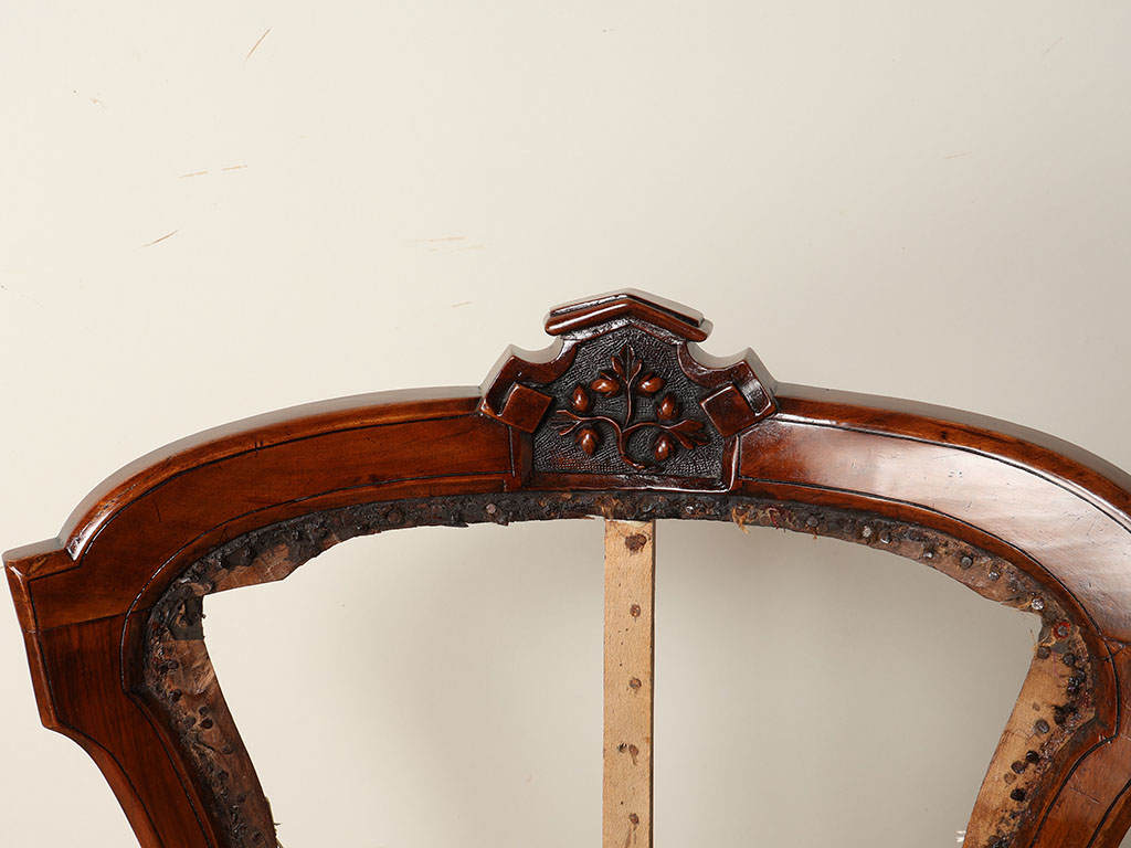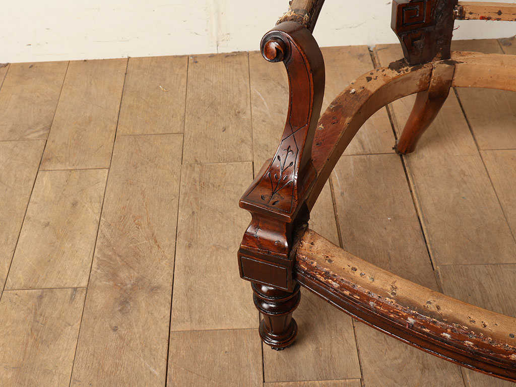 1880年代(推定)に製造されたイギリスのジェントルマンズサロンチェアです。希少なウォルナット材の美しい木目と、艶やかな質感が際立つ、ヴィクトリア時代を象徴する優雅な椅子です。背もたれの頂点には、植物や果実を思わせる立体的で美しい彫刻があしらわれ、アームの曲線部分にも繊細なラインの装飾が施されています。当時の英国紳士がくつろぐために作られたこのチェアは、肘掛け付きでゆったりと座れる形状が特徴です。脚元は丁寧に削り出されたターンドレッグで支えられており、細部に至るまで伝統的な意匠が凝縮されています。書斎やリビングの主役として、重厚な存在感を放つ逸品です。