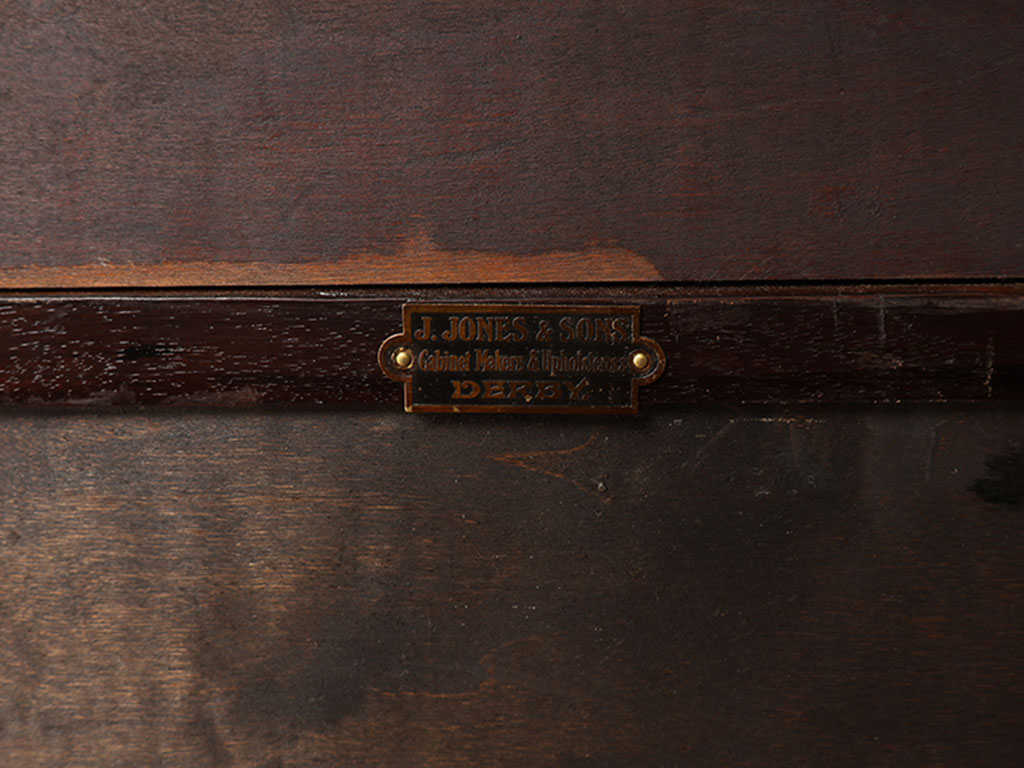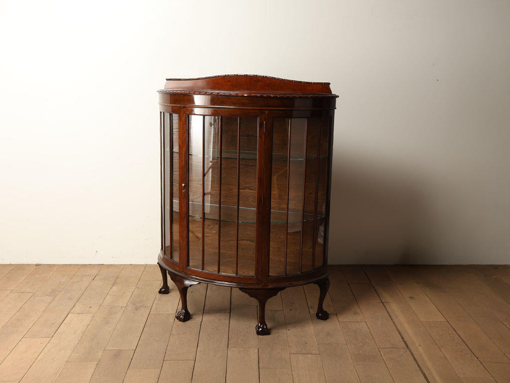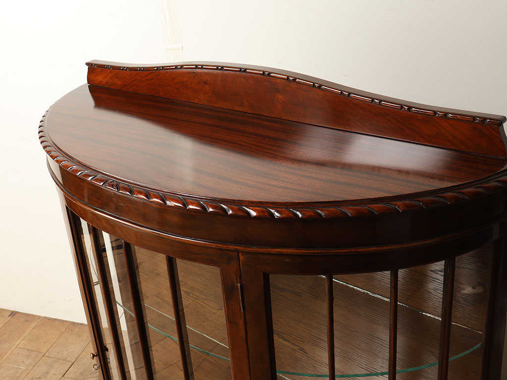 1930年代(推定)に製造されたイギリスのJ.JONES&SONS キャビネットです。ダービーシャー州の老舗家具メーカー、J.JONES&SONS社によって手掛けられた、確かな品質と格式を感じさせる飾り棚です。マホガニー材特有の深みのある色艶と、前面が緩やかな弧を描くボウフロントのフォルムが、空間に優雅な奥行きをもたらします。天板の縁にはロープのような繊細な装飾が施され、足元は伝統的なボウル・アンド・クロウのデザインで力強く支えられています。ガラスの棚板が光を通し、大切なコレクションを美しく演出する、英国の職人技が光る逸品です。