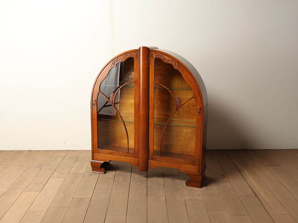 1930年代(推定)に製造されたイギリスのデコキャビネットです。力強い木目が魅力のオーク材を使用し、当時の流行であったアール・デコ様式を色濃く反映した、独創的なデザインの飾り棚です。全体的に丸みを帯びたアーチ状のフォルムが特徴で、直線と曲線を巧みに組み合わせた幾何学的な美しさが際立ちます。特に目を引くのは、ガラス扉にあしらわれた優美な曲線と、そこにさりげなく施された植物モチーフの彫刻です。シンプルながらも洗練された佇まいは、和洋問わず現代のインテリアにも調和し、空間に個性的なアクセントを加える逸品です。