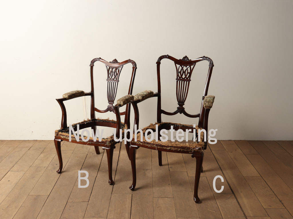 1910年代(推定)イギリス製のジェントルマンズアームチェア。英国アンティークの正統を感じさせる、堂々とした佇まいが魅力の一脚です。対となるレディースチェアに比べ、ひと回りゆったりとしたサイズ感で設計されており、その名の通り「紳士」が深く腰掛けて寛ぐための包容力を感じさせます。背もたれには、マホガニーの硬い木質を生かした精緻な透かし彫りが施され、光と影が織りなす美しいコントラストを楽しめます。滑らかに削り出されたアームは手に馴染みよく、書斎での読書やシガータイムなど、至福のひとときを支えるでしょう。