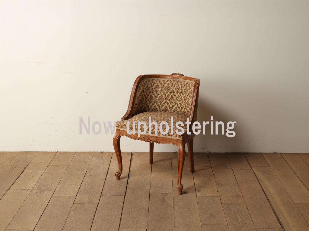 フレームに施された繊細な彫刻は、見る角度によって異なる表情を見せ、当時の豊かな芸術性を現代に伝えています。木の温もりと、緩やかにカーブした脚部の造形が、フレンチスタイル特有のエレガントな雰囲気を演出します。 リビングのパーソナルチェアとして、部屋の隅に置いて読書用として、様々なシーンで活躍することでしょう。