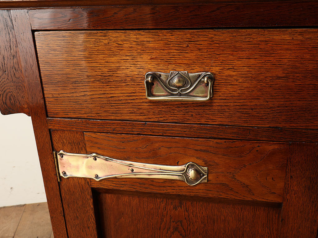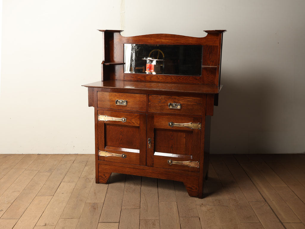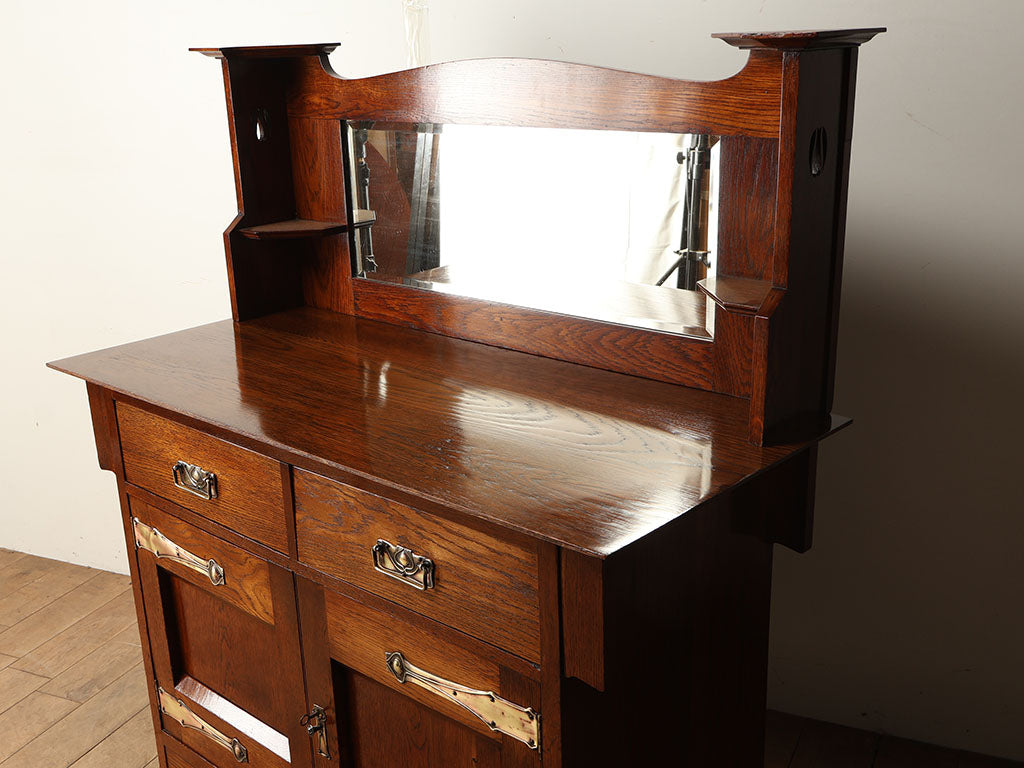 1910年代(推定)イギリス製。深みのある艶やかな木肌と、アール・ヌーヴォー調の美しい金属装飾が目を惹く重厚なデザインです。大きなミラーが光を取り込み、空間に開放感をもたらします。抜群の収納力に加え、上部の小棚には小物を飾る楽しみもありお部屋の主役となる逸品です。