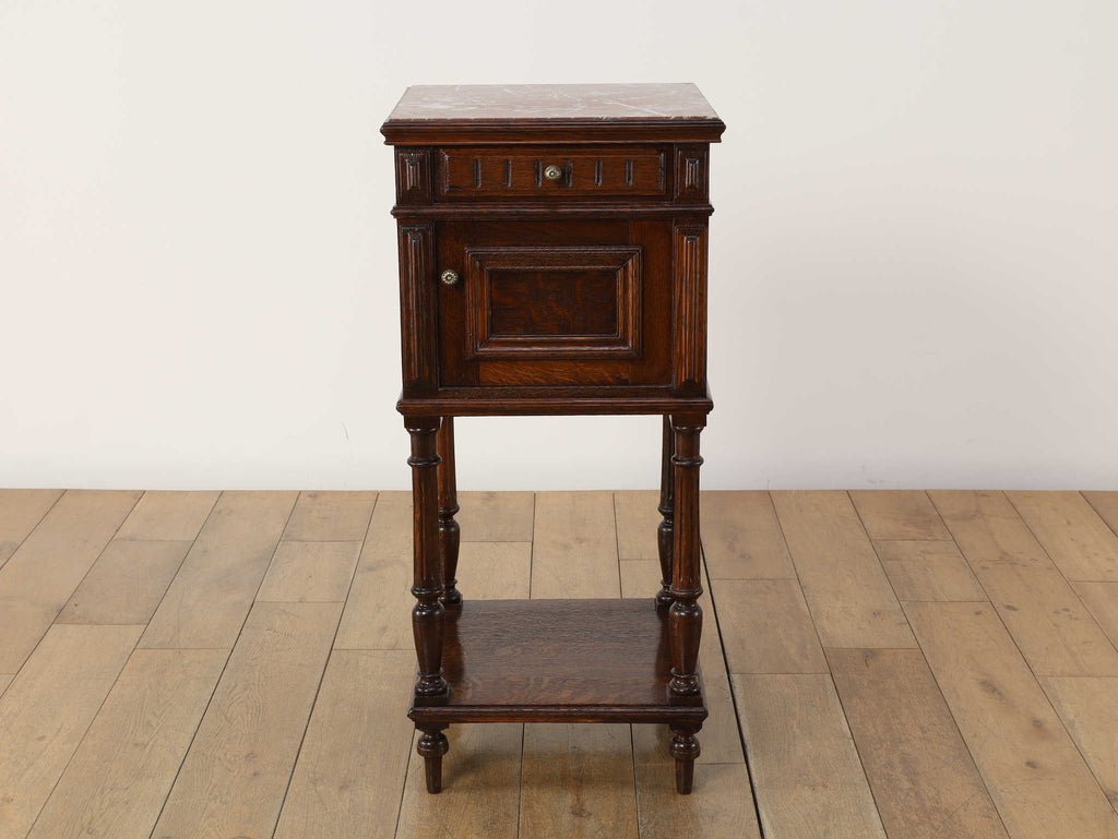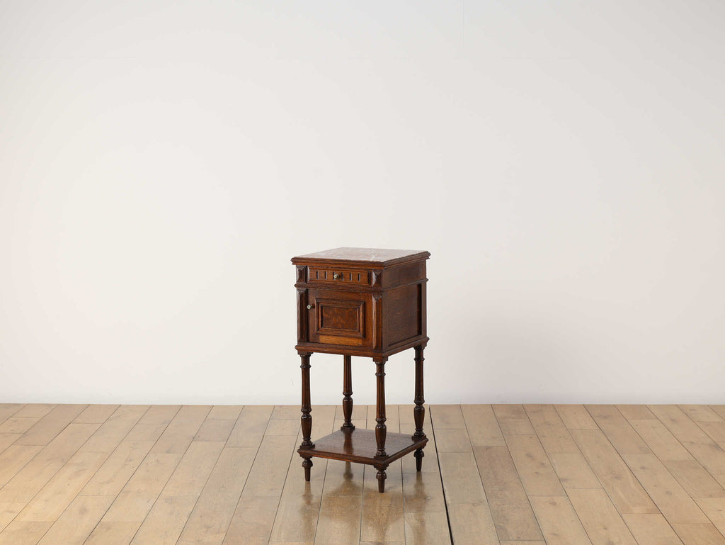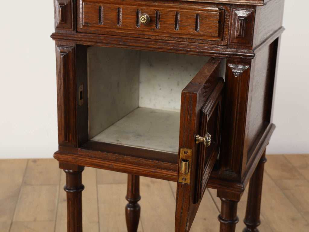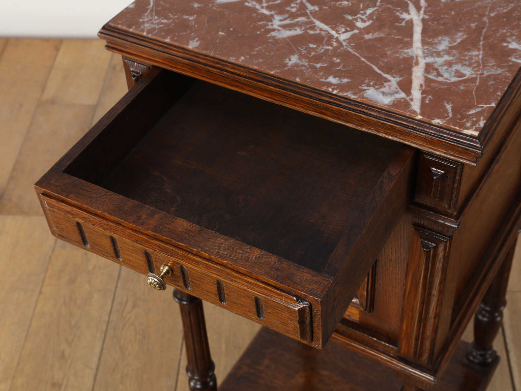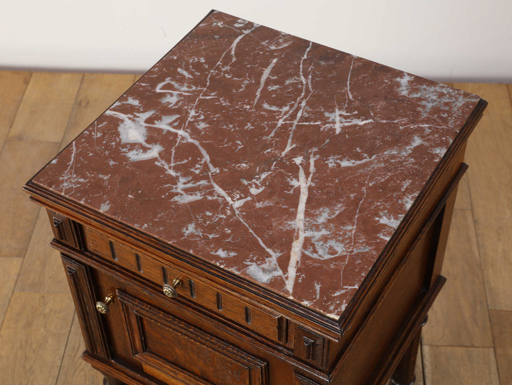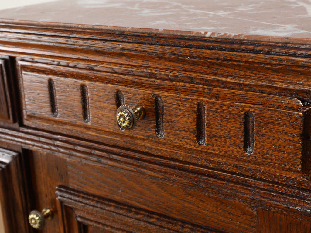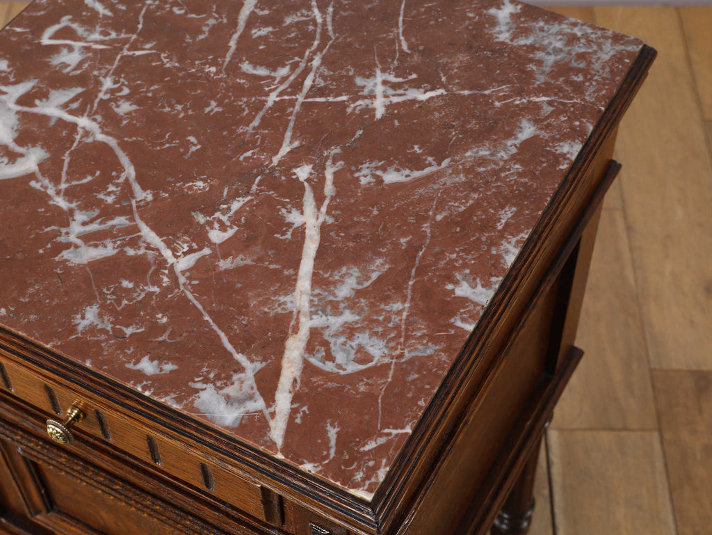 1920年代(推定)にフランスで製作されたクラシカルなデザインのポットカバードです。天板には、優美な赤みがかった色合いに白い模様が流れる天然大理石(マーブル)が用いられ、重厚なオーク材の本体と相まって、格調高い雰囲気を醸し出しています。約100年の時を超えたオーク材の深い木目と、引き出しや扉に施された立体的な彫刻が、この家具に確かな存在感を与えています。