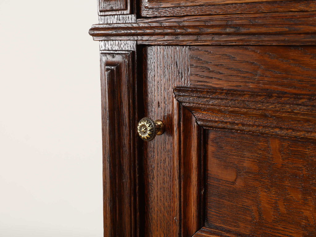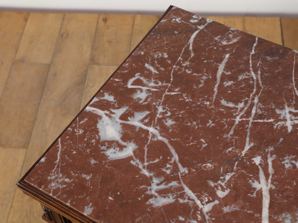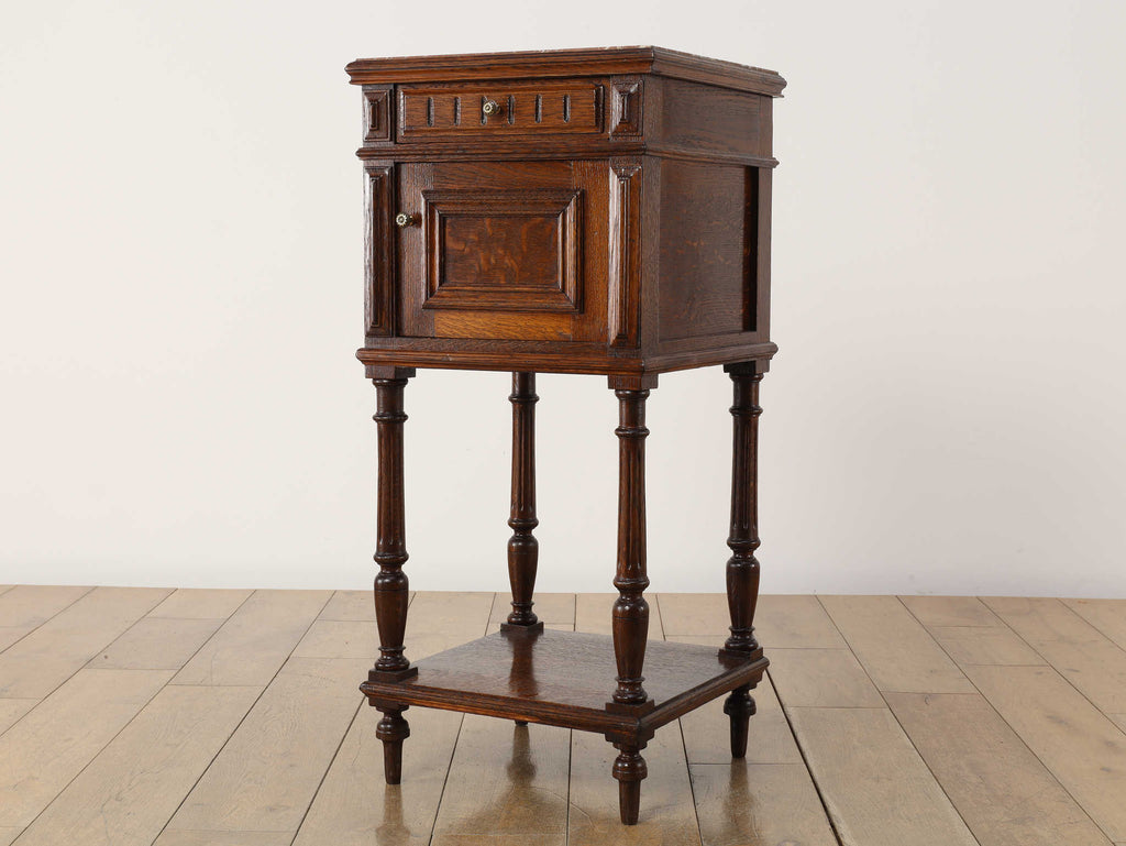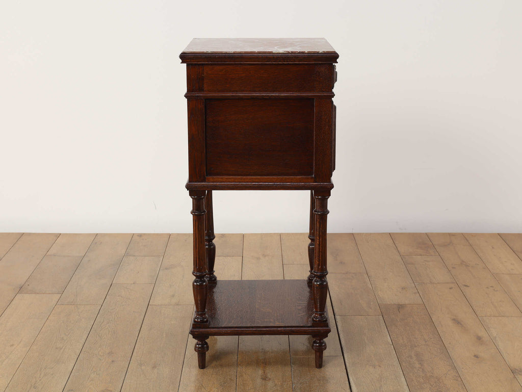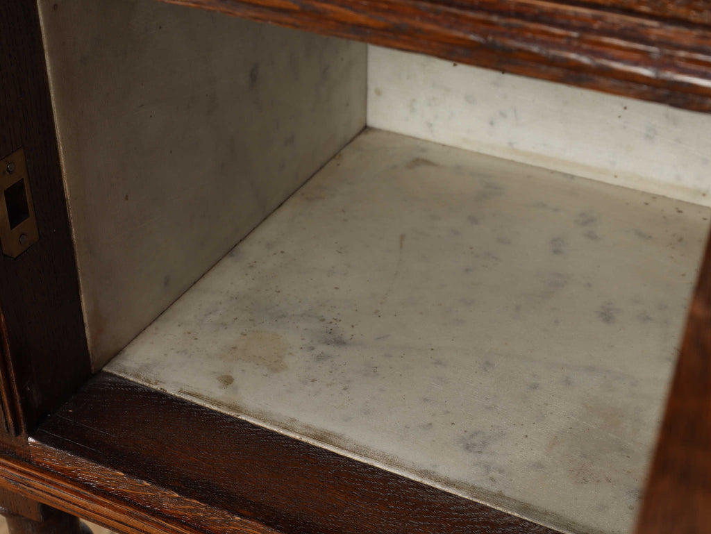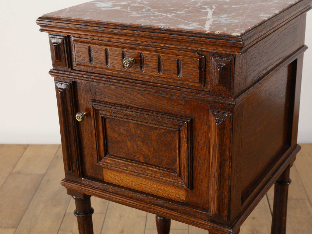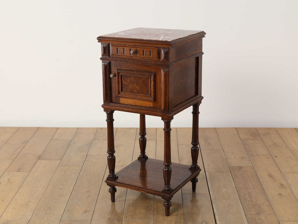 1920年代(推定)にフランスで製作されたクラシカルなデザインのポットカバードです。天板には、優美な赤みがかった色合いに白い模様が流れる天然大理石(マーブル)が用いられ、重厚なオーク材の本体と相まって、格調高い雰囲気を醸し出しています。約100年の時を超えたオーク材の深い木目と、引き出しや扉に施された立体的な彫刻が、この家具に確かな存在感を与えています。