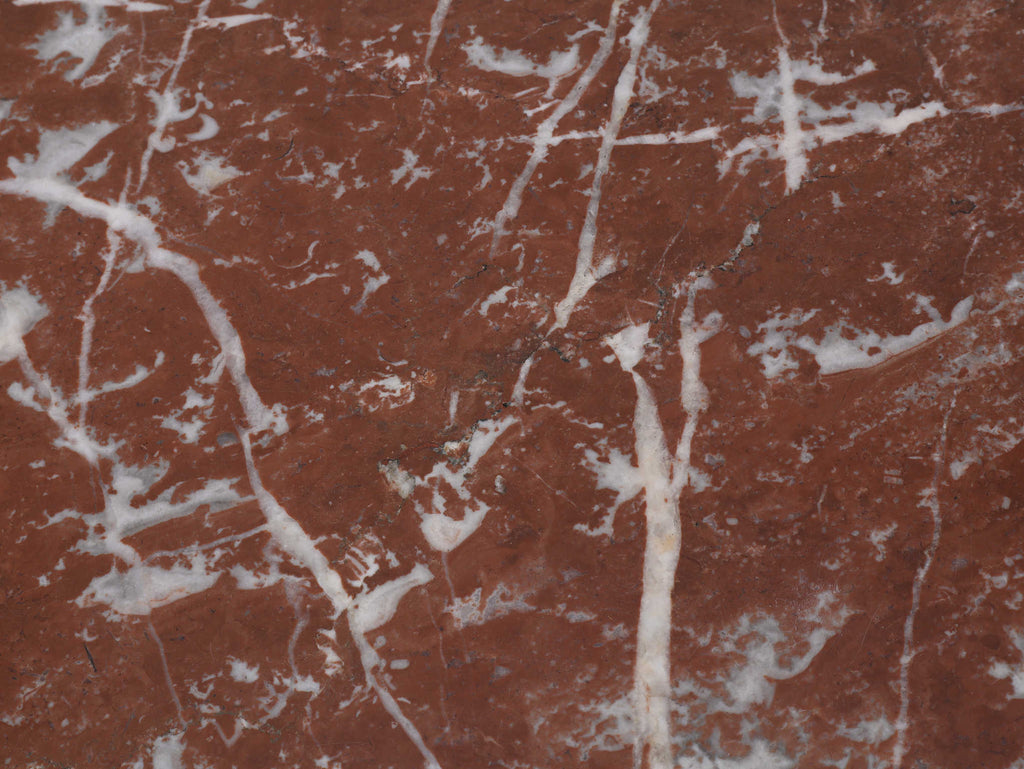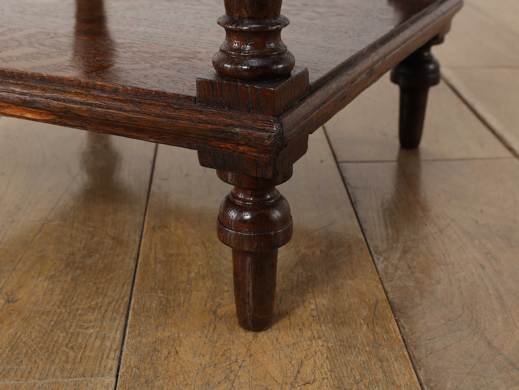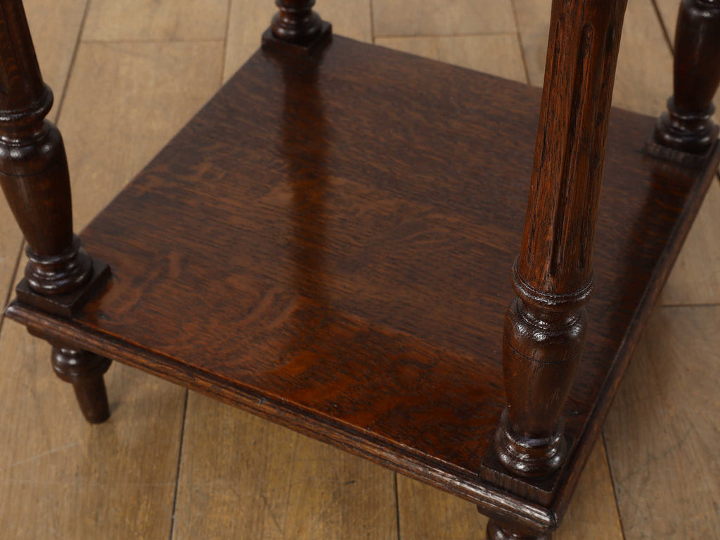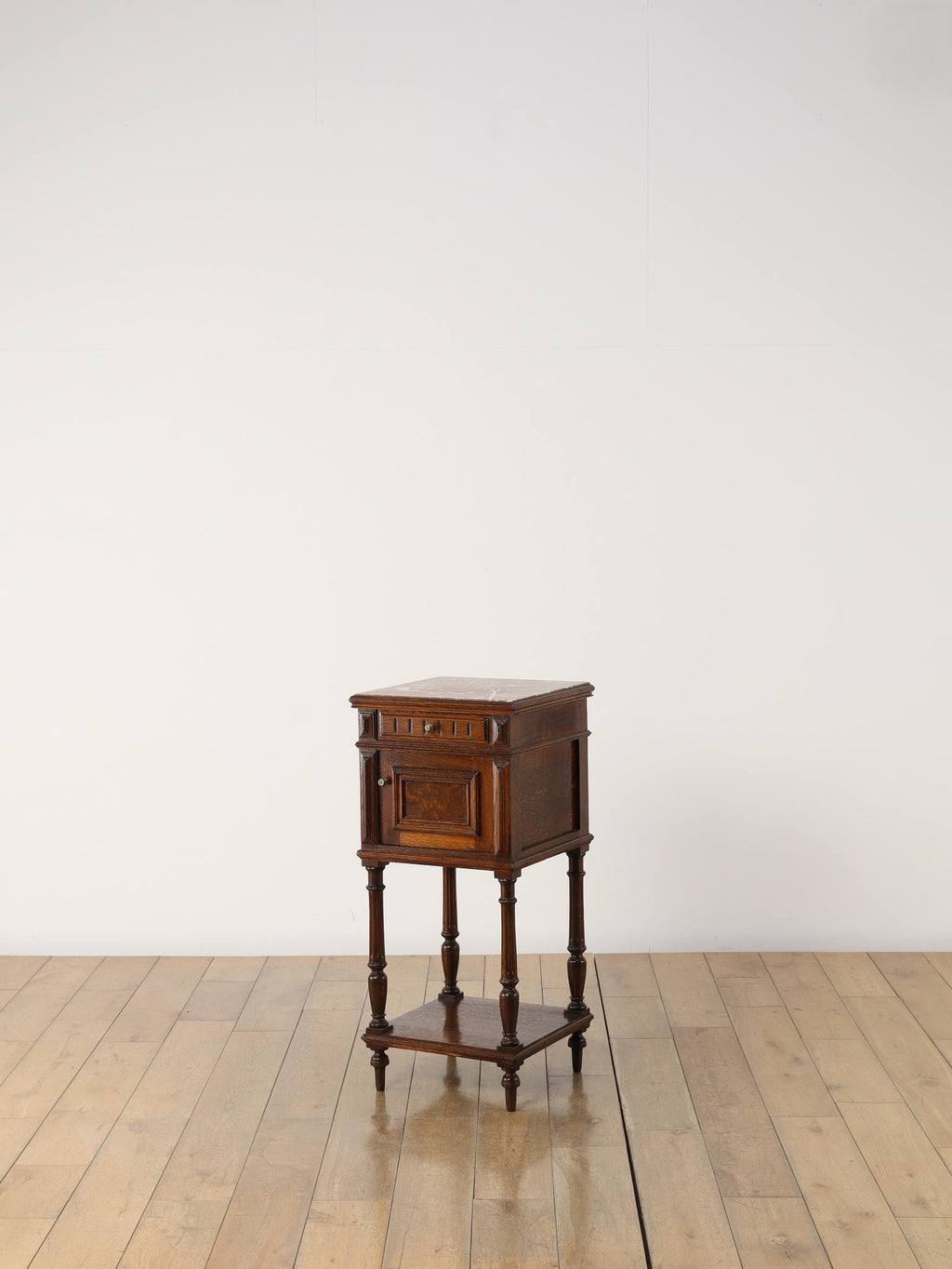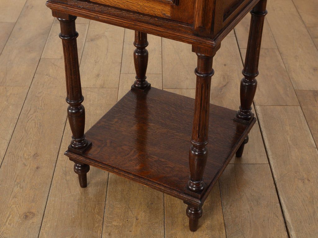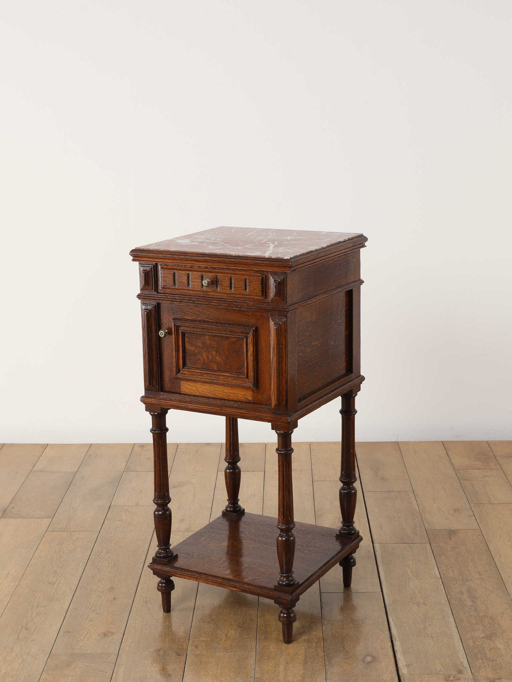 1920年代(推定)にフランスで製作されたクラシカルなデザインのポットカバードです。天板には、優美な赤みがかった色合いに白い模様が流れる天然大理石(マーブル)が用いられ、重厚なオーク材の本体と相まって、格調高い雰囲気を醸し出しています。約100年の時を超えたオーク材の深い木目と、引き出しや扉に施された立体的な彫刻が、この家具に確かな存在感を与えています。