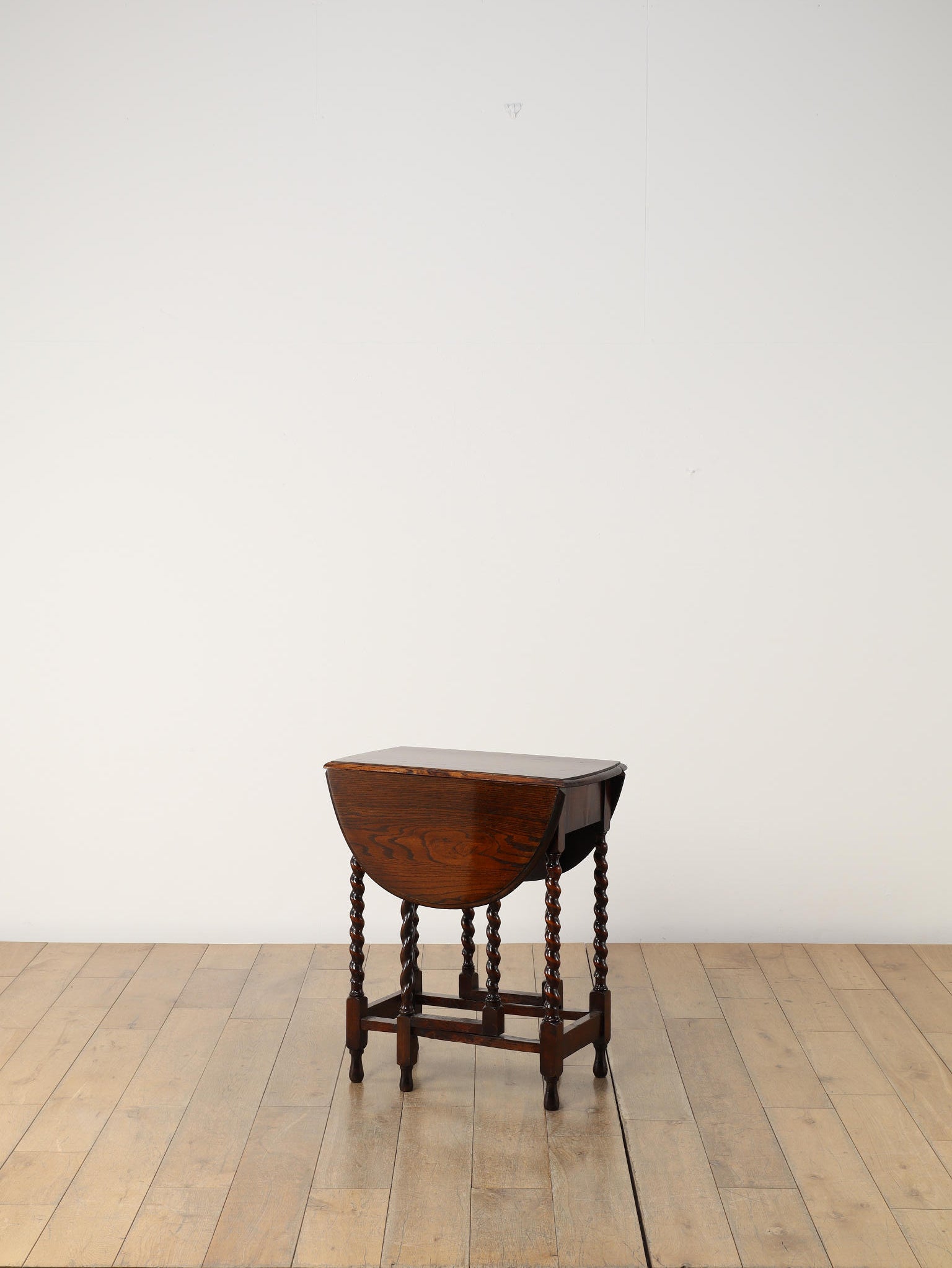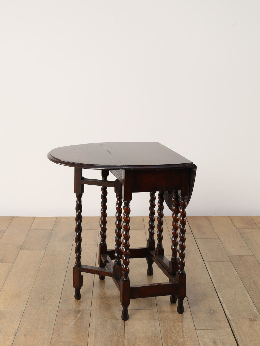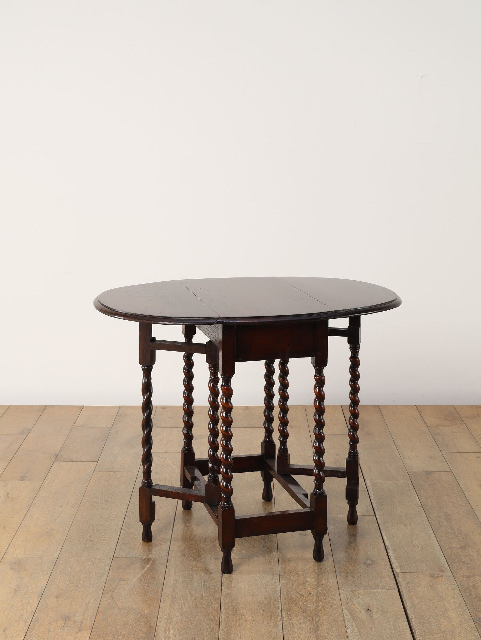 アンティークのダイニングの定番であるドローリーフテーブルと並び、現代の生活の中においても大変重宝するゲートレッグテーブル。左右の天板を折り畳むことができるバタフライスタイルのこちらのテーブルは、天板を支える脚部がゲート(門)のように可動することから、このように呼ばれます。小振りなサイズから、メインのダイニングとして使用可能な大きなサイズまで存在し、ご用途に合わせてお選びいただけます。両側を畳んでいる際は壁付けにしてコンソールテーブル代わりにもなり、常に適したスタイルで空間でご使用いただけることでしょう。ティーテーブル、デスク、作業台等、用途は多岐に渡り、万能なゲートレッグテーブルは現代の住環境において活躍の場が多い一台です。