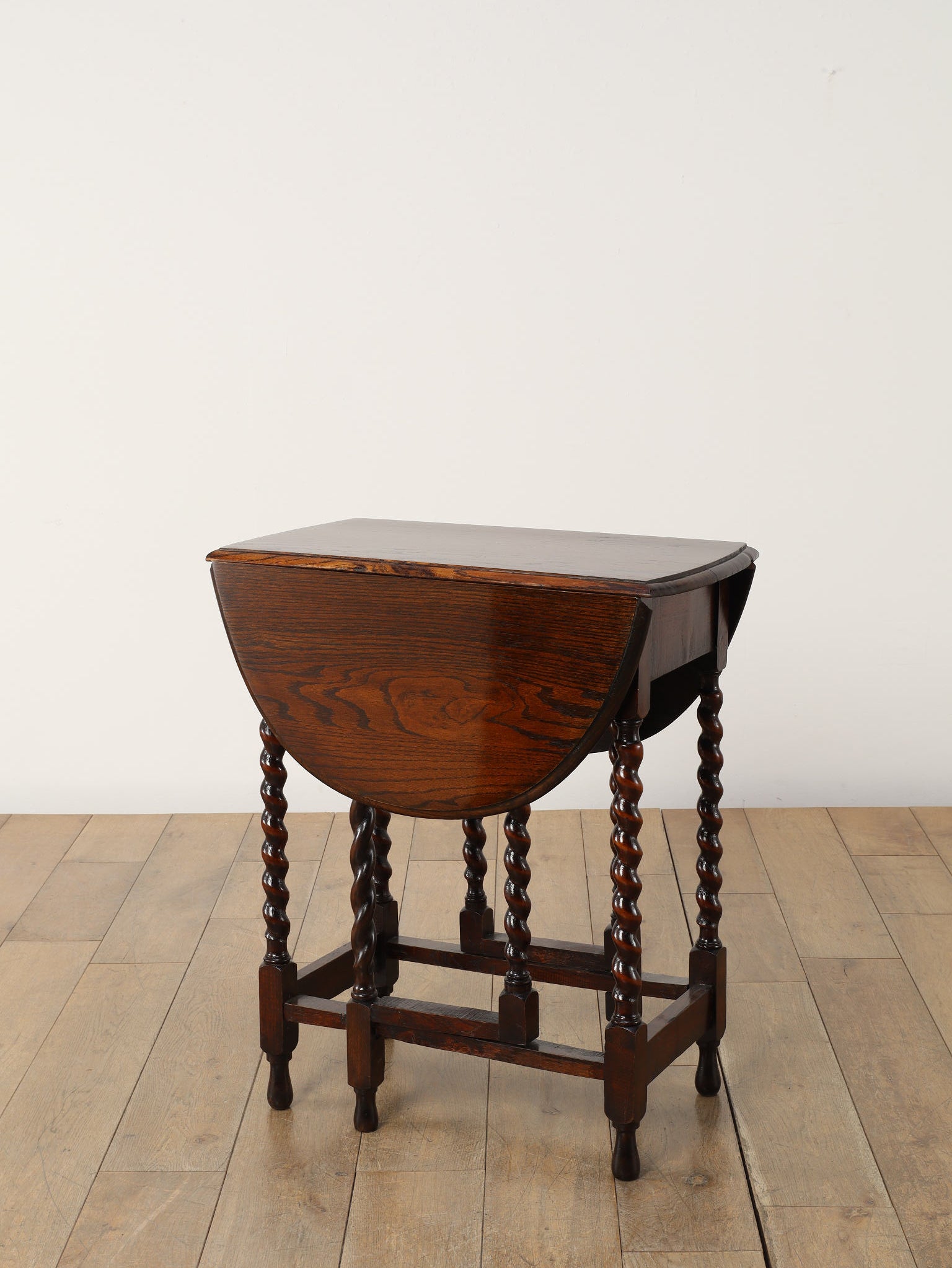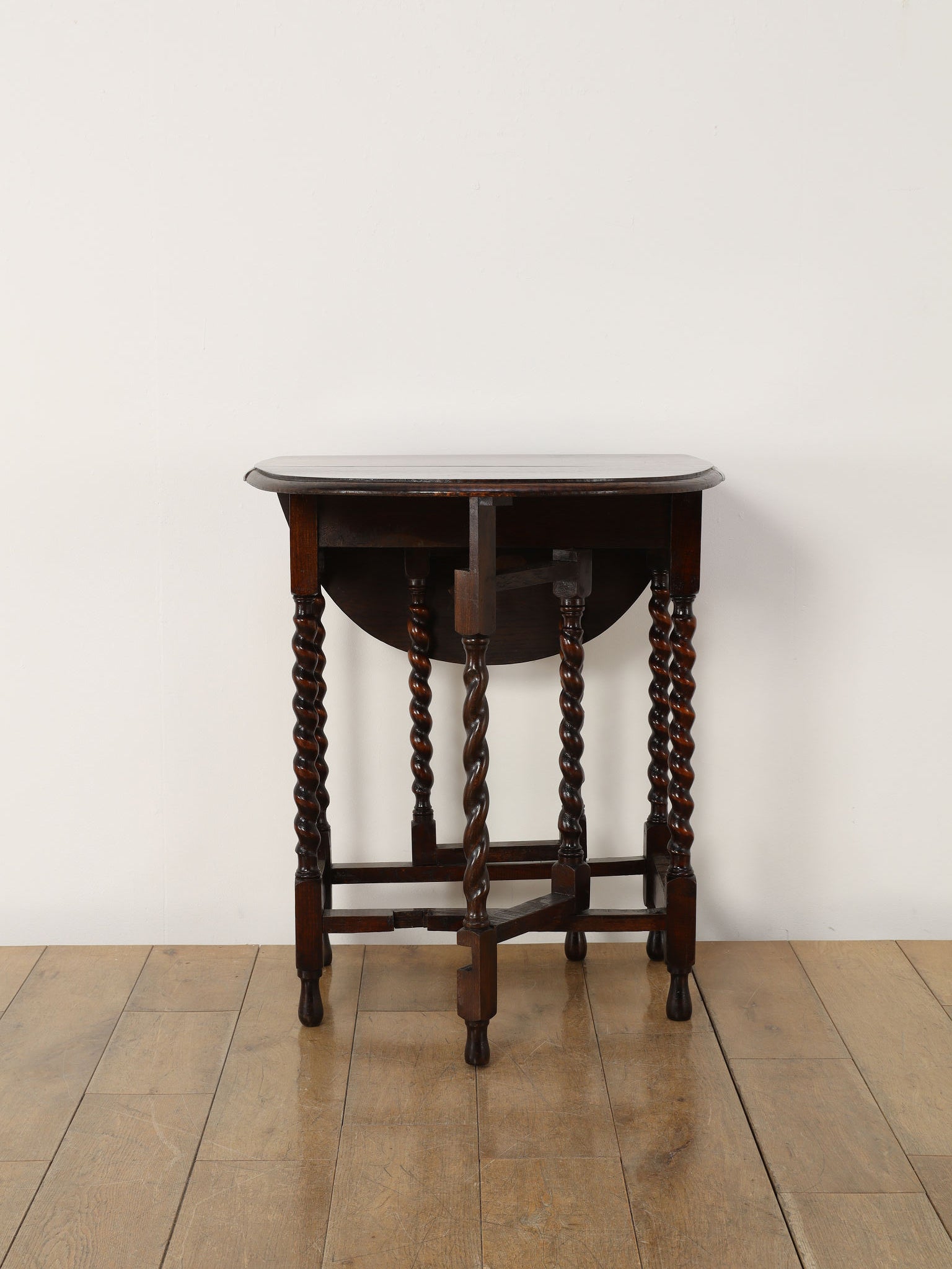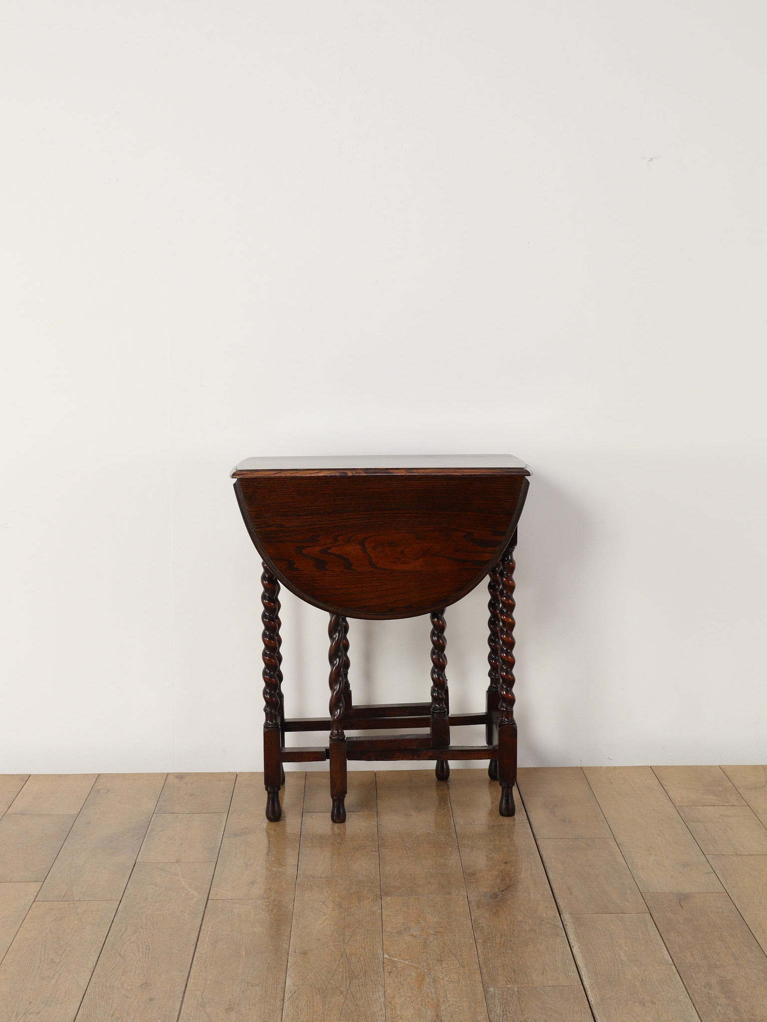 アンティークのダイニングの定番であるドローリーフテーブルと並び、現代の生活の中においても大変重宝するゲートレッグテーブル。左右の天板を折り畳むことができるバタフライスタイルのこちらのテーブルは、天板を支える脚部がゲート(門)のように可動することから、このように呼ばれます。小振りなサイズから、メインのダイニングとして使用可能な大きなサイズまで存在し、ご用途に合わせてお選びいただけます。両側を畳んでいる際は壁付けにしてコンソールテーブル代わりにもなり、常に適したスタイルで空間でご使用いただけることでしょう。ティーテーブル、デスク、作業台等、用途は多岐に渡り、万能なゲートレッグテーブルは現代の住環境において活躍の場が多い一台です。