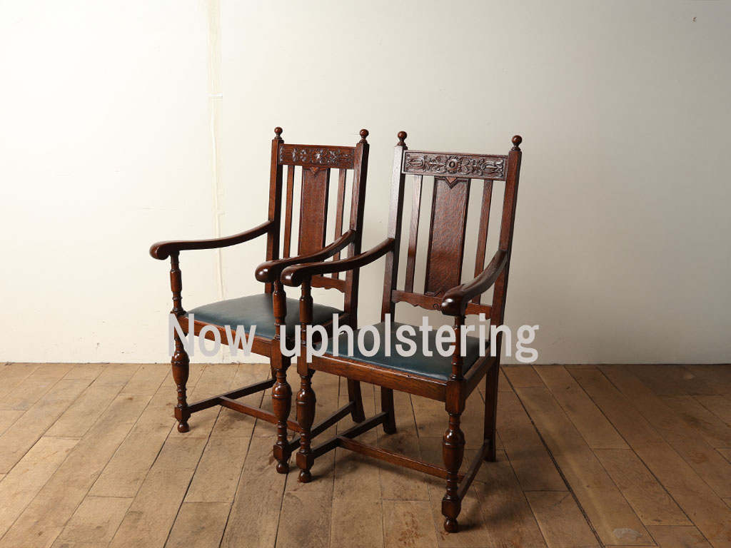 アンティークの定番であるダイニングチェアは、堅牢なオーク材を使用して作製される事が一般的でした。椅子の基本構造に忠実に作られたチェアは、その殆どを組み木によって構成されており、シンプルな構造はその後の修理等のしやすさも考えられ、末永く使用する工夫が多く見受けられます。その一つとして、落とし込みと呼ばれる座面の構造は、木枠に張り込まれたクッション部分を容易に外すことが出来るというもの。張替えの際などは、座面だけ修理に持ち込む事が出来る事はもちろん、お気に入りの生地を被せて設置するだけで、チェアの印象を大きく変える事が出来ます。機能的な面はもちろんの事、家具のある生活を楽しむ工夫であり、100年以上引き継がれる所以を感じられる事でしょう。こちらはベースのダイニングスタイルにアームがついた安楽性にも優れたアイテム。イージーチェアとしての使用にも適しており、日々使い込むことで生まれていく経年変化も楽しみです。