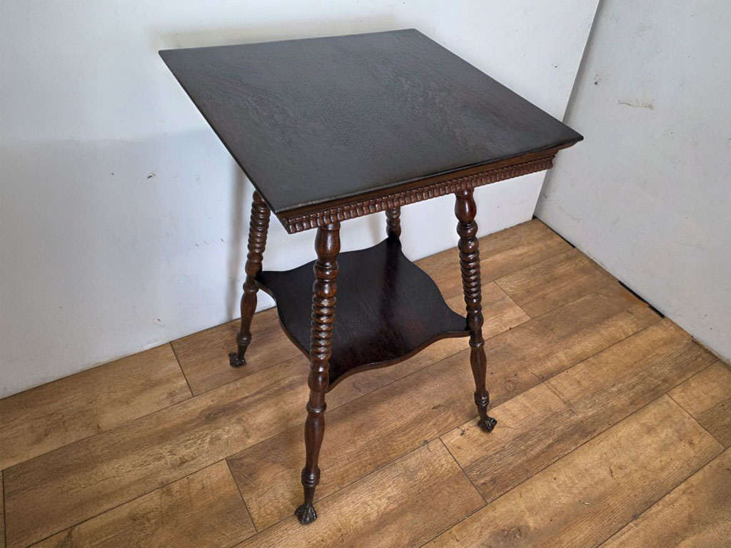 1920年代(推定)、ツイストデザインが美しいオケージョナルテーブルです。特徴的なのは、四隅を支えるツイスト(ねじり)加工された柱状の脚と、その下部のボール・アンド・クロウ(鷲の爪と玉)の意匠です。天板下や中板の縁にも装飾が施され、細部にまでアンティーク家具ならではのこだわりを感じさせる洗練されたデザインです。約100年の時を経て、濃く深い色味を纏ったオーク材の木目が、重厚ながらもエレガントな存在感を放ちます。