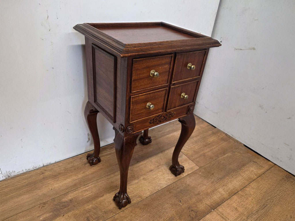 1920年代(推定)、優雅な曲線美が際立つ英国アンティークのマホガニー製チェストです。約100年の時を経て、深い赤みを帯びたマホガニー材が格調高い雰囲気を醸し出しています。コンパクトながらも、4つの引き出しと、優美なカーブを描くカブリオールレッグ(猫脚)の足元には、伝統的なボール・アンド・クロウ(鷲の爪と玉)の彫刻が施され、確かな存在感を放ちます。天板のフチが高くなっているデザインは、置いたものが落ちにくく、実用性にも優れています。