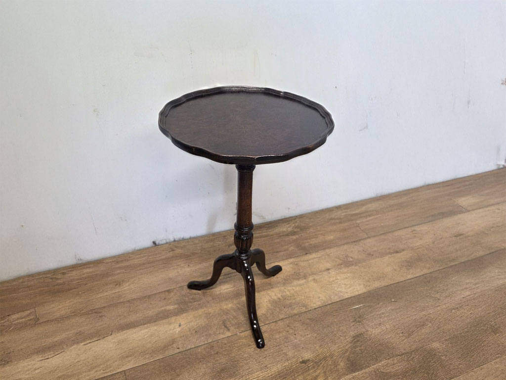 小ぶりなサイドテーブルとして定番のワインテーブル。その名の通りワイングラスやカップを置くようなサイズではありますが、この大きが大変扱いやすく、最大の魅力と言えます。ソファ周りでは、メインのコーヒーテーブルとは別に使用する事で、より快適な空間を作り上げる事が出来るでしょう。また、玄関先のホールテーブルや、ベッドサイドの小物置き等としても重宝致します。軽量なものが多く、容易に持ち運びが出来るため、シーンに応じてお使い頂けます。そのような利便性を備えながらも、トライポッドのディテールはアンティーク本来の雰囲気を存分に感じさせるデザインであり、小ぶりながらもコーディネートのよいポイントになってくれる事でしょう。こちらは玉杢と呼ばれるウォルナット特有の杢目が美しく、小ぶりながらも存在感のある一台。パイクラフトと呼ばれる縁が立ち上がったデザインは、より華やかな印象を与えるだけでなく、置いたものの落下を防ぐといった利点もあります。
