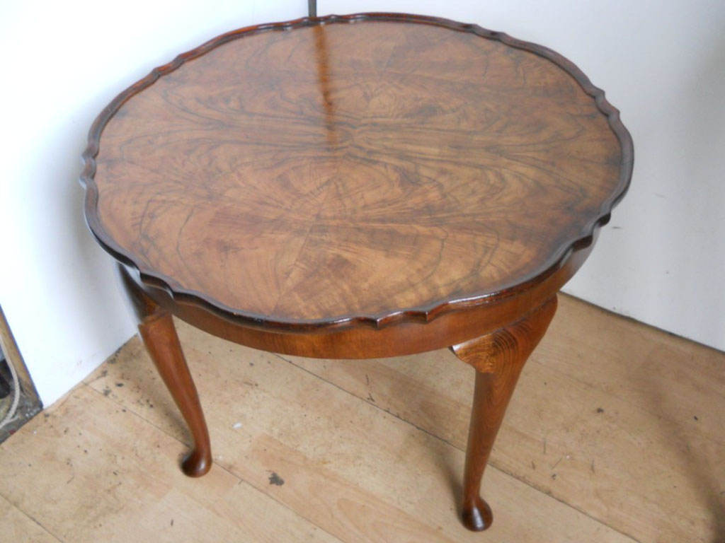 主に、ソファと合わせる事を前提に作製されたコーヒーテーブルですが、アンティークにおいて実に様々なデザインやサイズが存在し、玄関先ではホールテーブルとして、寝室ではベッドサイドに、リビングでは植物を置きプラントスタンドとして等、その用途や設置場所は幅広く対応致します。現代の一般的なローテーブルよりも天板高が高いものが多く、カップやお皿などをおいた時に手が届きやすいといった利点もあります。オーク、マホガニー、ウォルナットと材質も多岐に渡り、お部屋の雰囲気に合わせてお好みの一台を探すプロセスも楽しいものになる事でしょう。こちらはウォルナットの流れるような杢目が美しく、繊細な脚部とマッチしており実に軽やかな印象。お持ちのインテリアとのコーディネートを楽しみながら、ご使用下さい。