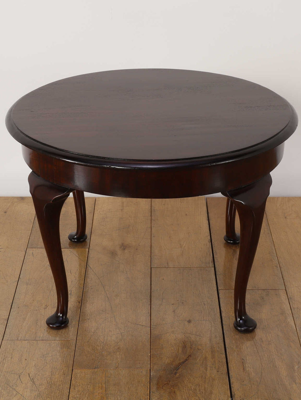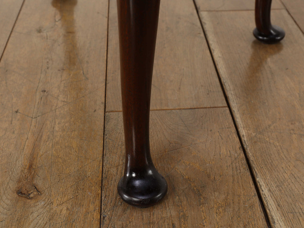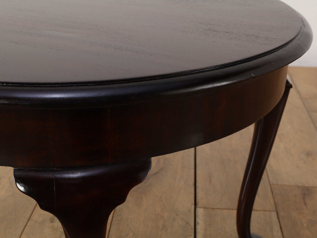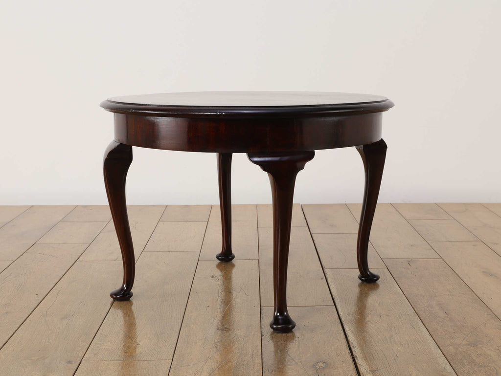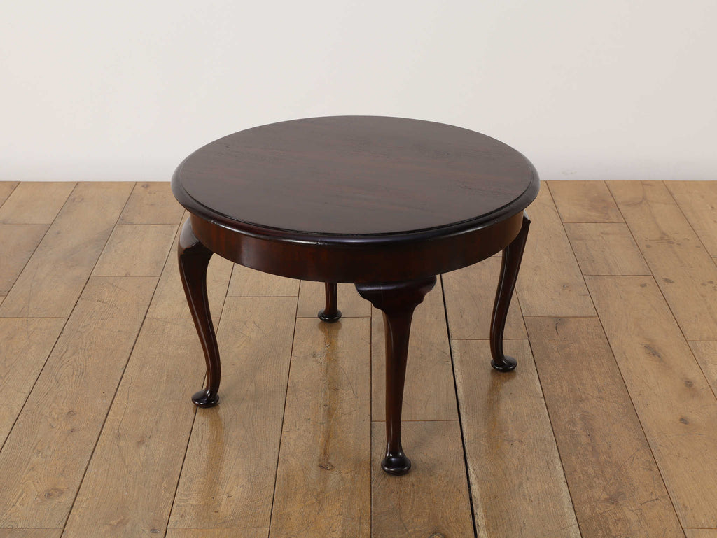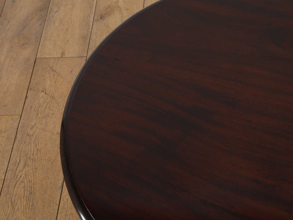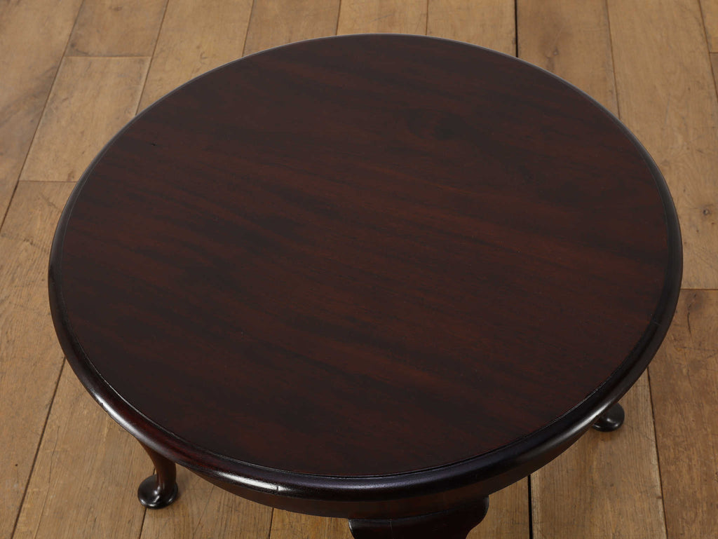 1920年代(推定)にイギリスで製作されたと推定される、優雅な英国アンティークです。素材には、時とともに深い色合いを増すマホガニー材を使用。丁寧に磨き上げられた天板は、美しい木目を漆黒に近い深い色で包み込み、光を受けて上品な艶を放ちます。この風格ある色調は、100年の時を経てきたマホガニー材の深い味わいの証です。デザインの特徴は、丸い天板を支える緩やかな曲線を描く猫脚(カブリオールレッグ)と、軽やかさと安定感を両立した3本脚。クラシックな様式美がありながら、装飾を抑えたシンプルな佇まいは、現代のモダンなインテリアにも調和する普遍的なデザイン性を持っています。ソファの前に置いて、優雅なティータイムを演出するリビングの中心として、または、落ち着いた雰囲気の書斎で、サイドテーブルとして。空間に洗練されたアクセントを加えてくれるでしょう。