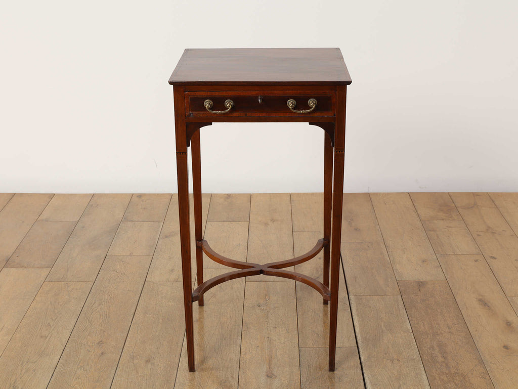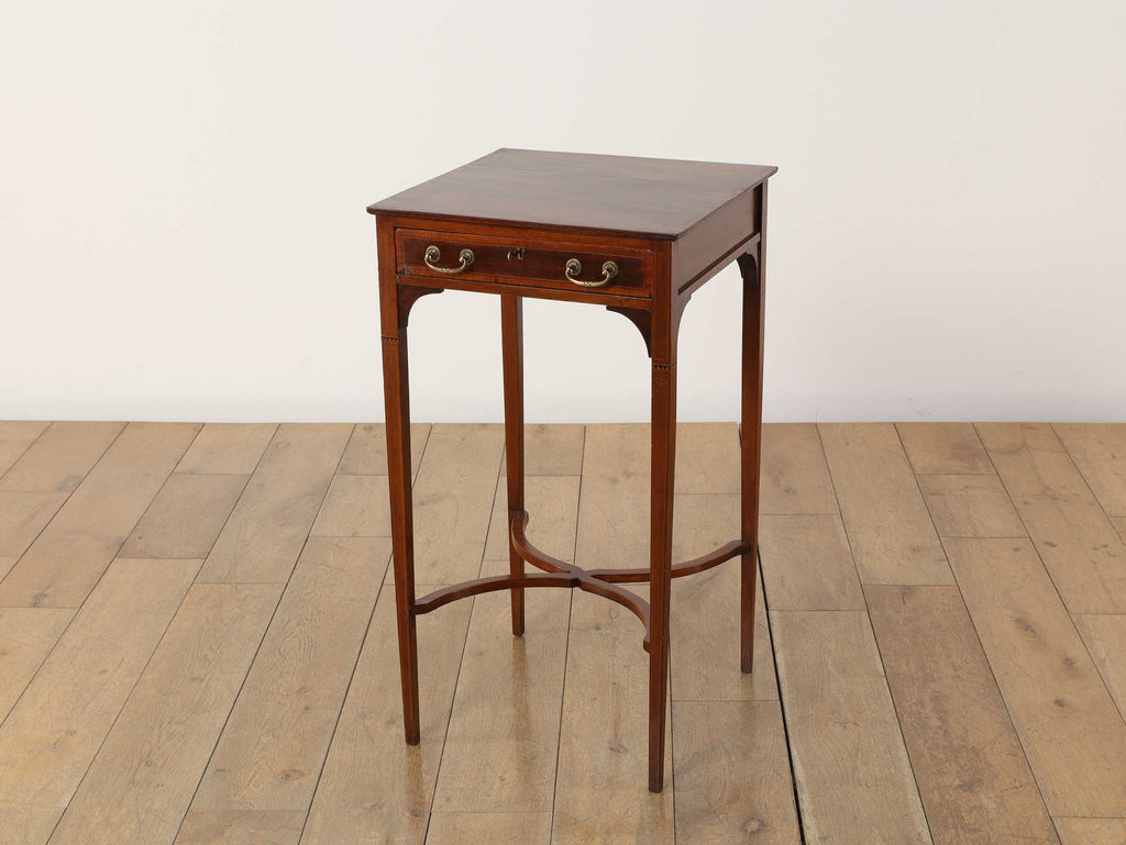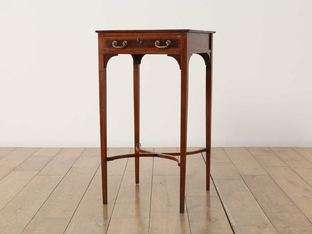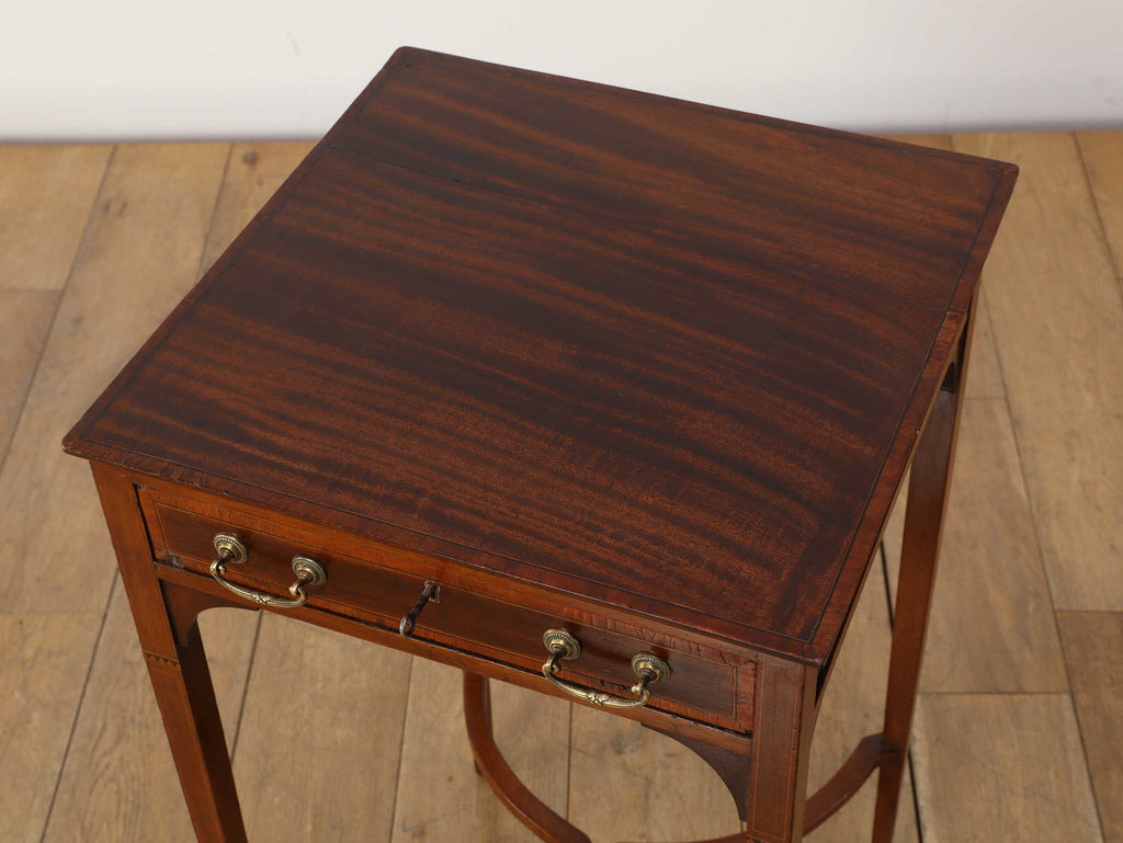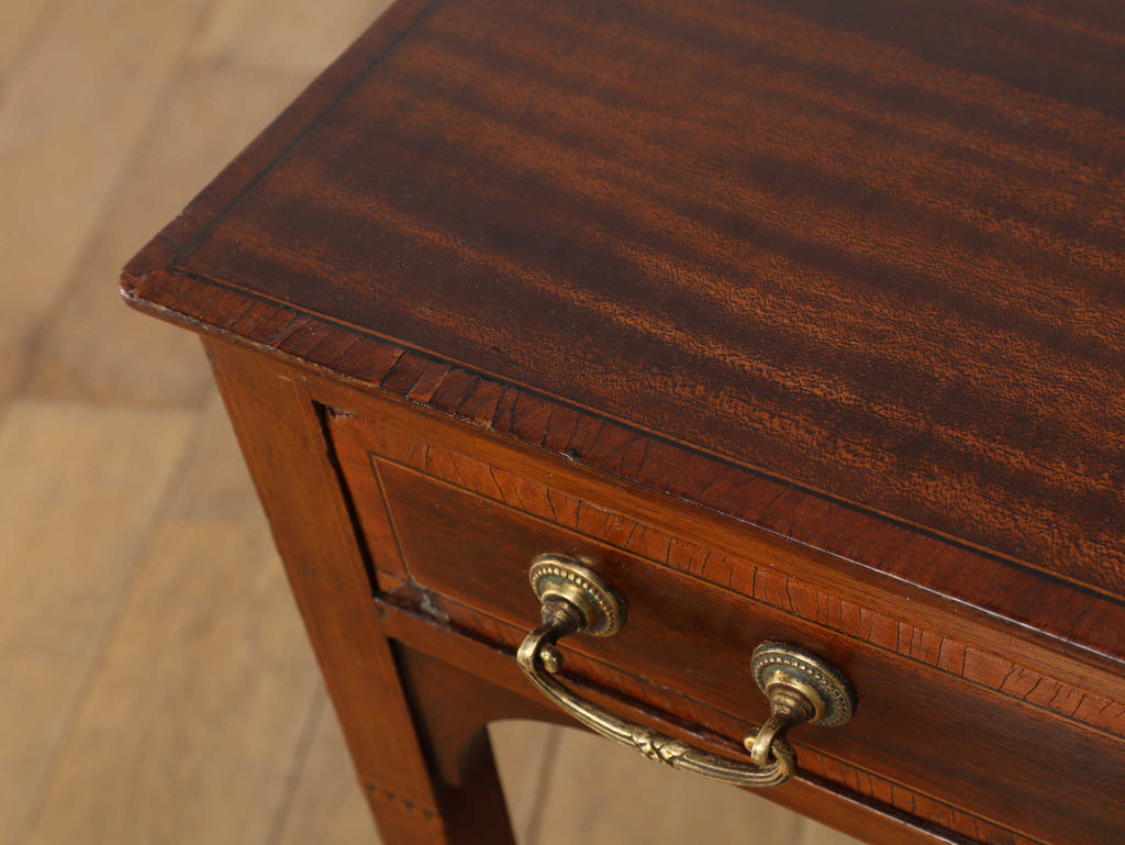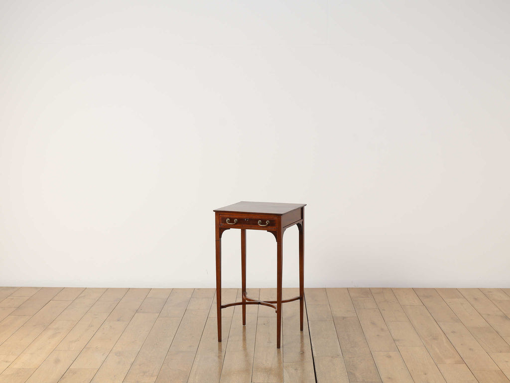 1900年代(推定)の英国製、オケージョンテーブルです。サテンウッドの深みのある色合いと、時を重ねたことで生まれた100年以上の時を経てきた木材の深い味わいが、静謐な雰囲気を醸し出しています。このテーブルの魅力は、その優れたデザイン性にあります。直線的なシルエットの中に、脚部の優美な曲線とX字の貫がアクセントとなり、機能的ながらも洗練された印象を与えます。抽斗には真鍮製の美しい取っ手が取り付けられており、細部にまで当時の職人技が光ります。W400mm × D400mm × H730mmというコンパクトなサイズ感は、リビングのソファ脇でのサイドテーブルとして、また、書斎の電話台やランプテーブルとしても最適です。現代のモダンなインテリアにも調和する普遍的なデザイン性は、クラシックな空間だけでなく、シンプルな空間にも品格をもたらします。