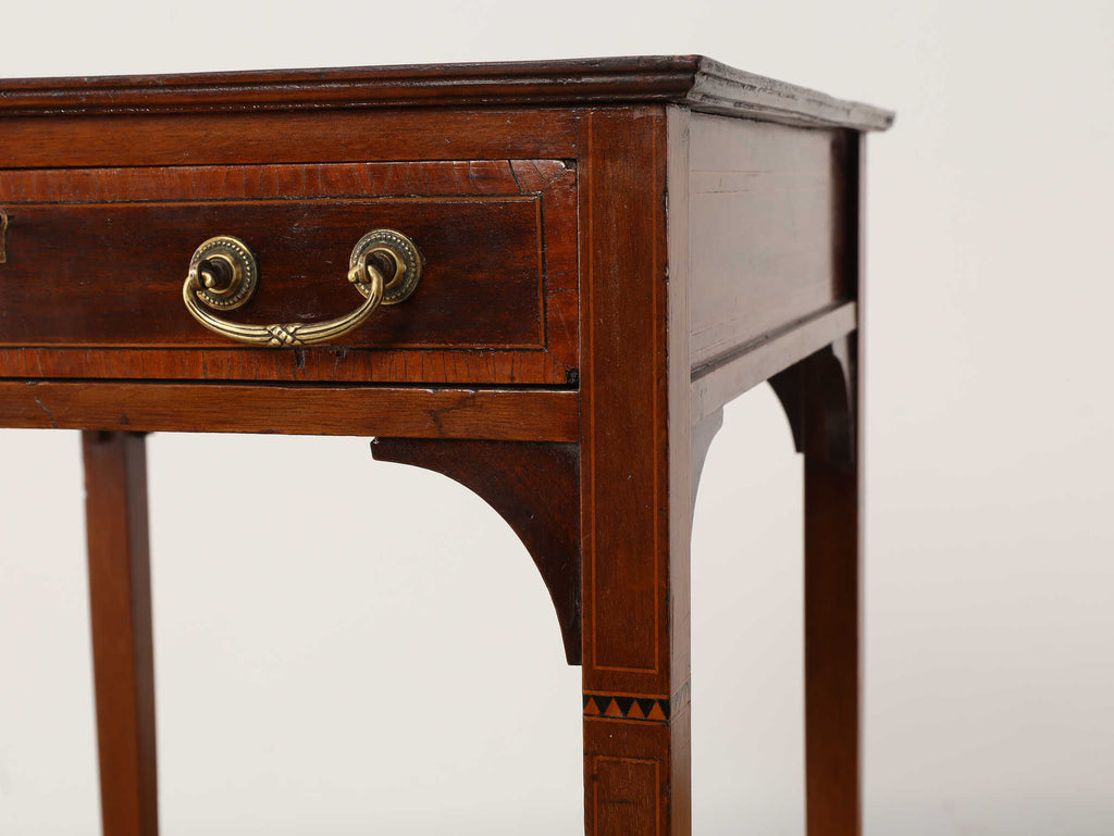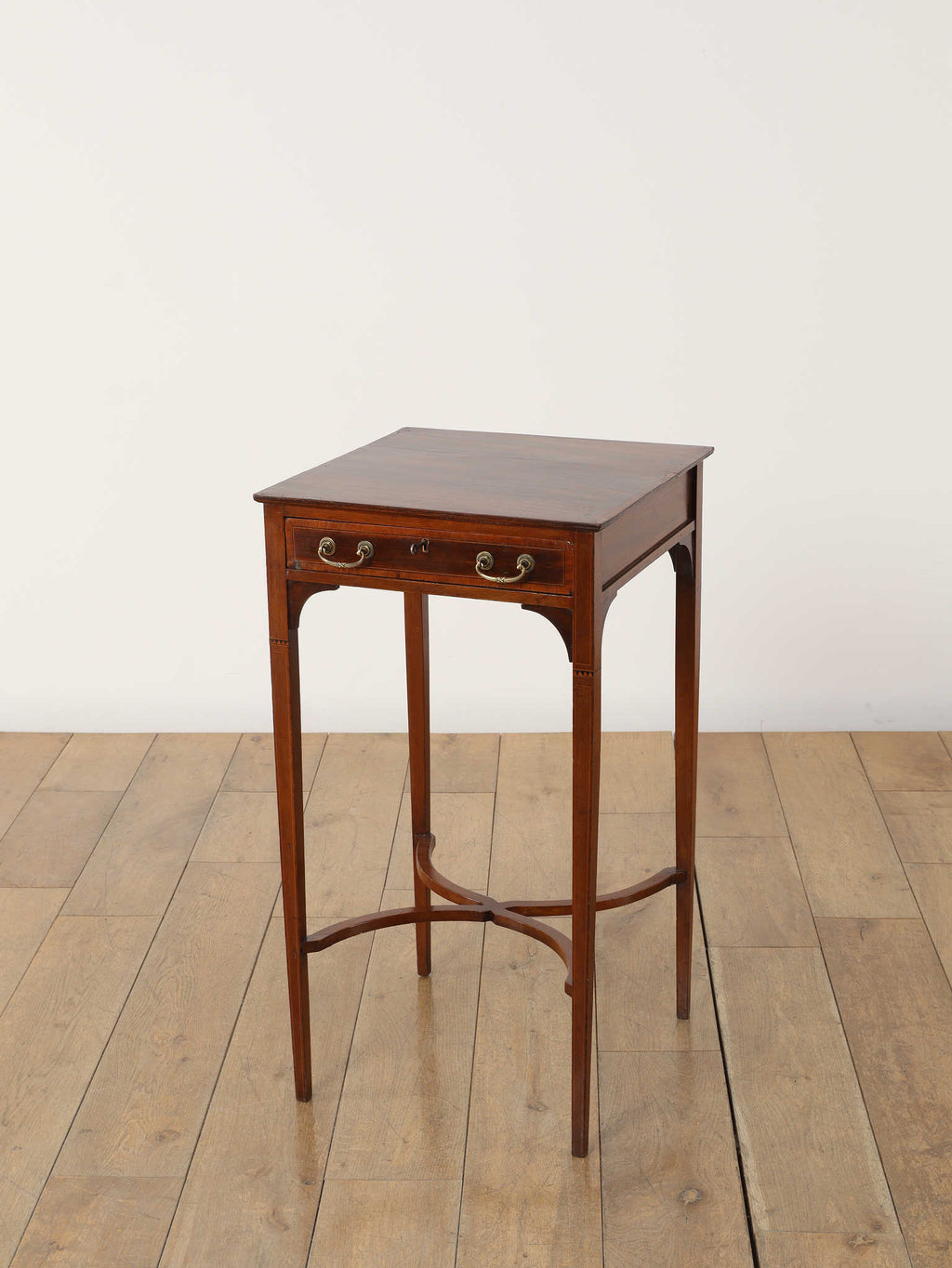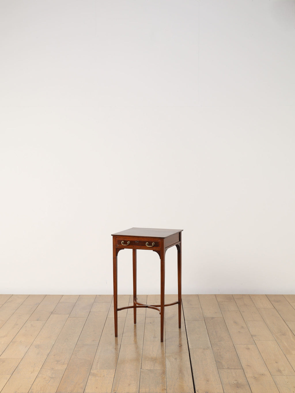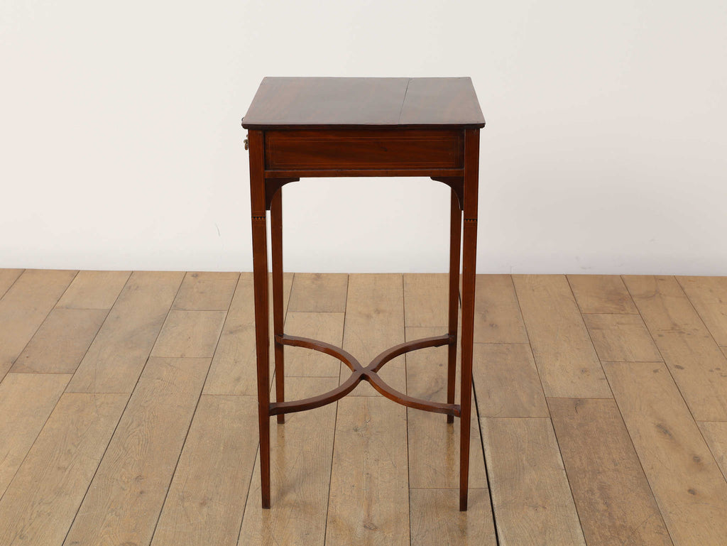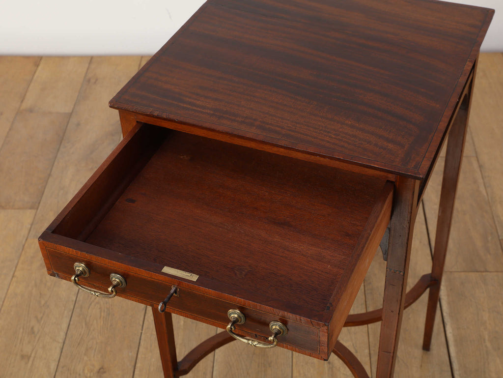 1900年代(推定)の英国製、オケージョンテーブルです。サテンウッドの深みのある色合いと、時を重ねたことで生まれた100年以上の時を経てきた木材の深い味わいが、静謐な雰囲気を醸し出しています。このテーブルの魅力は、その優れたデザイン性にあります。直線的なシルエットの中に、脚部の優美な曲線とX字の貫がアクセントとなり、機能的ながらも洗練された印象を与えます。抽斗には真鍮製の美しい取っ手が取り付けられており、細部にまで当時の職人技が光ります。W400mm × D400mm × H730mmというコンパクトなサイズ感は、リビングのソファ脇でのサイドテーブルとして、また、書斎の電話台やランプテーブルとしても最適です。現代のモダンなインテリアにも調和する普遍的なデザイン性は、クラシックな空間だけでなく、シンプルな空間にも品格をもたらします。
