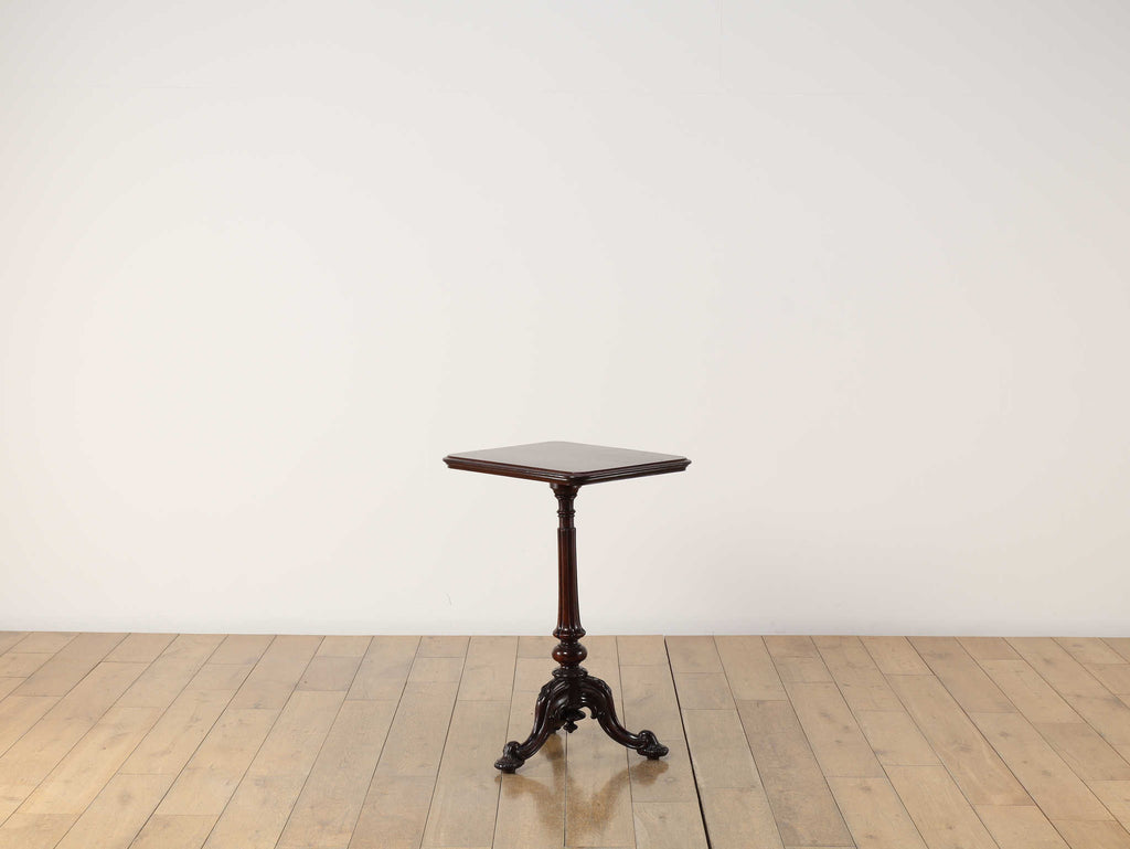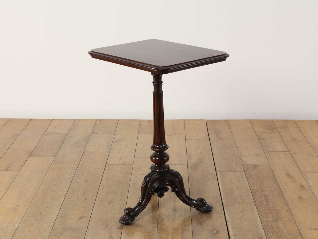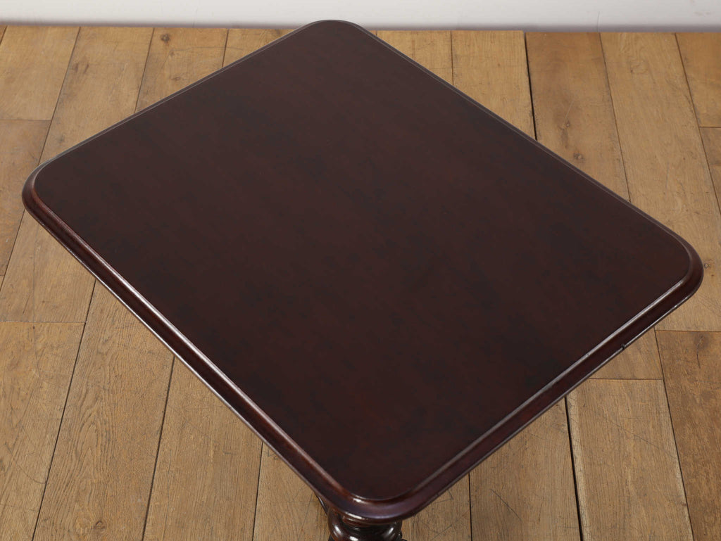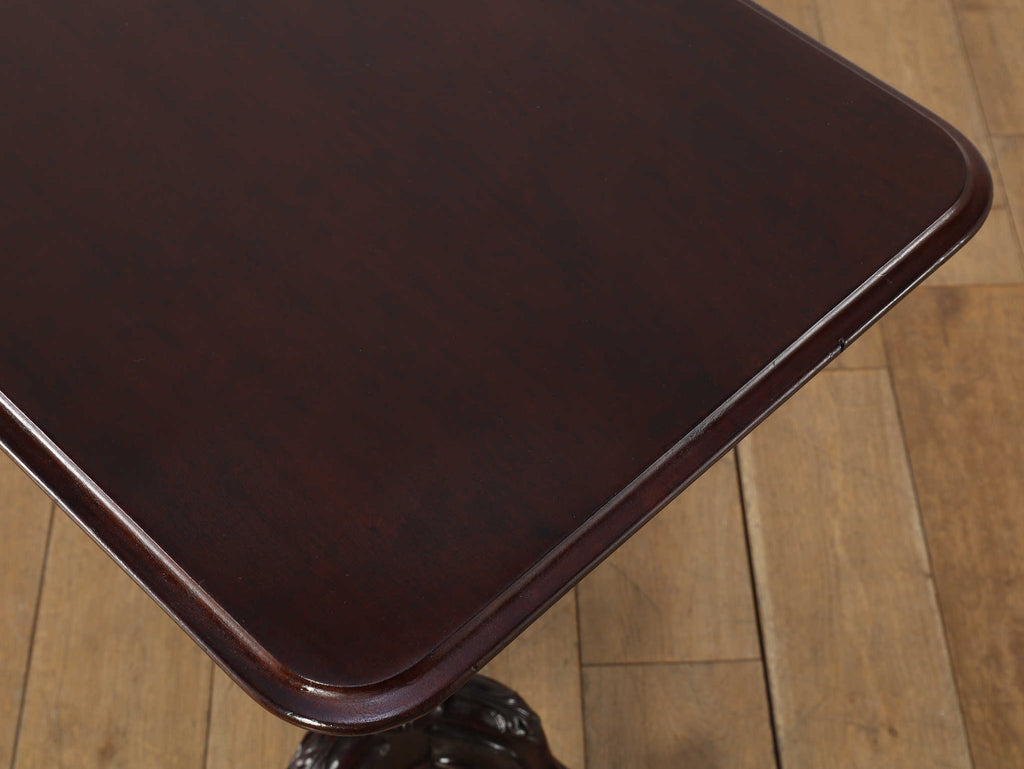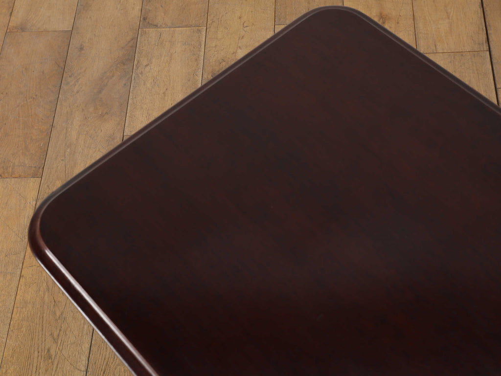 英国アンティークの歴史を刻むマホガニー材のテーブルです。150年以上の時を経たマホガニー材の深い味わいは、他に代えがたい魅力を放っています。艶やかな赤褐色の天板に浮かび上がる美しい木目は、当時の職人の丁寧な仕上げを感じさせます。このクラシックなデザインは、現代においてもその普遍的なデザイン性で、リビングや書斎といった空間に洗練されたアクセントをもたらします。ソファサイドのサイドテーブルとして、また、お気に入りのランプやオブジェを飾る台としても最適です。W510mm × D410mm × H725mmという取り回しの良いサイズ感も魅力の一つ。華奢でありながらも、しっかりとしたキャブフット(獅子の足)を模した脚元が、このテーブルに重厚感と安定感を与えています。