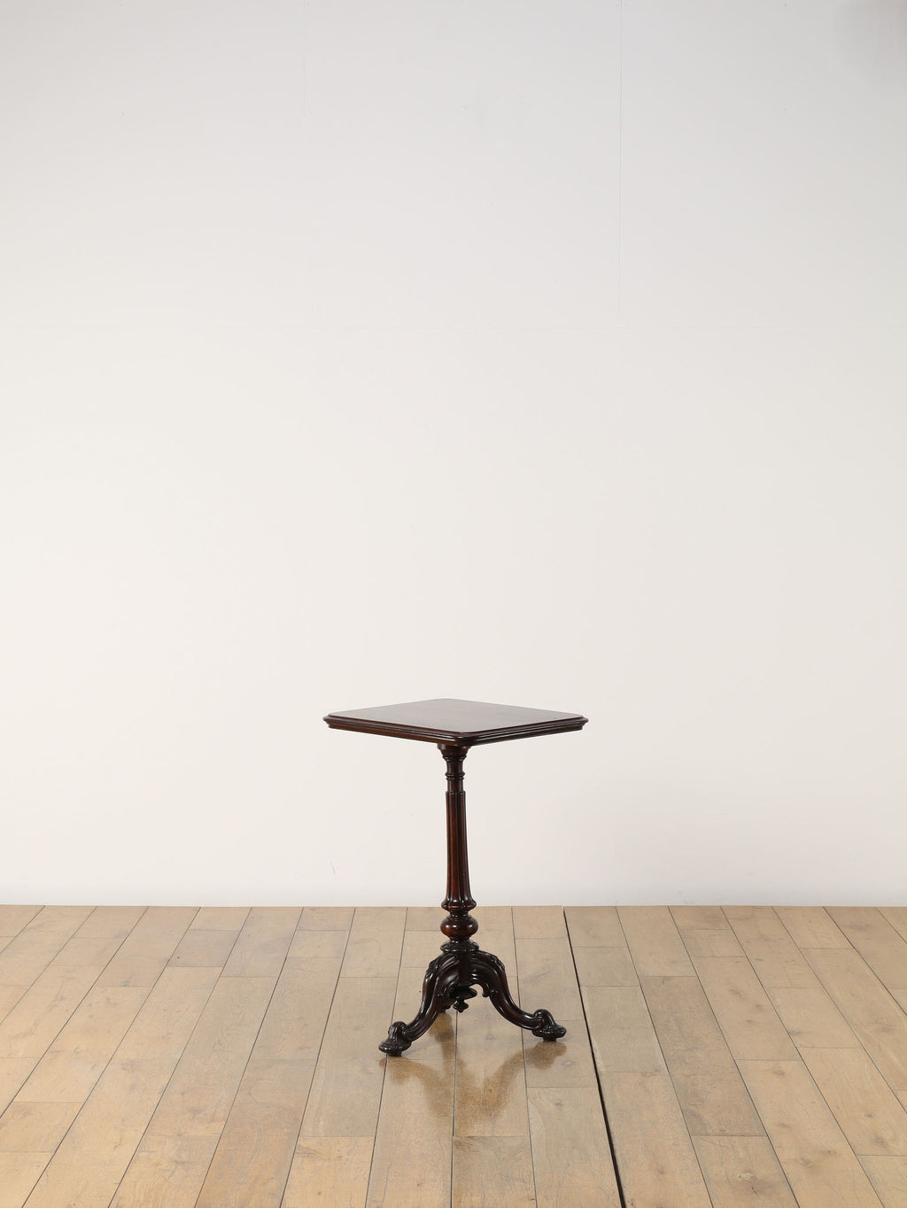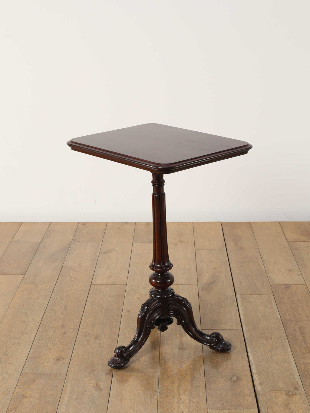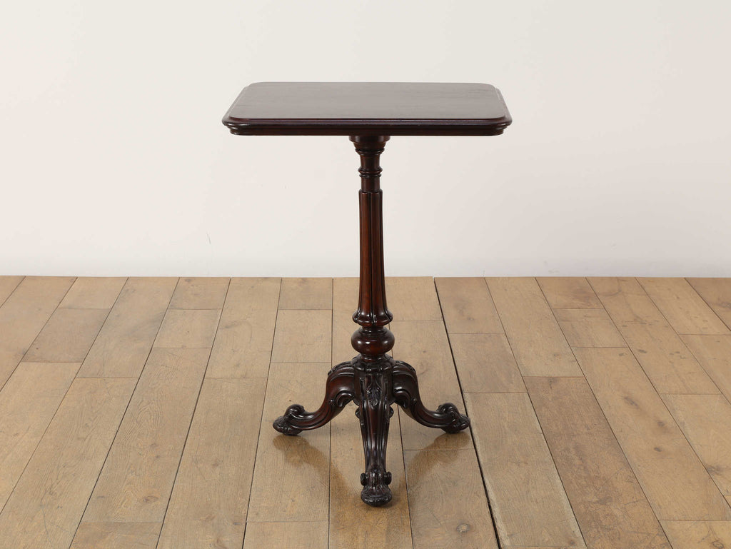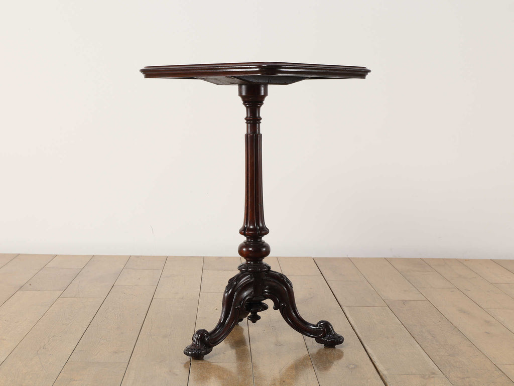 英国アンティークの歴史を刻むマホガニー材のテーブルです。150年以上の時を経たマホガニー材の深い味わいは、他に代えがたい魅力を放っています。艶やかな赤褐色の天板に浮かび上がる美しい木目は、当時の職人の丁寧な仕上げを感じさせます。このクラシックなデザインは、現代においてもその普遍的なデザイン性で、リビングや書斎といった空間に洗練されたアクセントをもたらします。ソファサイドのサイドテーブルとして、また、お気に入りのランプやオブジェを飾る台としても最適です。W510mm × D410mm × H725mmという取り回しの良いサイズ感も魅力の一つ。華奢でありながらも、しっかりとしたキャブフット(獅子の足)を模した脚元が、このテーブルに重厚感と安定感を与えています。