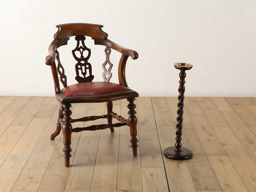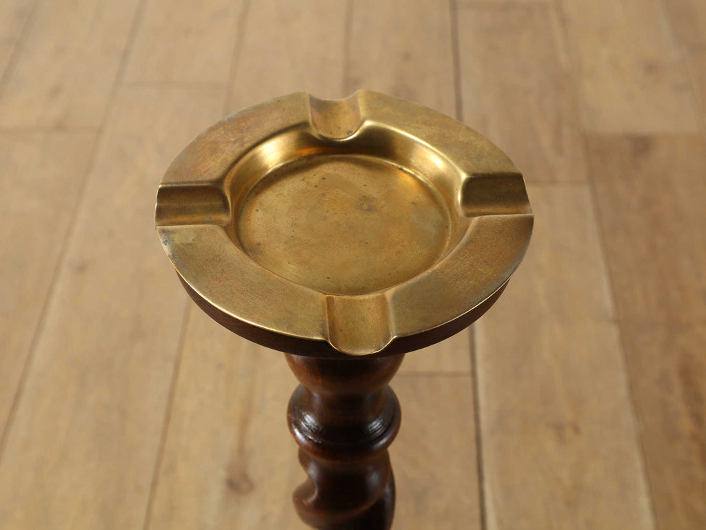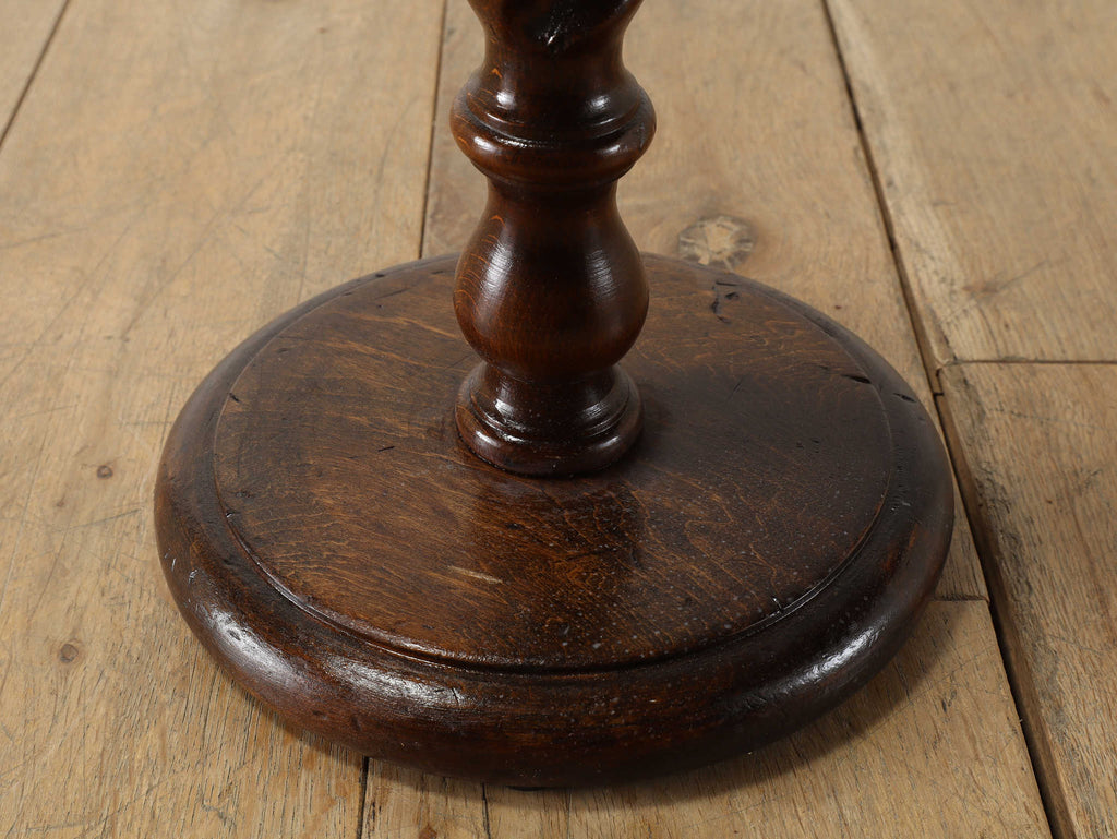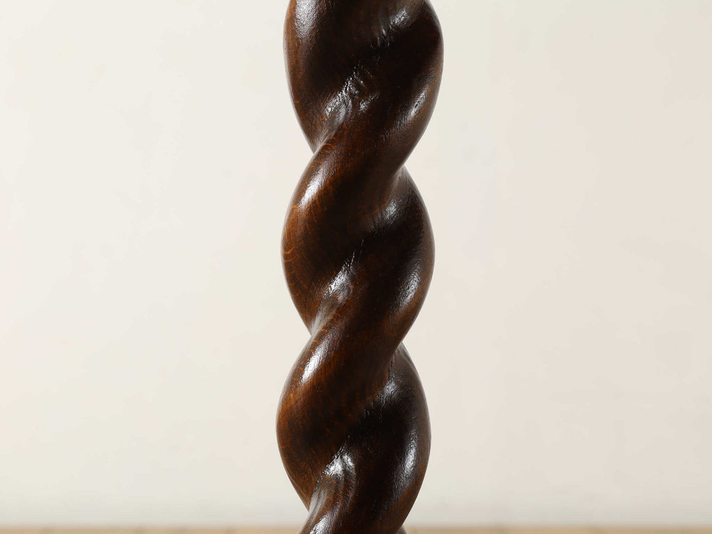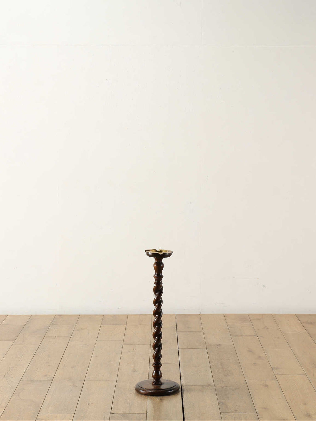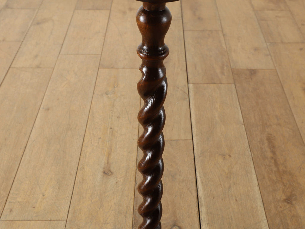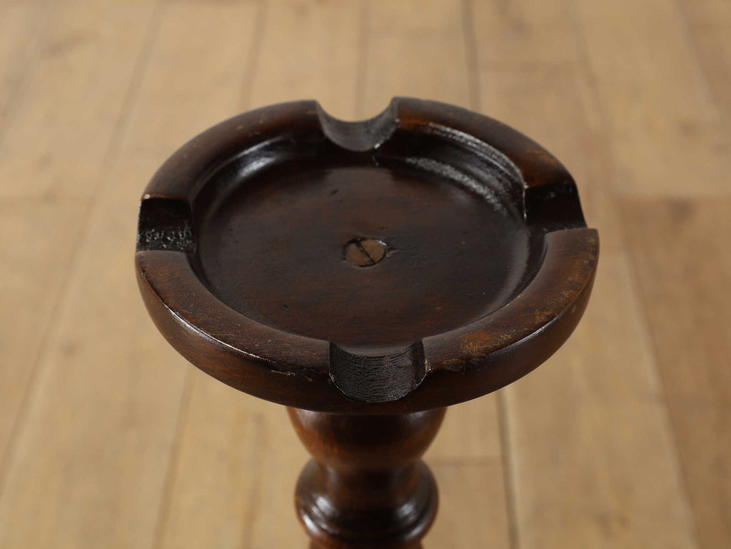 1920年代(推定)にイギリスで製造されたと推定されるこの灰皿スタンドには、重厚なオーク材が使用され、100年以上の時を経てきた深い味わいを醸し出しています。最大の魅力は、支柱に見られる美しいツイストレッグ(挽物細工)です。熟練の職人技が光るこの螺旋状の意匠は、シンプルな形にエレガントな動きを与え、空間に視覚的なアクセントを加えます。現代においては、スモーカーズスタンドとしてだけでなく、リビングの片隅や書斎のソファ横に置くミニマルな花台や、スマートフォン、ドリンクなどを置く便利なサイドテーブルとしても理想的です。細身でコンパクトなサイズは、置き場所を選ばず、現代のインテリアにも調和する普遍的なデザイン性を持っています。