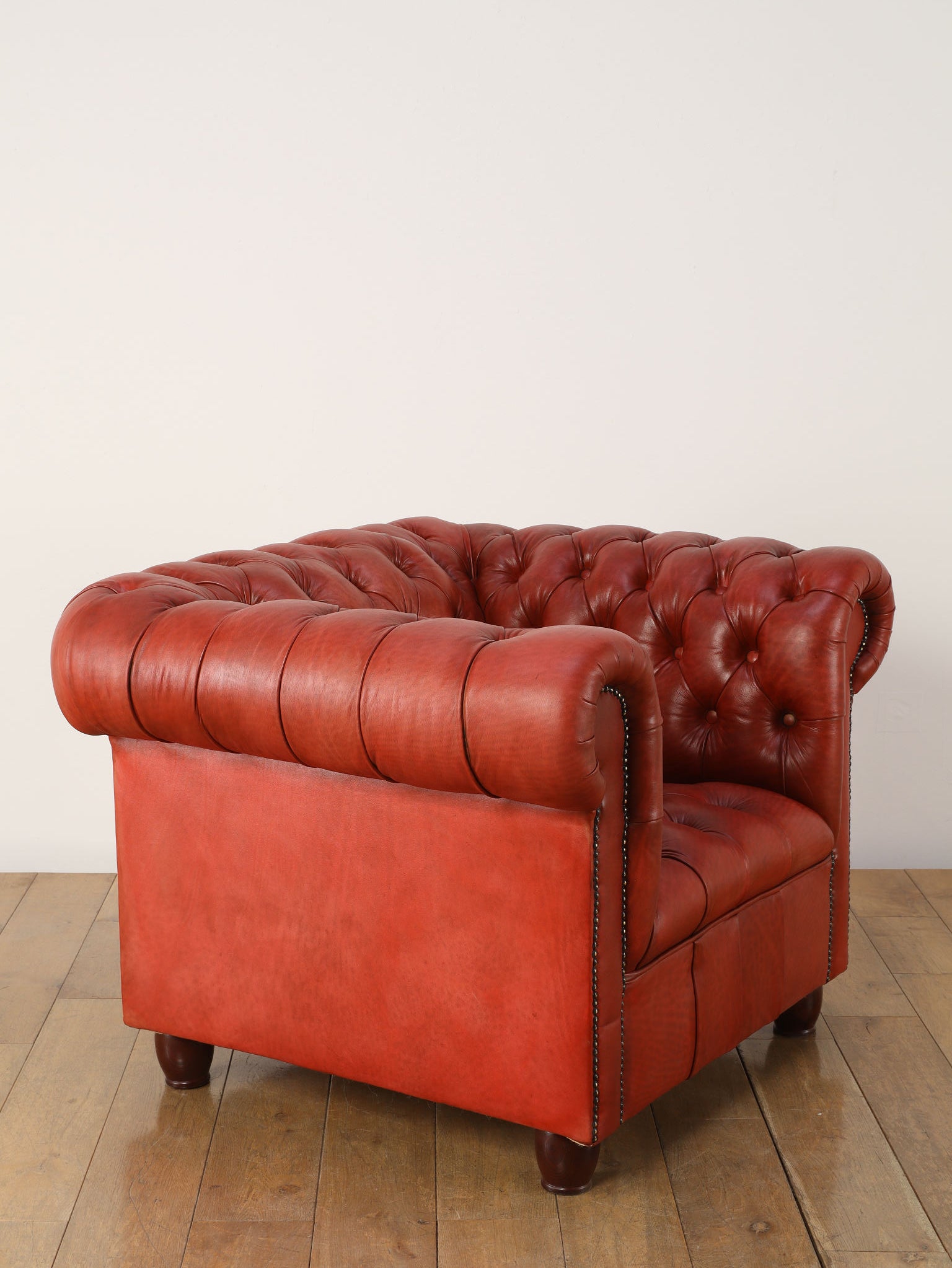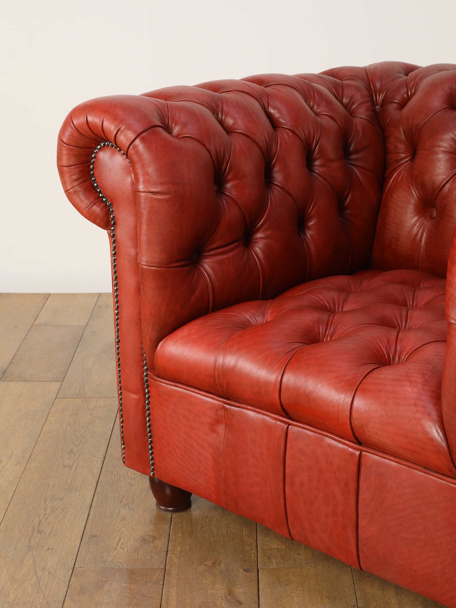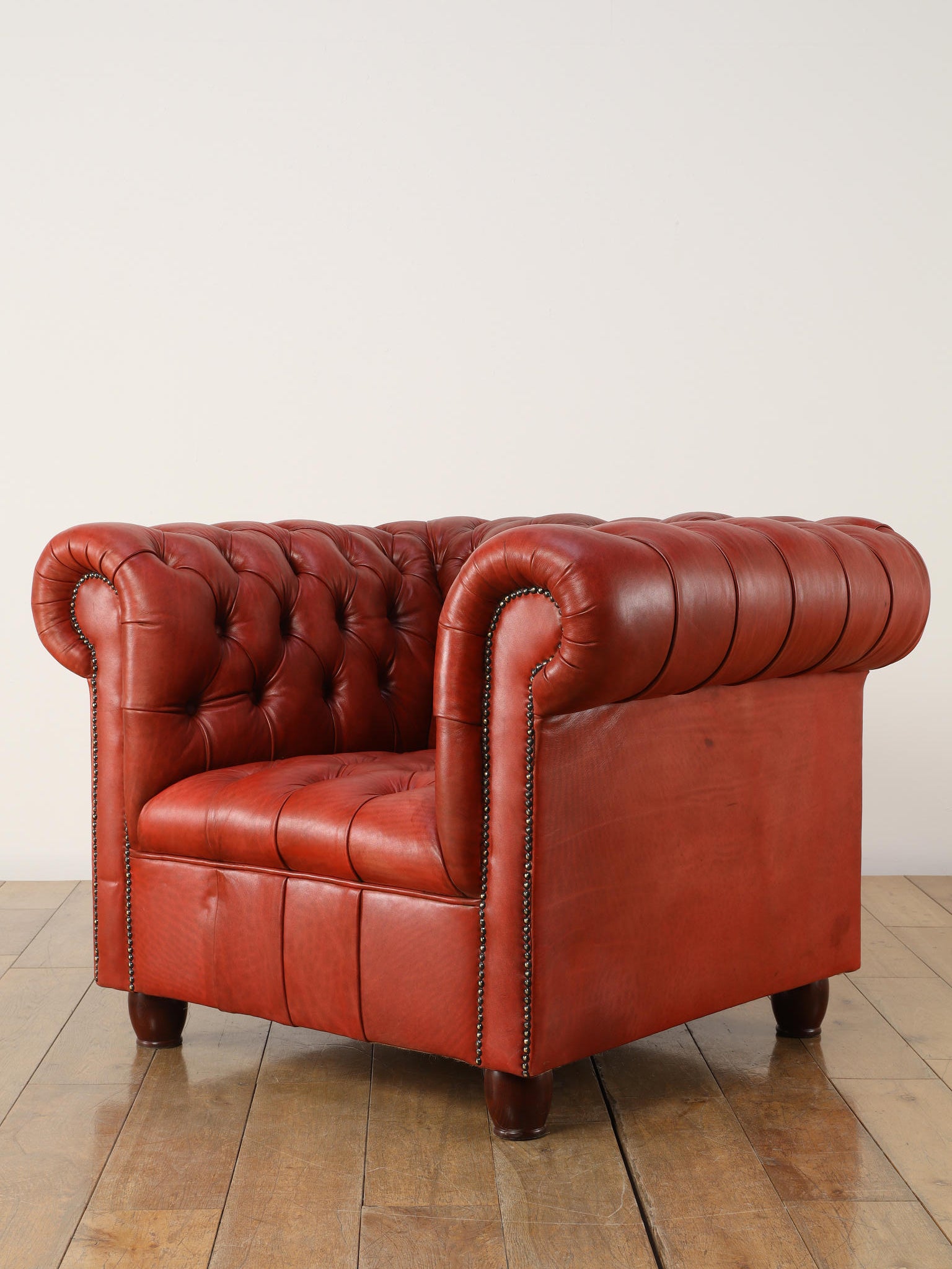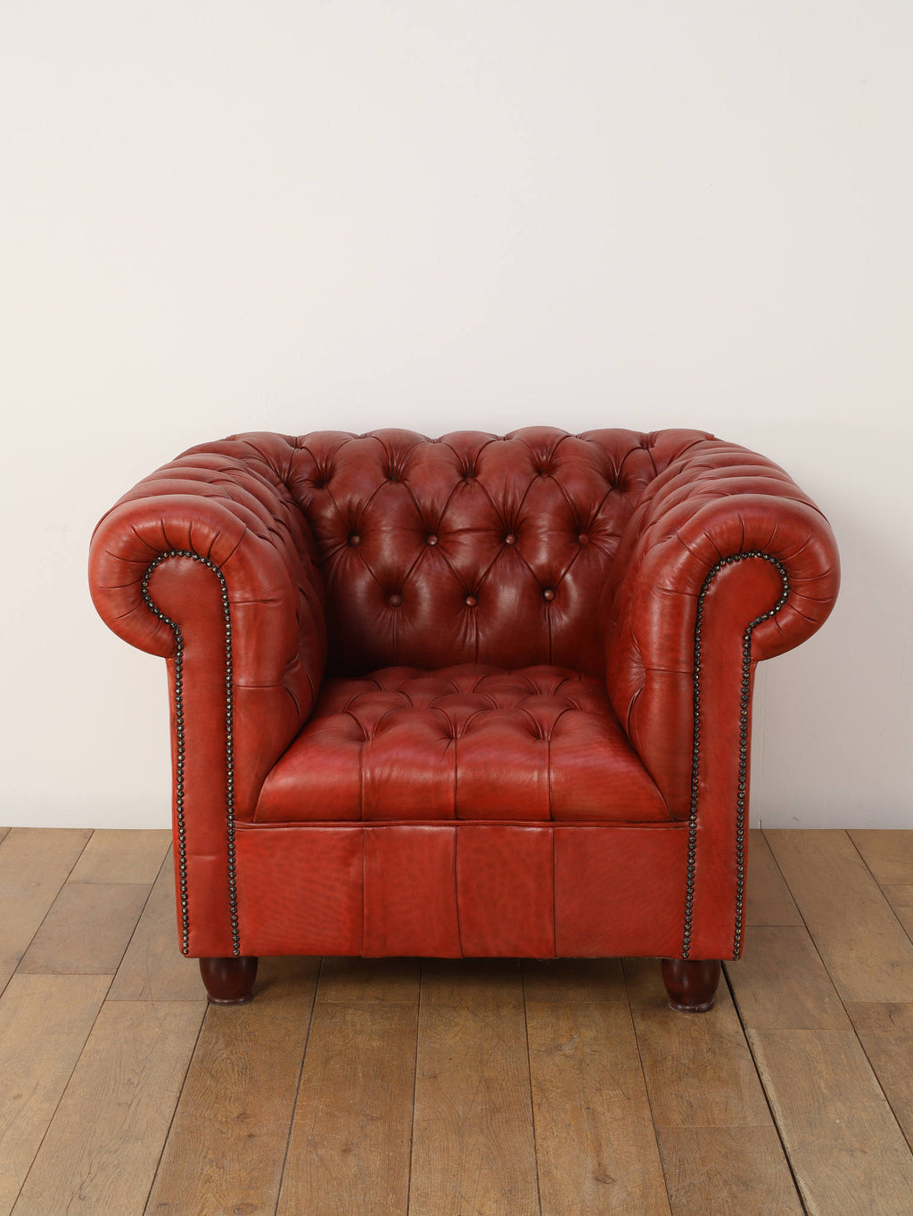 重厚感と気品あふれるデザインからイギリスにおいて伝統的なジェントルマンズスタイルの象徴的なアイコンとして認知されているチェスターフィールドチェア。名前の由来は、このスタイルのソファを愛用していたチェスターフィールド伯爵にちなんでいます。こちらの商品は1970年頃のヴィンテージの個体を現地英国のクラフトマンが素材選びから選定し、鍛錬に仕上げたヴィンテージフレームニューレザーの本物の1品です。垢のブナ材を使用した堅牢なフレームに、経年変化をイメージしながら、本革を選定しました。背面、シート部のボタン締めは圧巻であり、熟練職人による手作業の証が伺えます。タイムレスな魅力を持つこの商品は、伝統的なインテリアはもちろんのこと、モダンな現代シーンにも素晴らしいコントラストを生み出すでしょう。カラーは鮮やかなレッドになります。