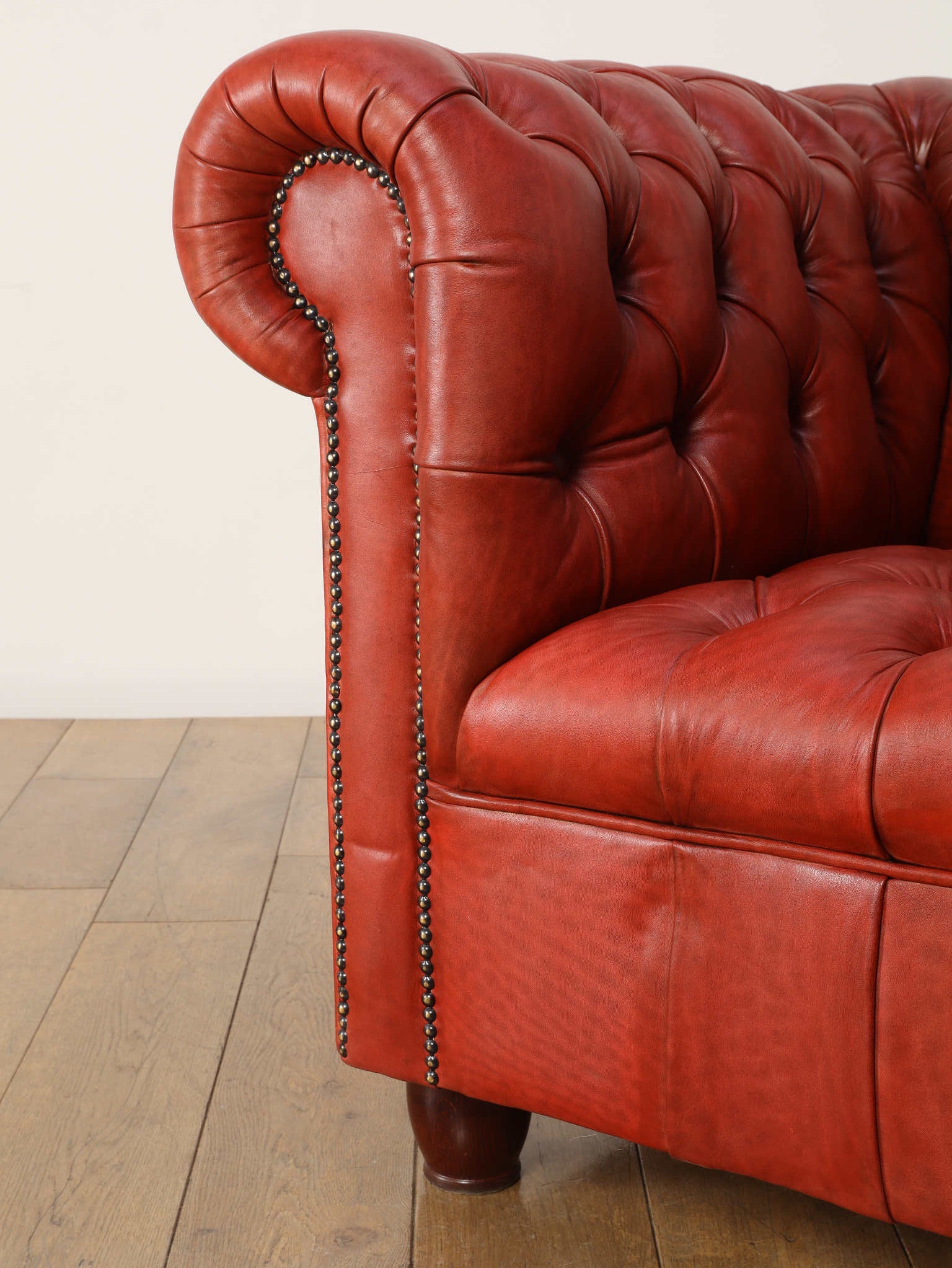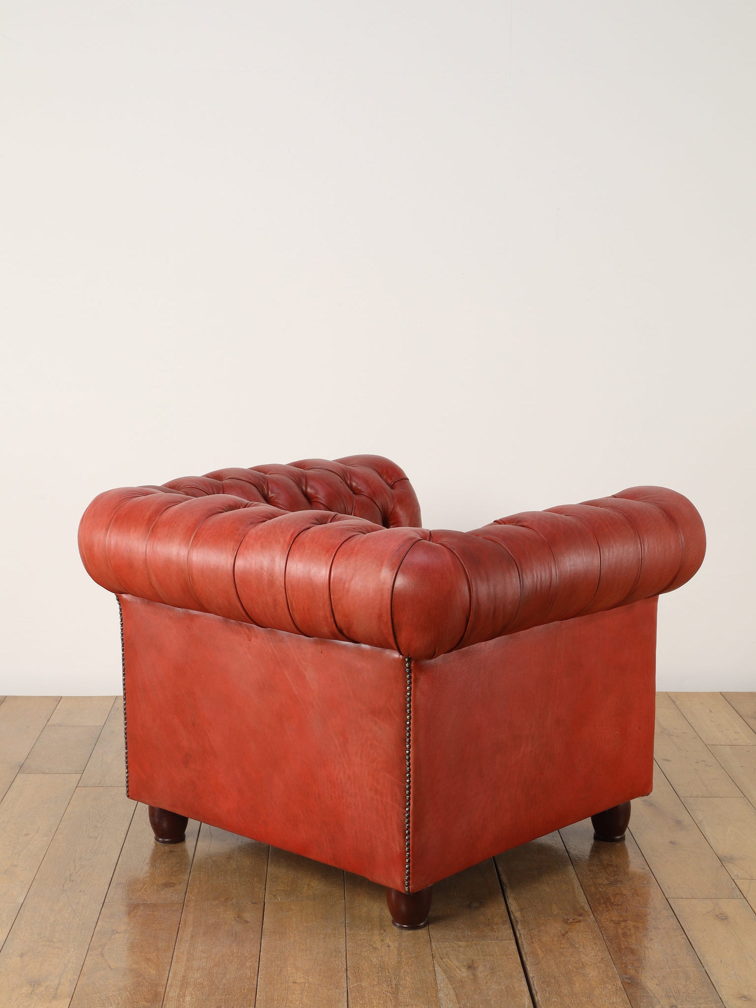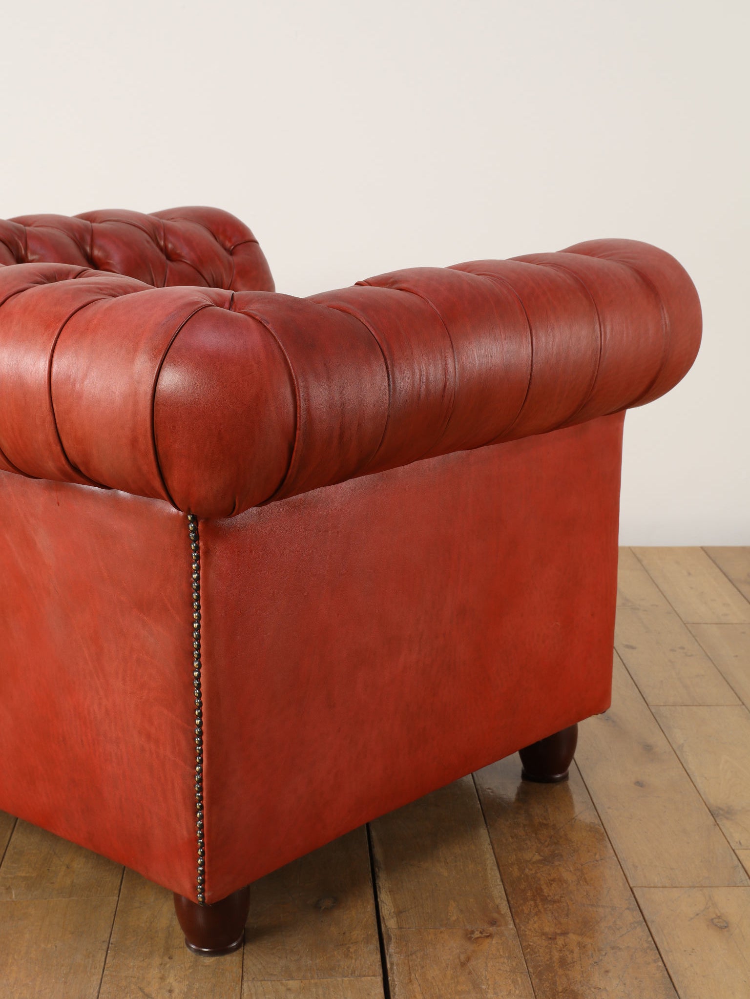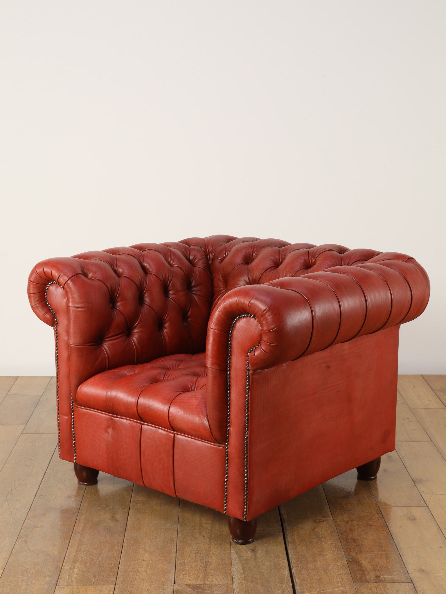 重厚感と気品あふれるデザインからイギリスにおいて伝統的なジェントルマンズスタイルの象徴的なアイコンとして認知されているチェスターフィールドチェア。名前の由来は、このスタイルのソファを愛用していたチェスターフィールド伯爵にちなんでいます。こちらの商品は1970年頃のヴィンテージの個体を現地英国のクラフトマンが素材選びから選定し、鍛錬に仕上げたヴィンテージフレームニューレザーの本物の1品です。垢のブナ材を使用した堅牢なフレームに、経年変化をイメージしながら、本革を選定しました。背面、シート部のボタン締めは圧巻であり、熟練職人による手作業の証が伺えます。タイムレスな魅力を持つこの商品は、伝統的なインテリアはもちろんのこと、モダンな現代シーンにも素晴らしいコントラストを生み出すでしょう。カラーは鮮やかなレッドになります。