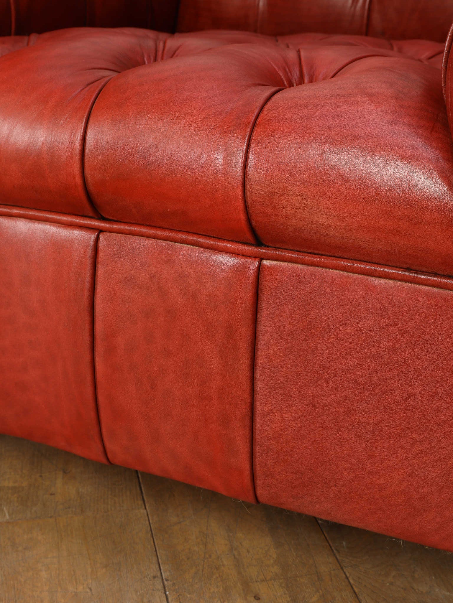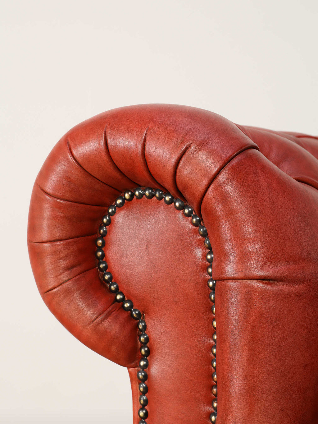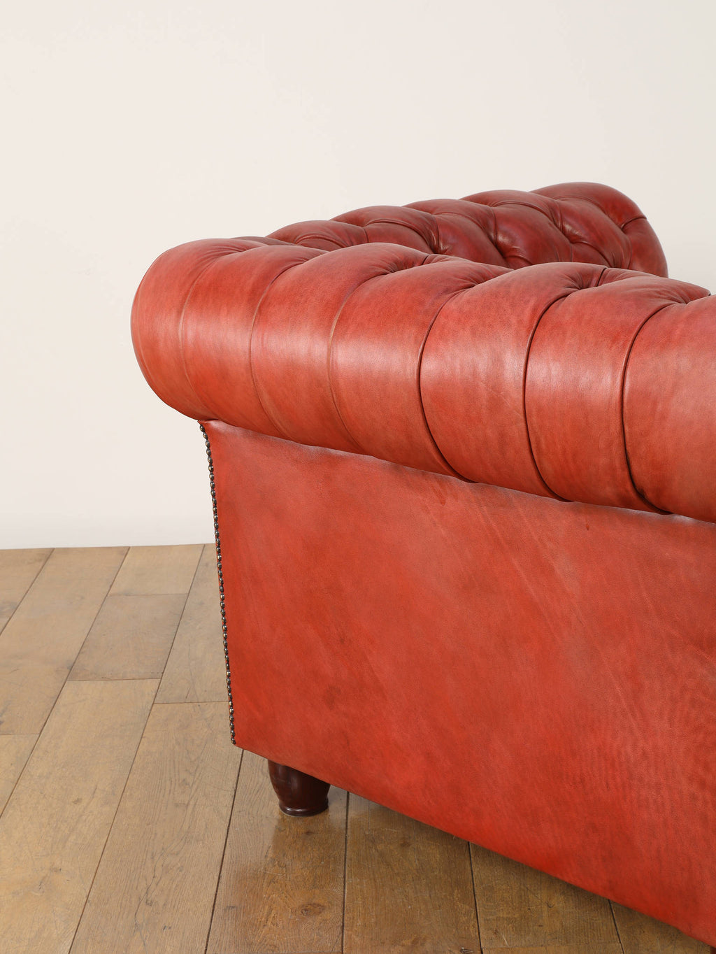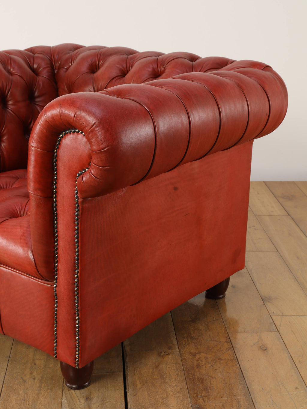 重厚感と気品あふれるデザインからイギリスにおいて伝統的なジェントルマンズスタイルの象徴的なアイコンとして認知されているチェスターフィールドチェア。名前の由来は、このスタイルのソファを愛用していたチェスターフィールド伯爵にちなんでいます。こちらの商品は1970年頃のヴィンテージの個体を現地英国のクラフトマンが素材選びから選定し、鍛錬に仕上げたヴィンテージフレームニューレザーの本物の1品です。垢のブナ材を使用した堅牢なフレームに、経年変化をイメージしながら、本革を選定しました。背面、シート部のボタン締めは圧巻であり、熟練職人による手作業の証が伺えます。タイムレスな魅力を持つこの商品は、伝統的なインテリアはもちろんのこと、モダンな現代シーンにも素晴らしいコントラストを生み出すでしょう。カラーは鮮やかなレッドになります。