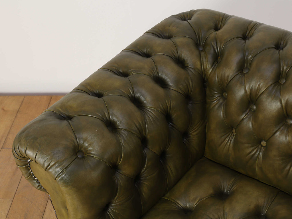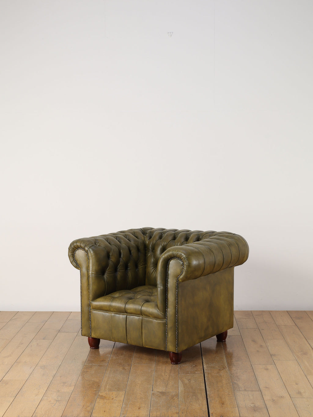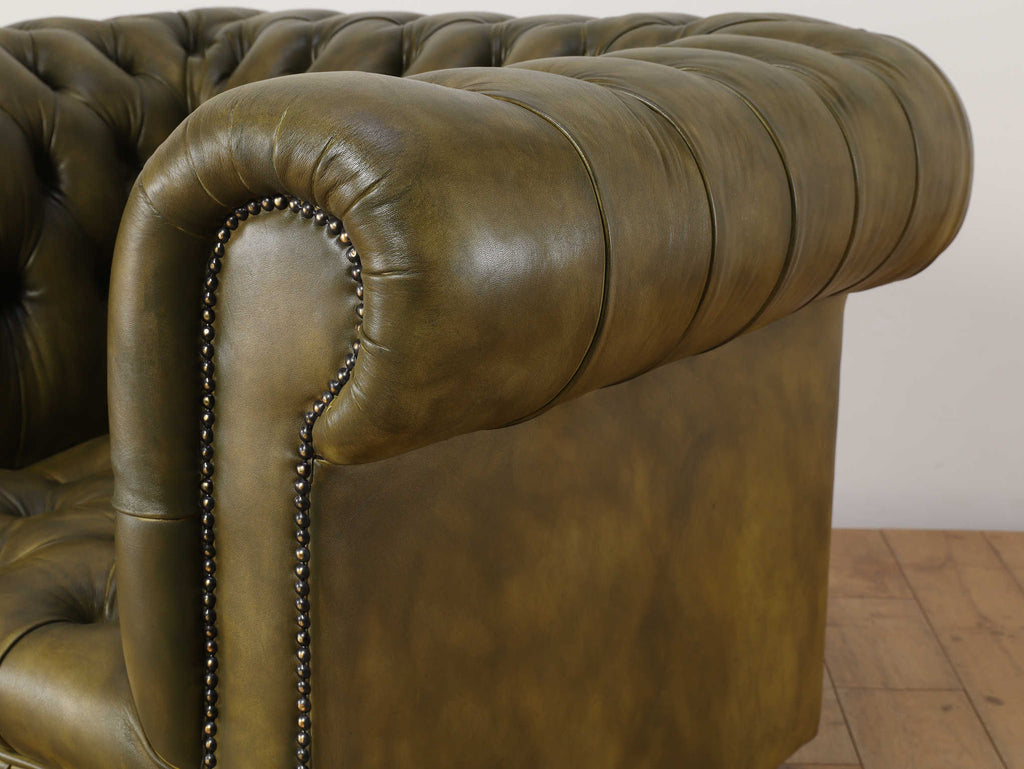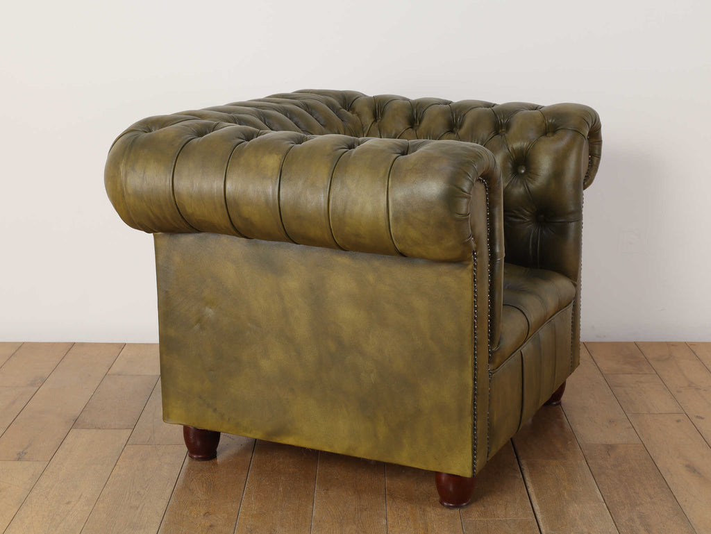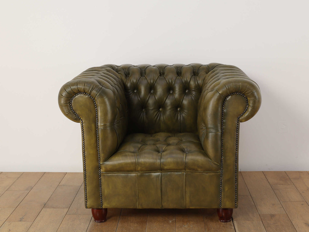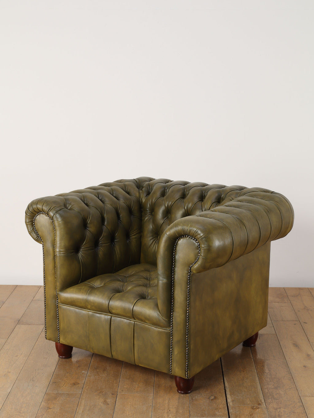 重厚感と気品あふれるデザインからイギリスにおいて伝統的なジェントルマンズスタイルの象徴的なアイコンとして認知されているチェスターフィールドチェア。名前の由来は、このスタイルのソファを愛用していたチェスターフィールド伯爵にちなんでいます。こちらの商品は1970年頃のヴィンテージの個体を現地英国のクラフトマンが素材選びから選定し、鍛錬に仕上げたヴィンテージフレームニューレザーの本物の1品です。垢のブナ材を使用した堅牢なフレームに、経年変化をイメージしながら、本革を選定しました。背面、シート部のボタン締めは圧巻であり、熟練職人による手作業の証が伺えます。タイムレスな魅力を持つこの商品は、伝統的なインテリアはもちろんのこと、モダンな現代シーンにも素晴らしいコントラストを生み出すでしょう。カラーは深みのあるモスグリーン、オリーブになります。