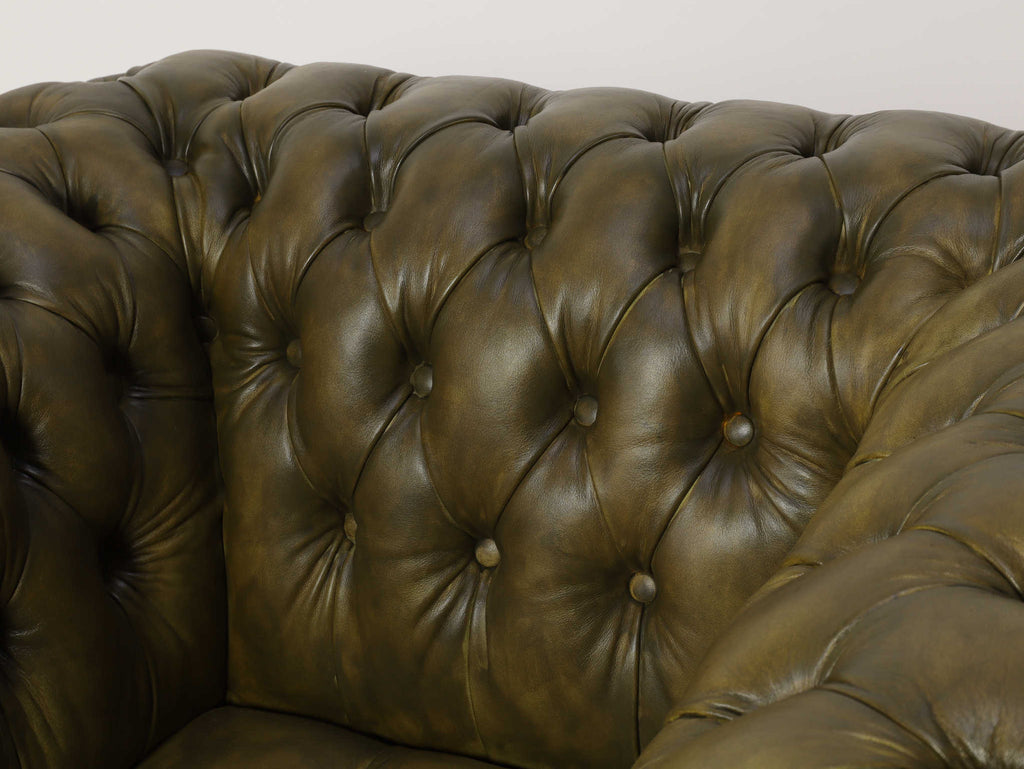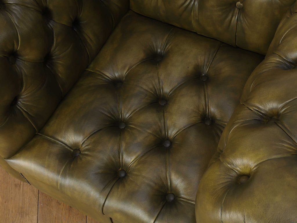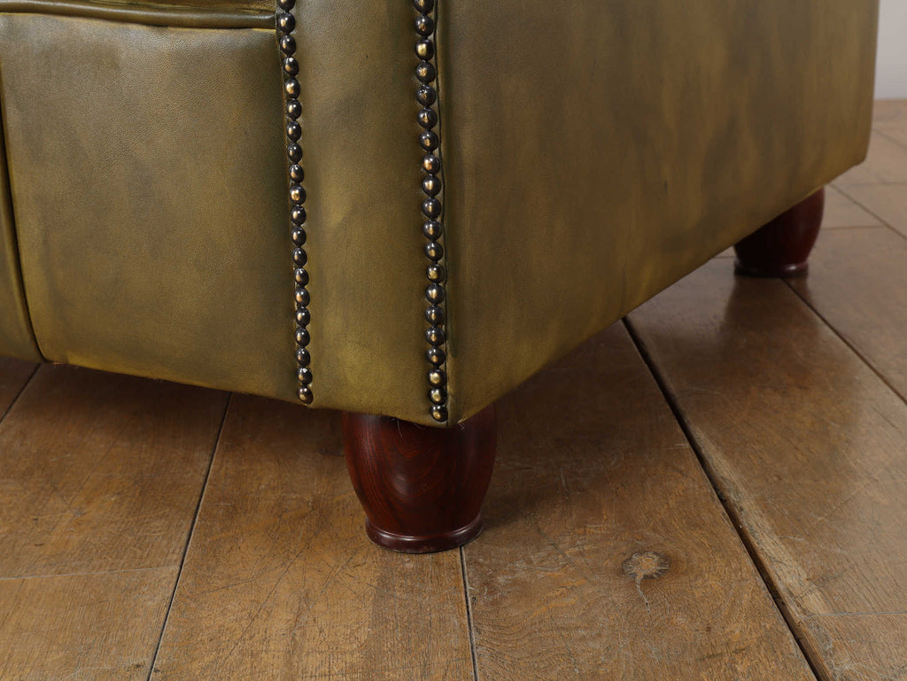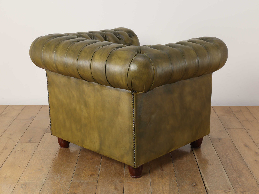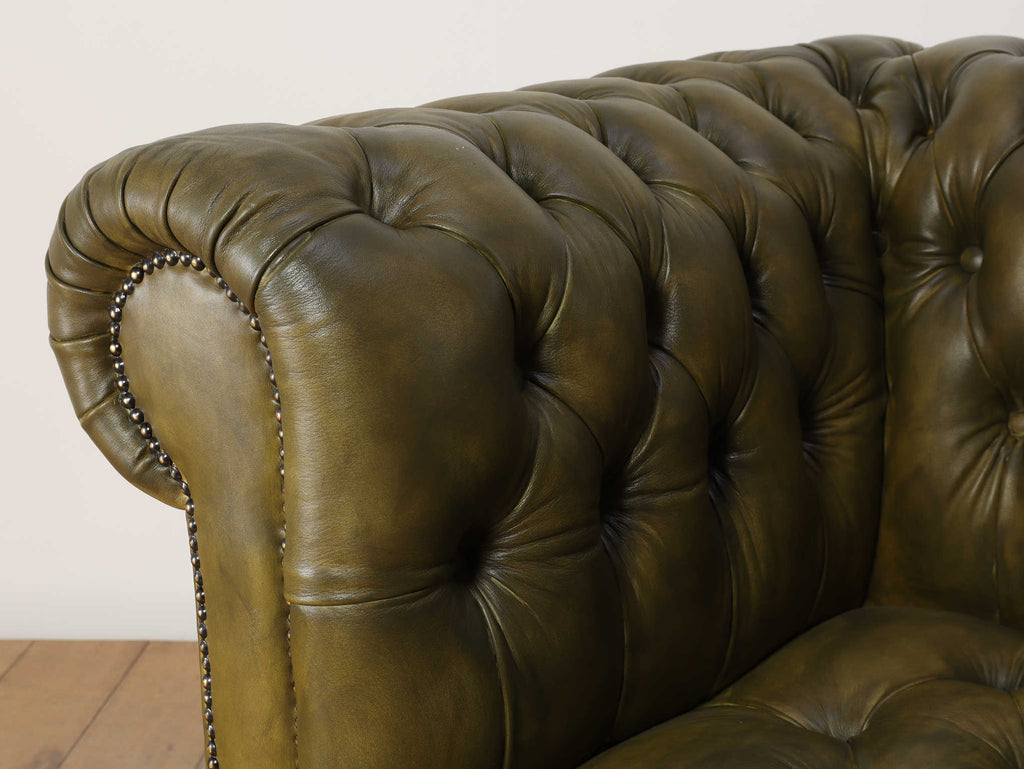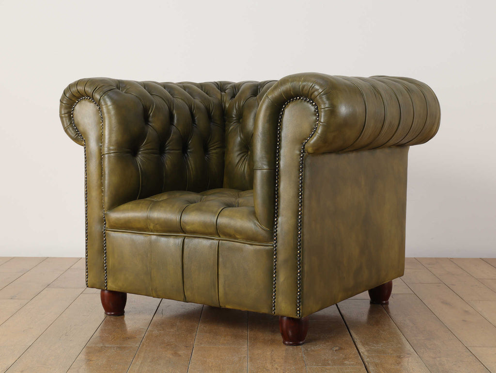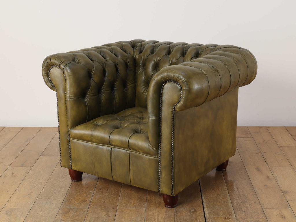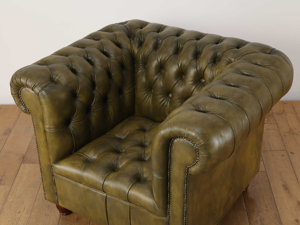重厚感と気品あふれるデザインからイギリスにおいて伝統的なジェントルマンズスタイルの象徴的なアイコンとして認知されているチェスターフィールドチェア。名前の由来は、このスタイルのソファを愛用していたチェスターフィールド伯爵にちなんでいます。こちらの商品は1970年頃のヴィンテージの個体を現地英国のクラフトマンが素材選びから選定し、鍛錬に仕上げたヴィンテージフレームニューレザーの本物の1品です。垢のブナ材を使用した堅牢なフレームに、経年変化をイメージしながら、本革を選定しました。背面、シート部のボタン締めは圧巻であり、熟練職人による手作業の証が伺えます。タイムレスな魅力を持つこの商品は、伝統的なインテリアはもちろんのこと、モダンな現代シーンにも素晴らしいコントラストを生み出すでしょう。カラーは深みのあるモスグリーン、オリーブになります。