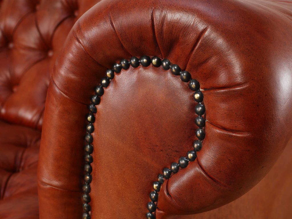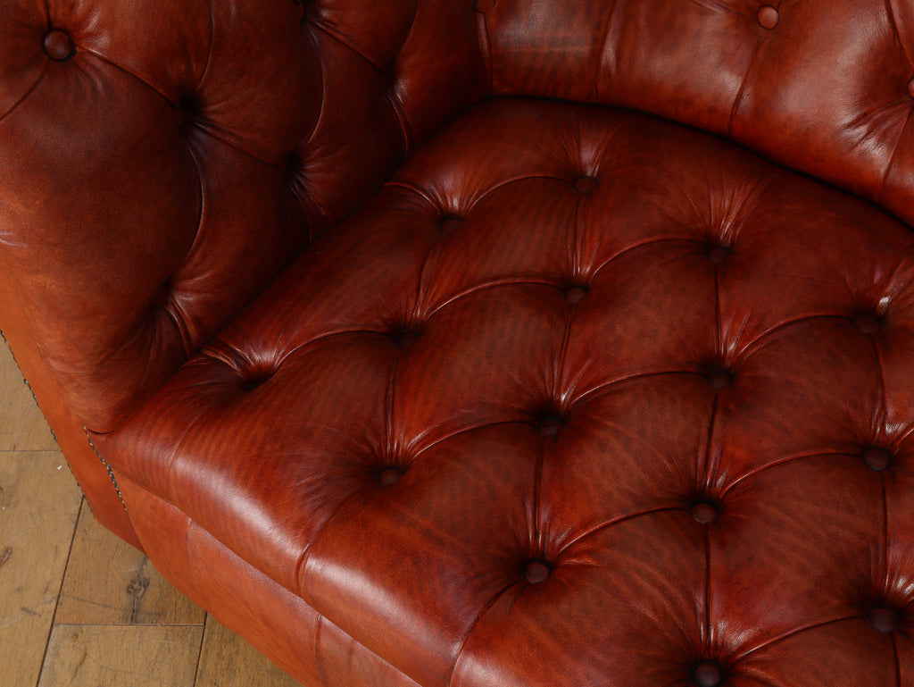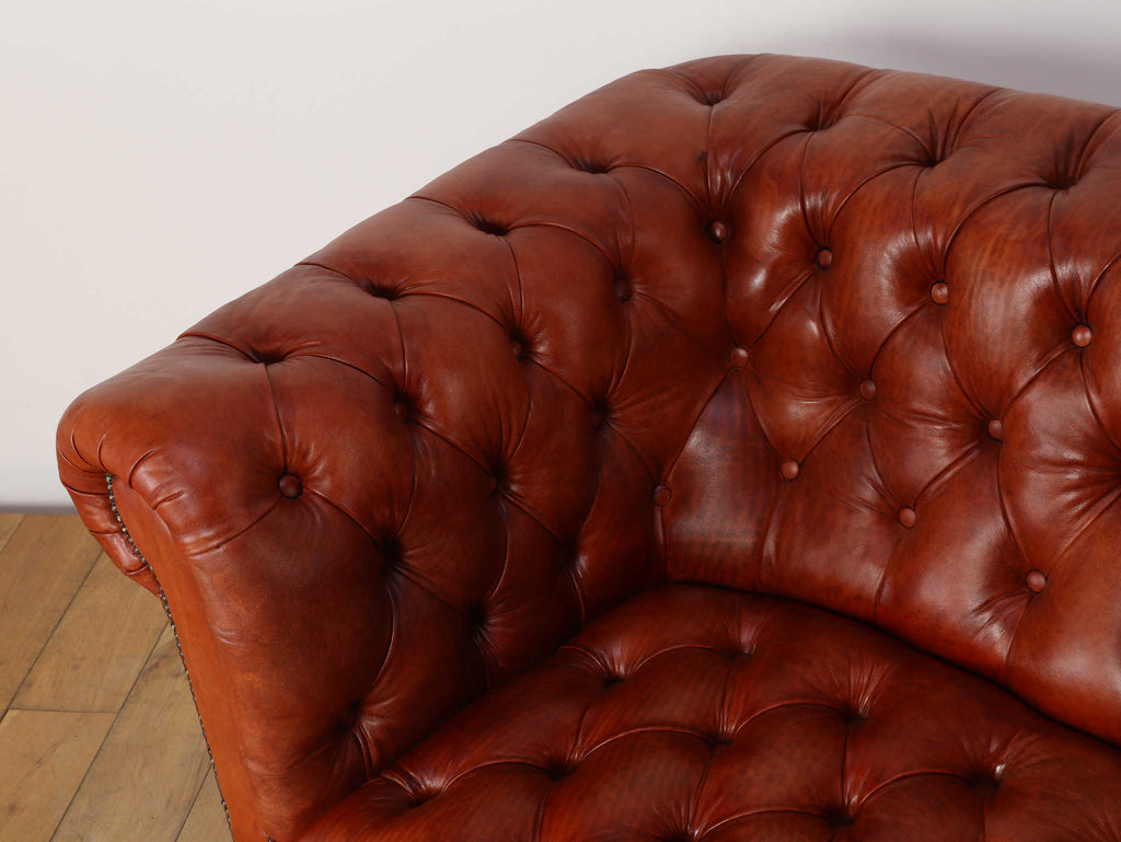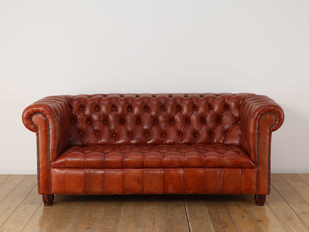 重厚感と気品あふれるデザインから、イギリスにおいて伝統的なジェントルマンズスタイルの象徴的なアイコンとして認知されているチェスターフィールドソファ。名前の由来は、このスタイルのソファを愛用していたチェスターフィールド伯爵にちなんでいます。こちらの商品は1970年頃のヴィンテージの個体を現地英国のクラフトマンが素材選びから選定し、鍛錬に仕上げたヴィンテージフレーム、ニューレザーの本物の1品です。垢のブナ材を使用した堅牢なフレームに、経年変化をイメージしながら、本革を選定しました。背面、シート部のボタン締めは圧巻であり、熟練職人による手作業の証が伺えます。タイムレスな魅力を持つこの商品は、伝統的なインテリアはもちろんのこと、モダンな現代シーンにも素晴らしいコントラストを生み出すでしょう。カラーはコニャックになります。