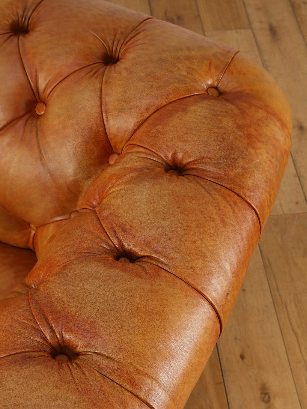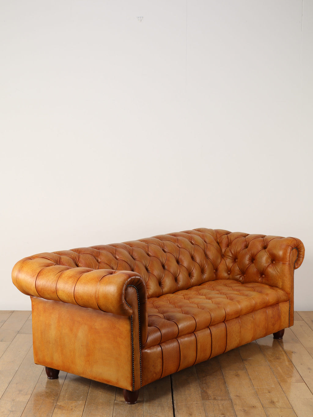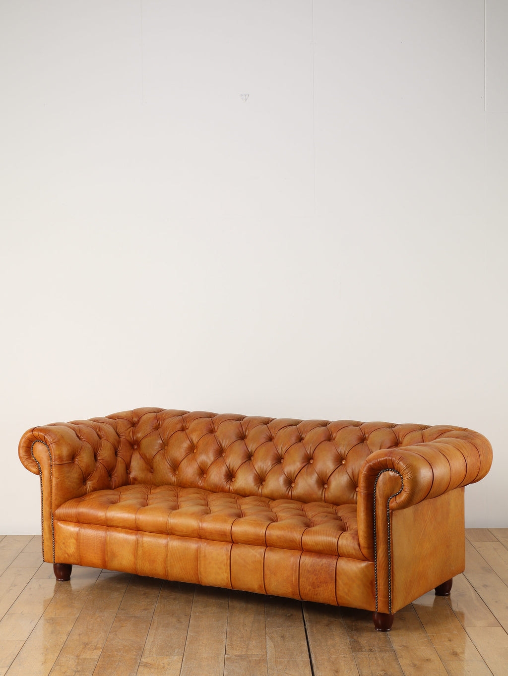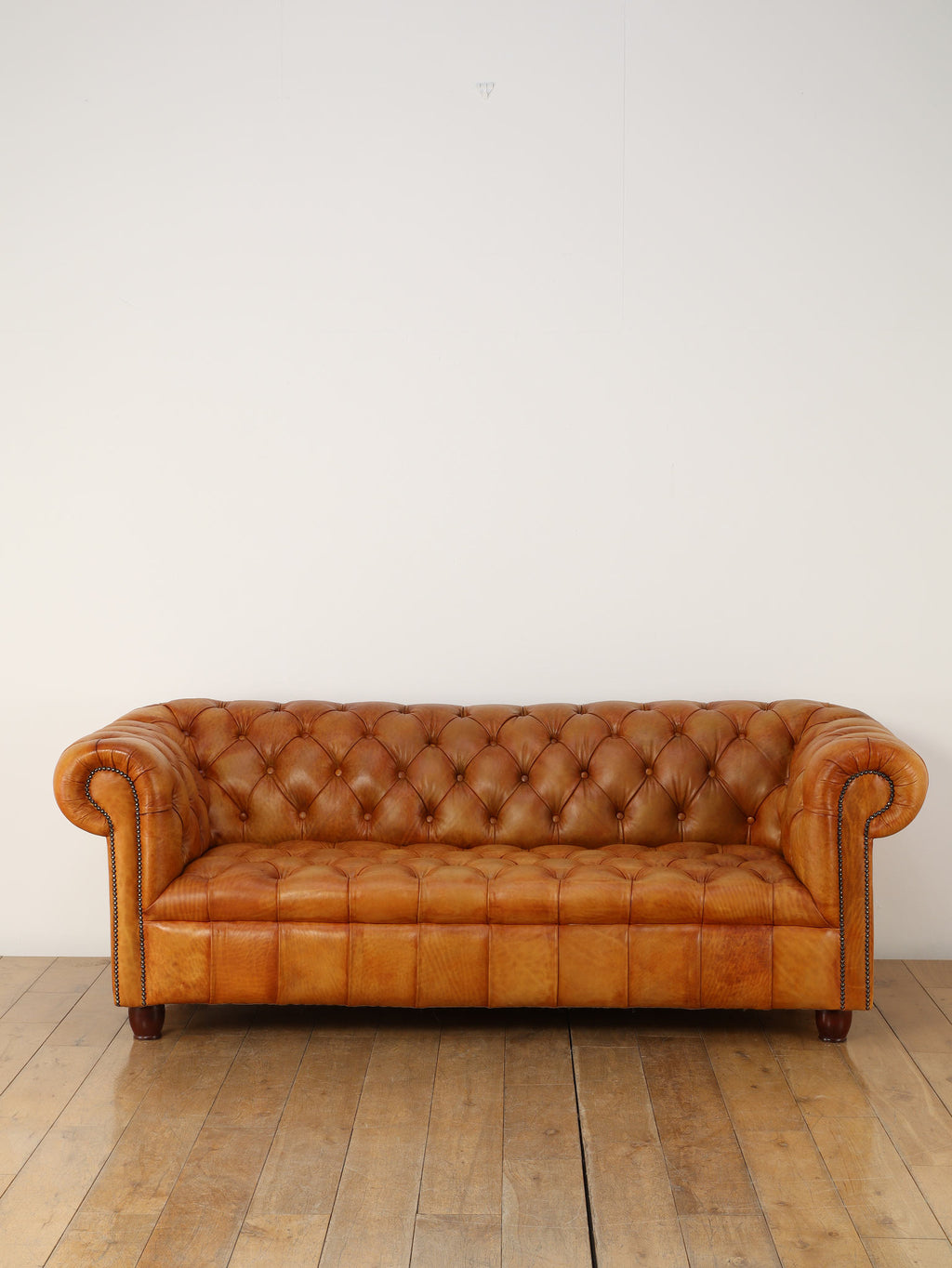 重厚感と気品あふれるデザインから、イギリスにおいて伝統的なジェントルマンズスタイルの象徴的なアイコンとして認知されているチェスターフィールドソファ。名前の由来は、このスタイルのソファを愛用していたチェスターフィールド伯爵にちなんでいます。こちらの商品は1970年頃のヴィンテージの個体を現地英国のクラフトマンが素材選びから選定し、鍛錬に仕上げたヴィンテージフレーム、ニューレザーの本物の1品です。垢のブナ材を使用した堅牢なフレームに、経年変化をイメージしながら、本革を選定しました。背面、シート部のボタン締めは圧巻であり、熟練職人による手作業の証が伺えます。タイムレスな魅力を持つこの商品は、伝統的なインテリアはもちろんのこと、モダンな現代シーンにも素晴らしいコントラストを生み出すでしょう。カラーはマスタードになります。