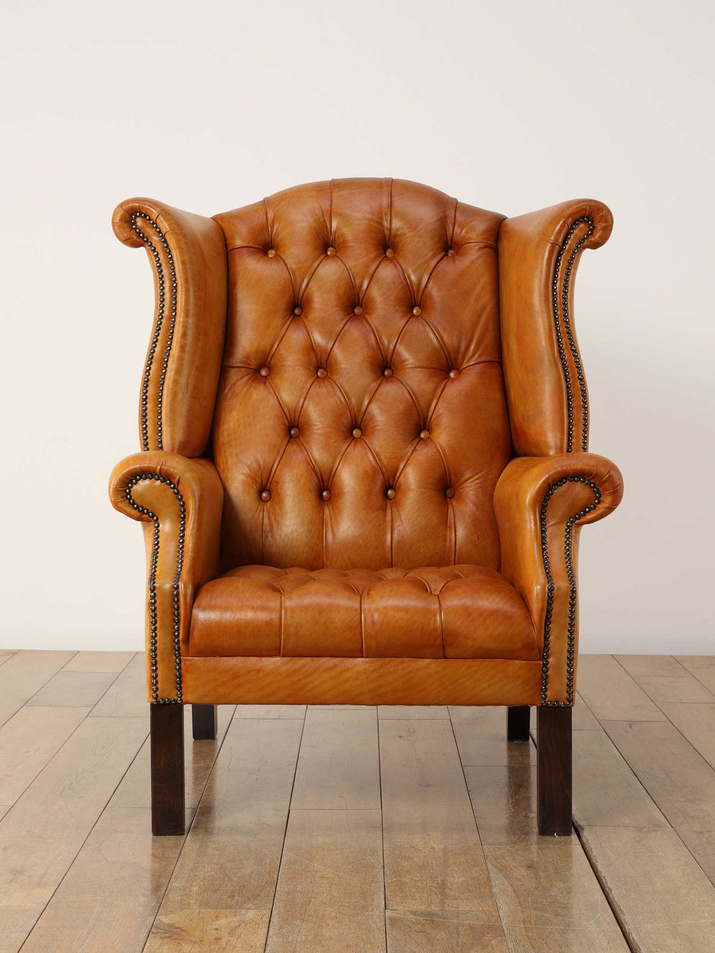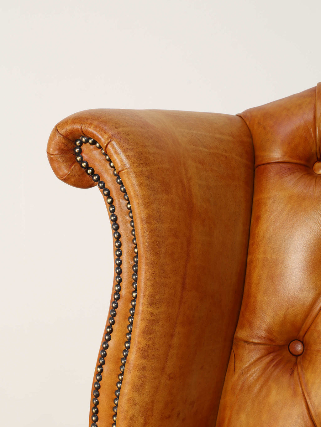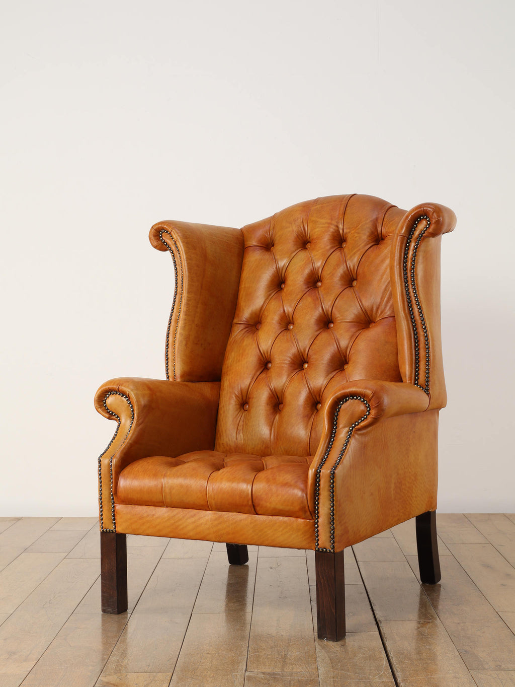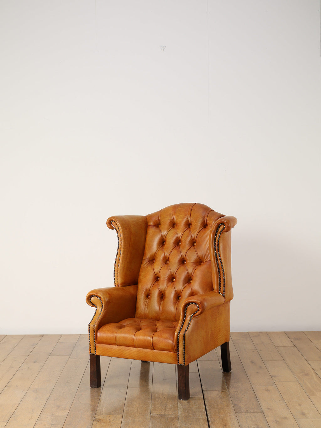 重厚感と気品あふれるデザインから、イギリスにおいて伝統的なジェントルマンズスタイルの象徴的なアイコンとして認知されているウイングチェア。暖炉のそばで紳士たちが座していた頃からの歴史を持つ、格式高いウィングバックスタイルです。頭部までしっかりと支え、座る人を優雅に包み込みます。こちらの商品は1970年頃のヴィンテージの個体を現地英国のクラフトマンが素材選びから選定し、鍛錬に仕上げたヴィンテージフレーム、ニューレザーの本物の1品です。垢のブナ材を使用した堅牢なフレームに、経年変化をイメージしながら、本革を選定しました。背面、シート部のボタン締めは圧巻であり、熟練職人による手作業の証が伺えます。タイムレスな魅力を持つこの商品は、伝統的なインテリアはもちろんのこと、モダンな現代シーンにも素晴らしいコントラストを生み出すでしょう。カラーはマスタードになります。※ハンドダイレザー仕上げの特性上、強くこすると色が落ち、色移りする可能性があります。